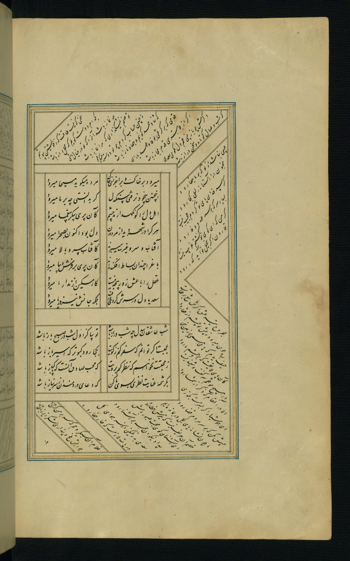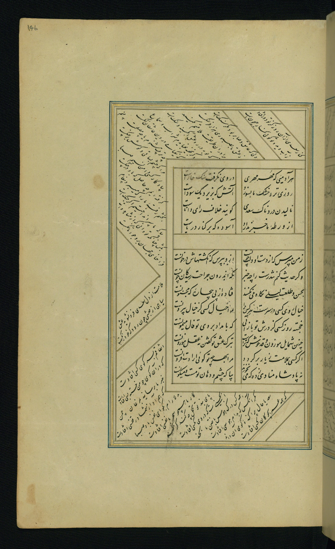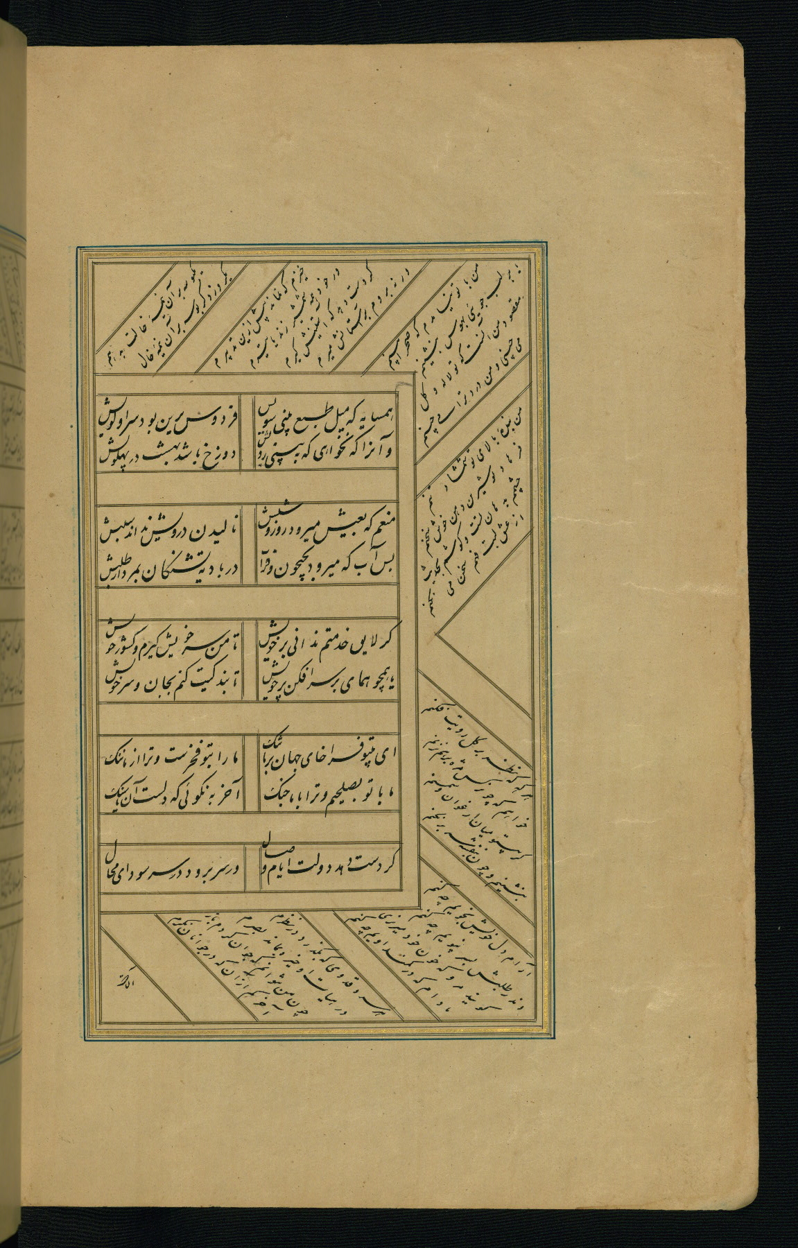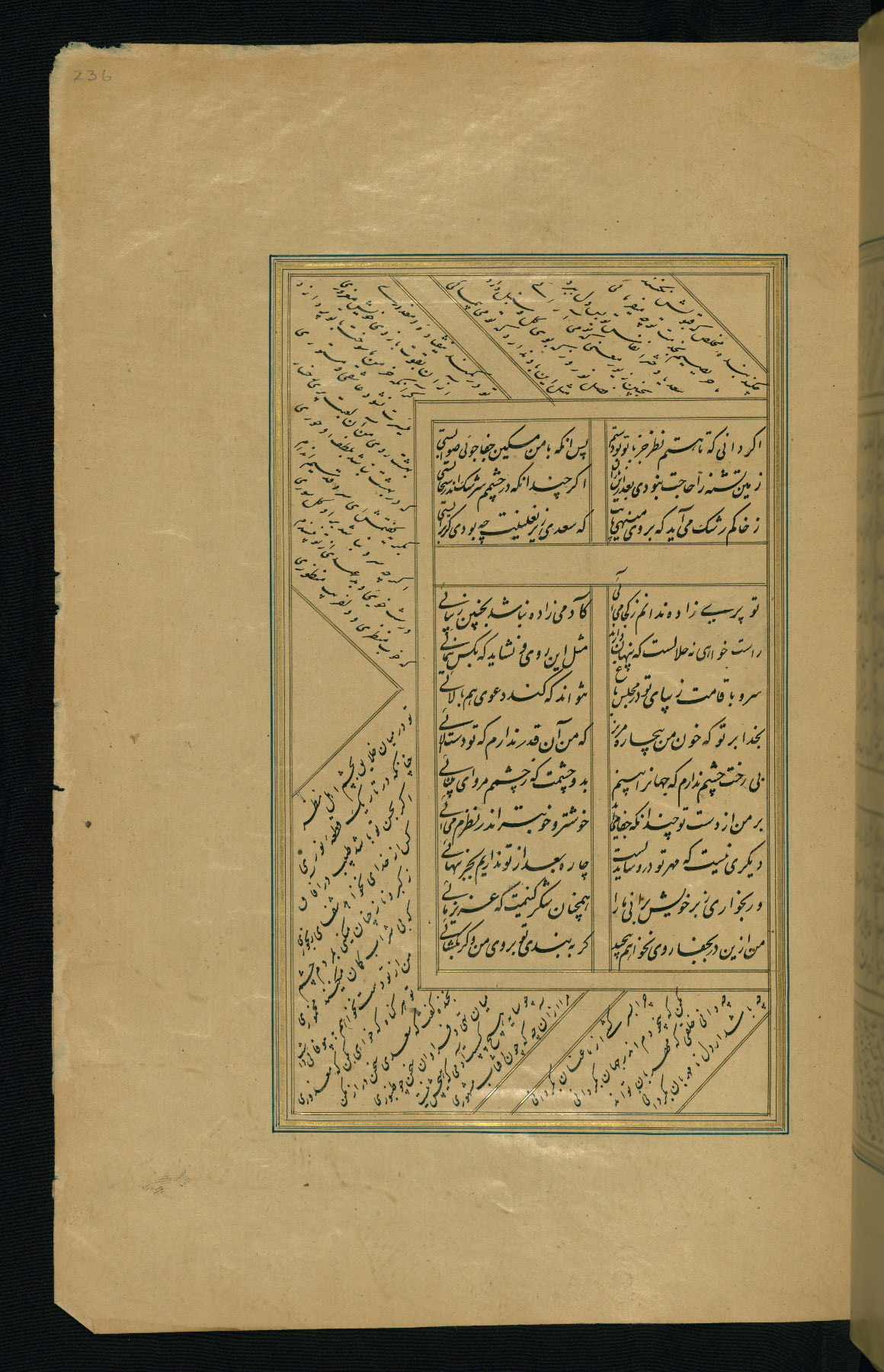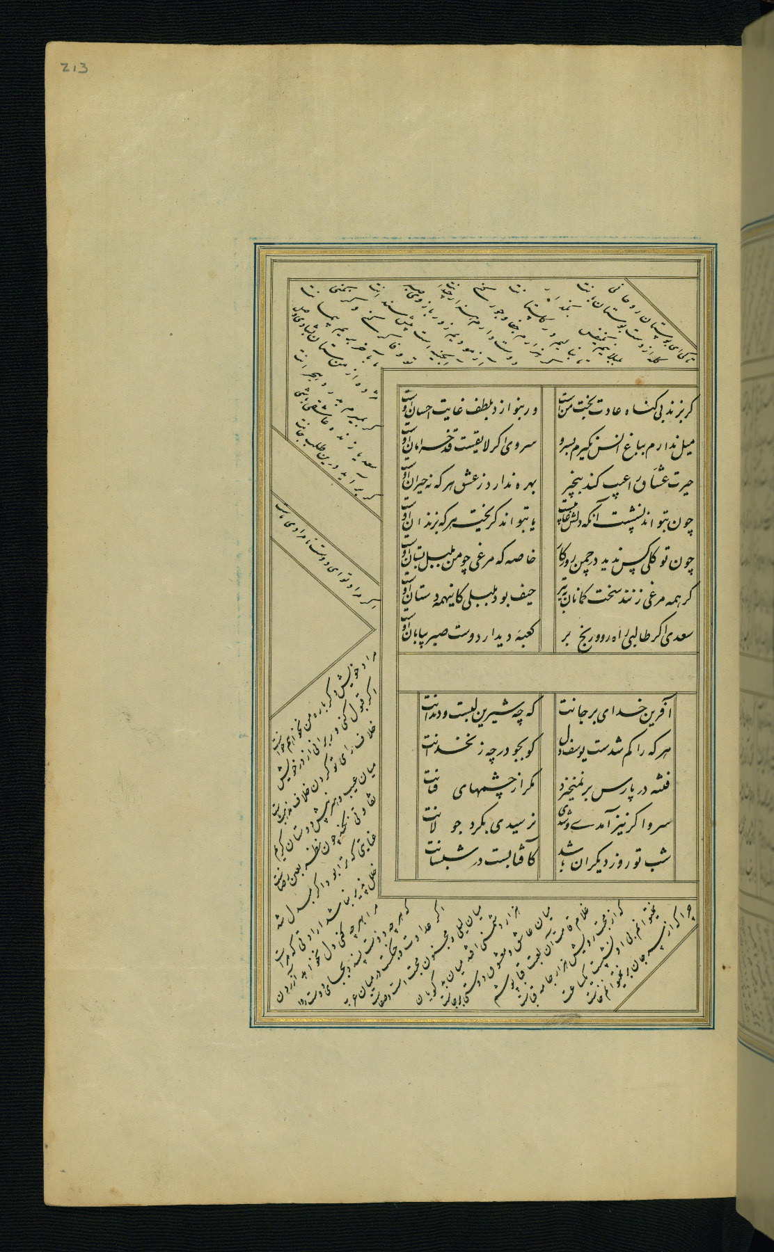 This is an illuminated and illustrated Safavid copy of the collected works (Kulliyāt) of Saʿdī (d. 691 AH / 1292 CE). It was written by ʿAbd Allāh ibn Shaykh Murshid al-Kātib in the tenth century AH / sixteenth CE. The manuscript opens with an illuminated medallion (fol. 2a), followed by a double-page illustrated frontispeice (fols. 2b-3a) and a double-page illuminated frontispiece (fols. 3b-4a). The text is illustrated with seven additional paintings (fols. 18a, 31b, 49b, 70b, 88a, 101a, and 106b). The brown leather binding is incorrectly bound with the flap appearing on the right side instead of the left.