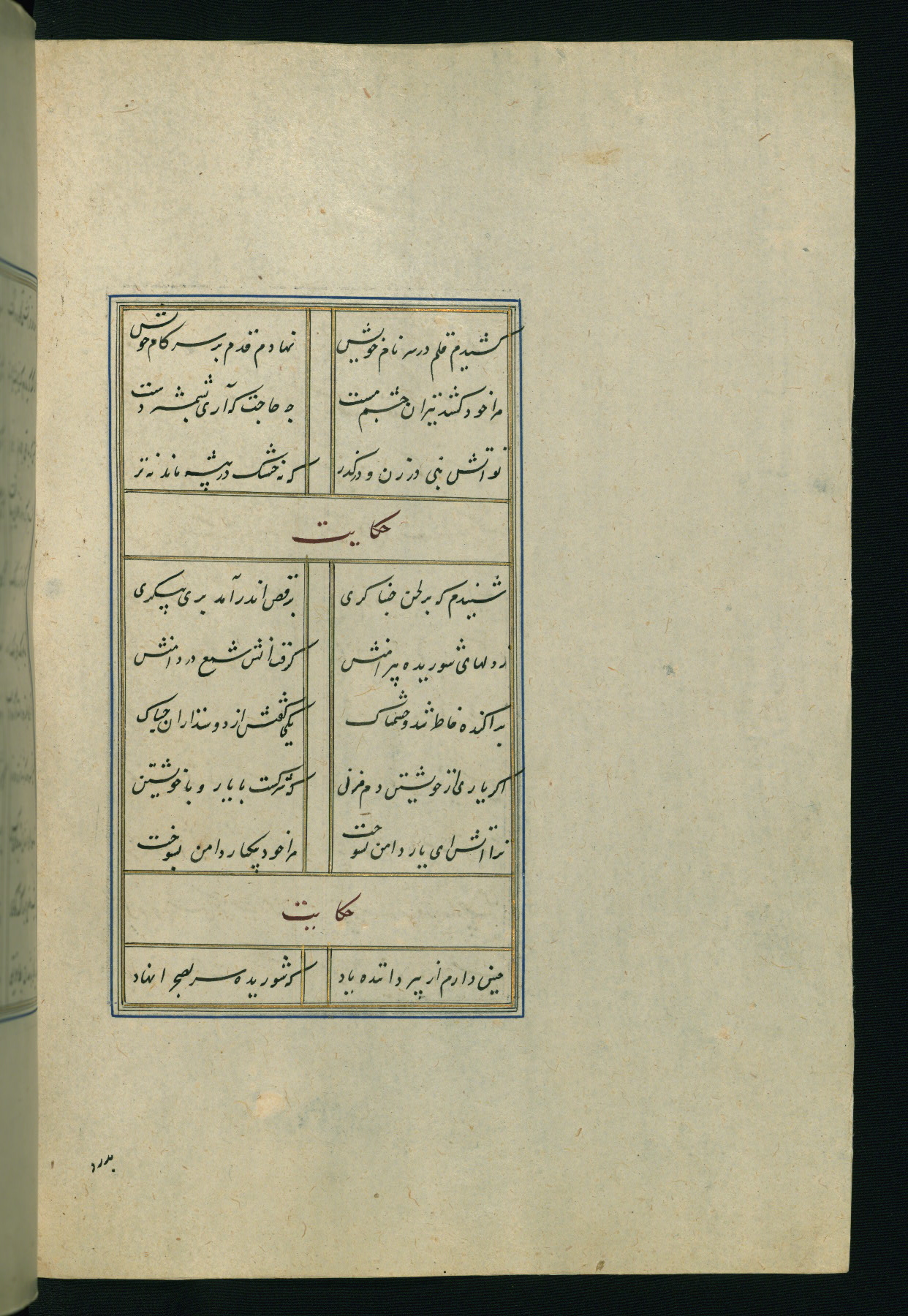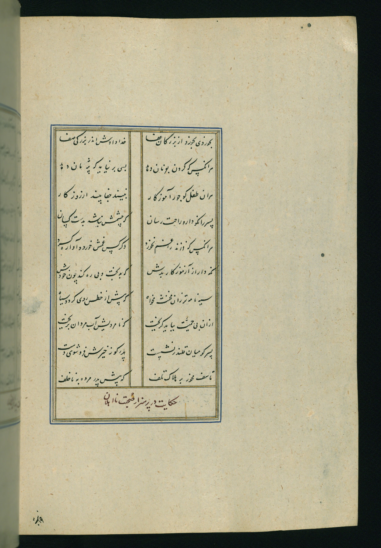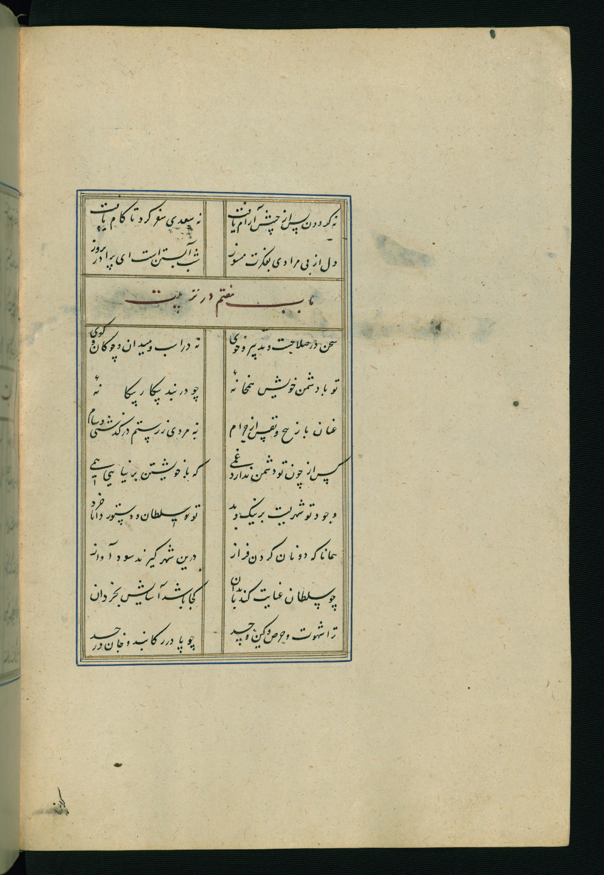This is an illuminated and illustrated Safavid copy of the Būstān (The garden or The orchard), composed by Sa’dī (d. 691 AH / 1292 CE). It was written in black nasta’līq script in the ninth century AH / sixteenth CE in Iran. The codex opens with a frontispiece with the title Kitāb-i būstān inscribed in an illuminated medallion (fol. 1a), followed by a double-page illustration of a banquet scene in a landscape (fols. 1b-2a). Additionally, there are five paintings illustrating the text (fols. 25a, 55b, 58a, 93b, and 119b). The brown leather, blind-stamped binding decorated with a central oval and pendants is not contemporary with the manuscript.