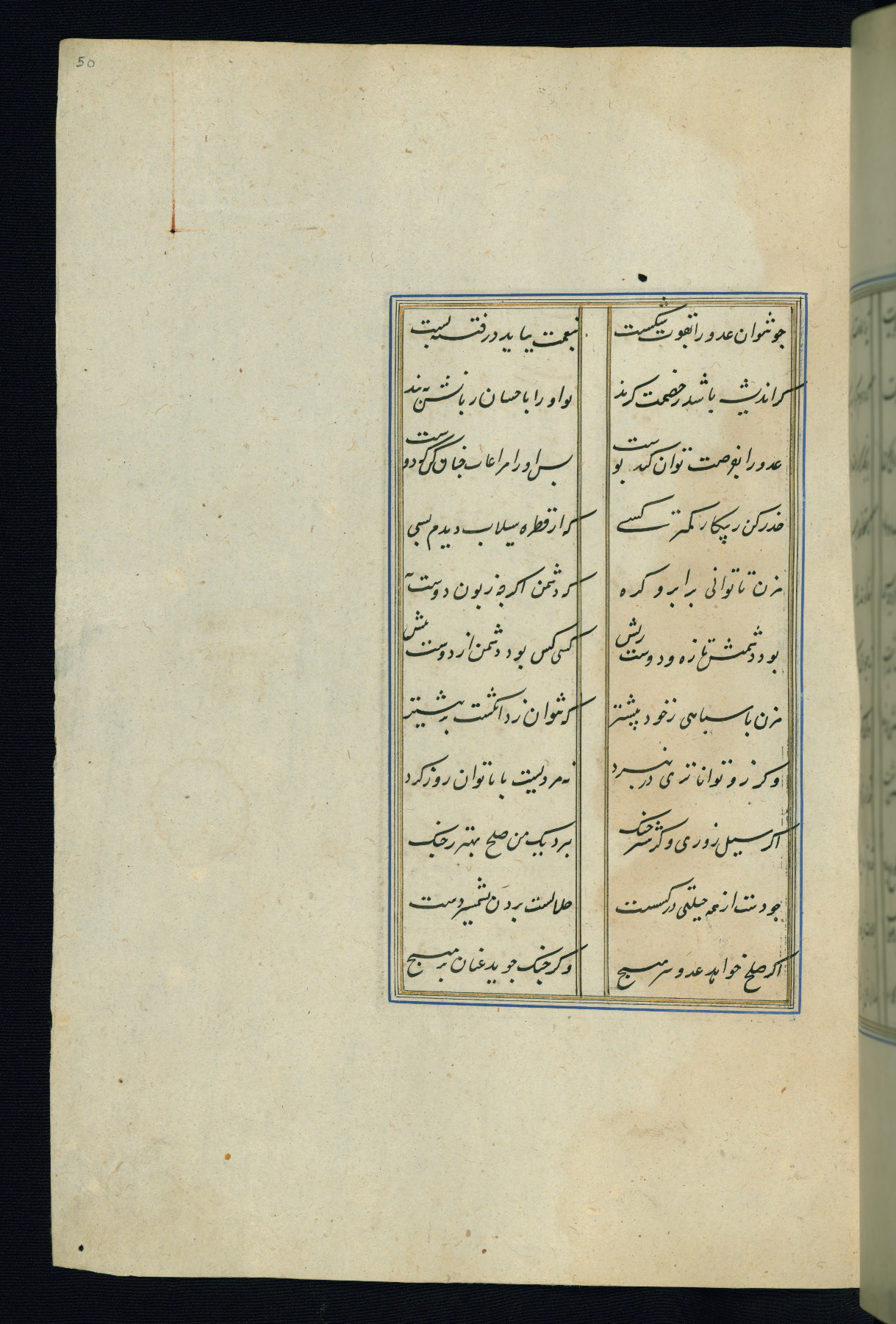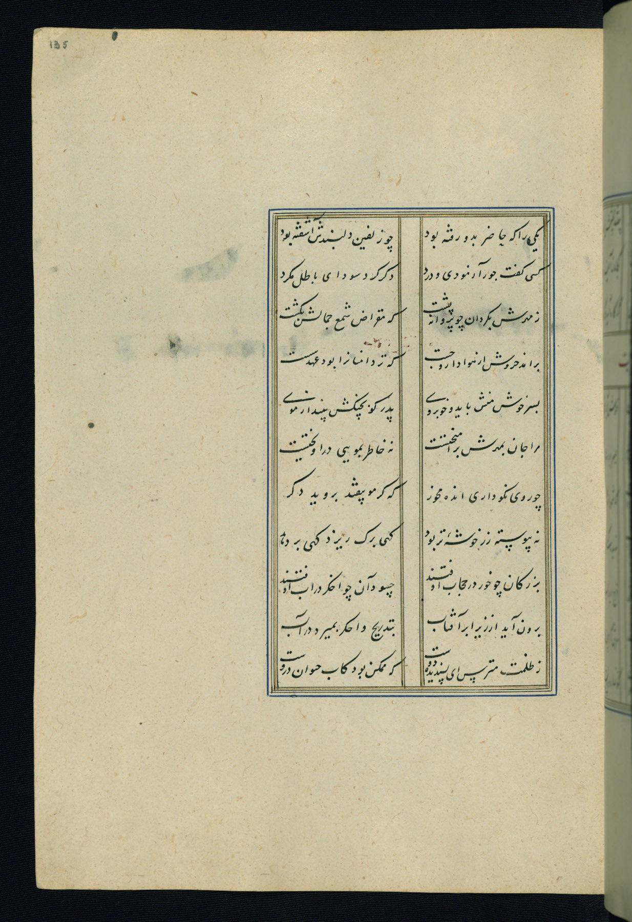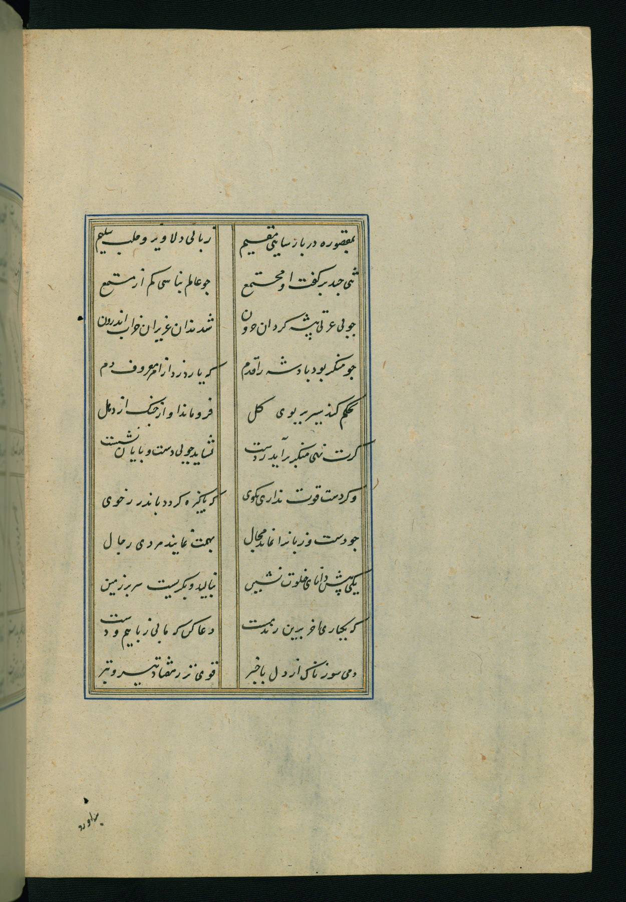 This is an illuminated and illustrated Safavid copy of the Būstān (The garden or The orchard), composed by Sa’dī (d. 691 AH / 1292 CE). It was written in black nasta’līq script in the ninth century AH / sixteenth CE in Iran. The codex opens with a frontispiece with the title Kitāb-i būstān inscribed in an illuminated medallion (fol. 1a), followed by a double-page illustration of a banquet scene in a landscape (fols. 1b-2a). Additionally, there are five paintings illustrating the text (fols. 25a, 55b, 58a, 93b, and 119b). The brown leather, blind-stamped binding decorated with a central oval and pendants is not contemporary with the manuscript.