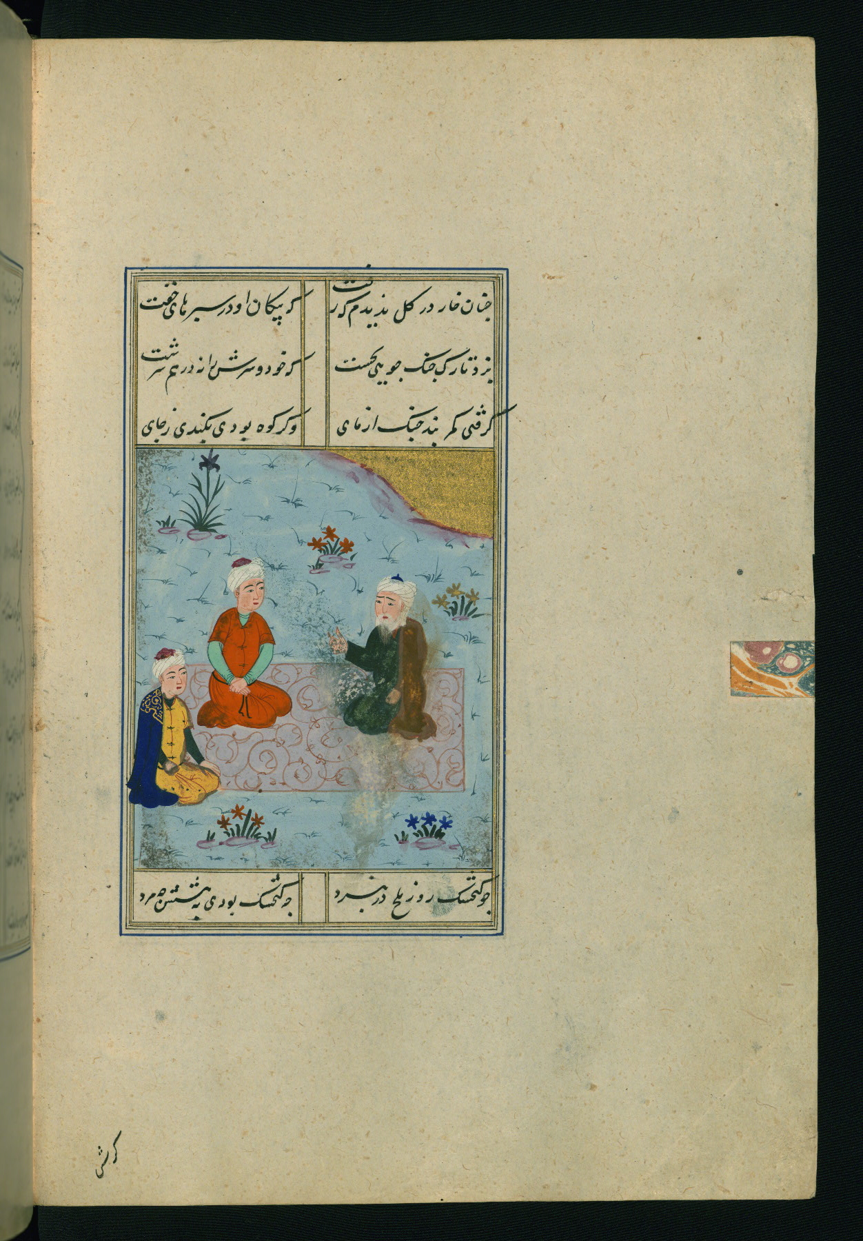 - Decoration note: Five illustrations (fols. 25a, 55b, 58a, 93b, and 119b); illuminated frontispiece with the title Kitāb-i būstān inscribed in the medallion (fol. 1a); double-page illustrated frontispiece (fols. 1b-2a); double-page illuminated incipit (fols. 2b-3a); framing lines in blue, black, and gold