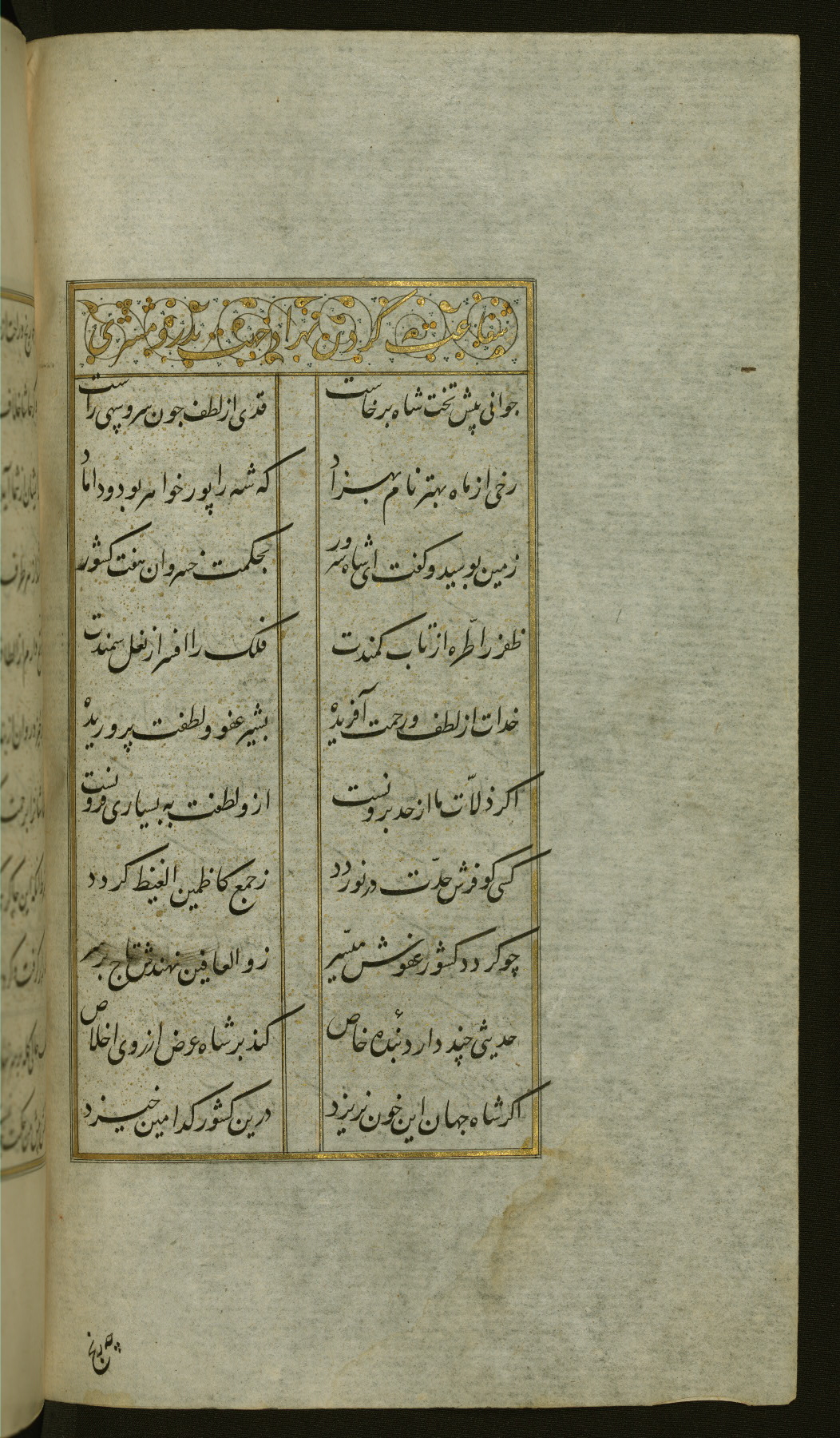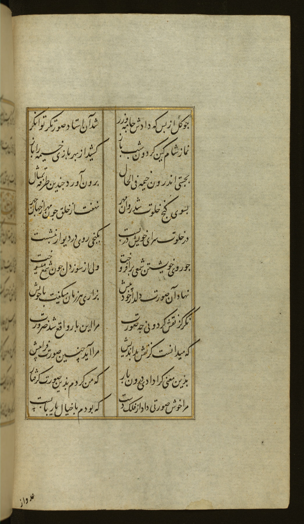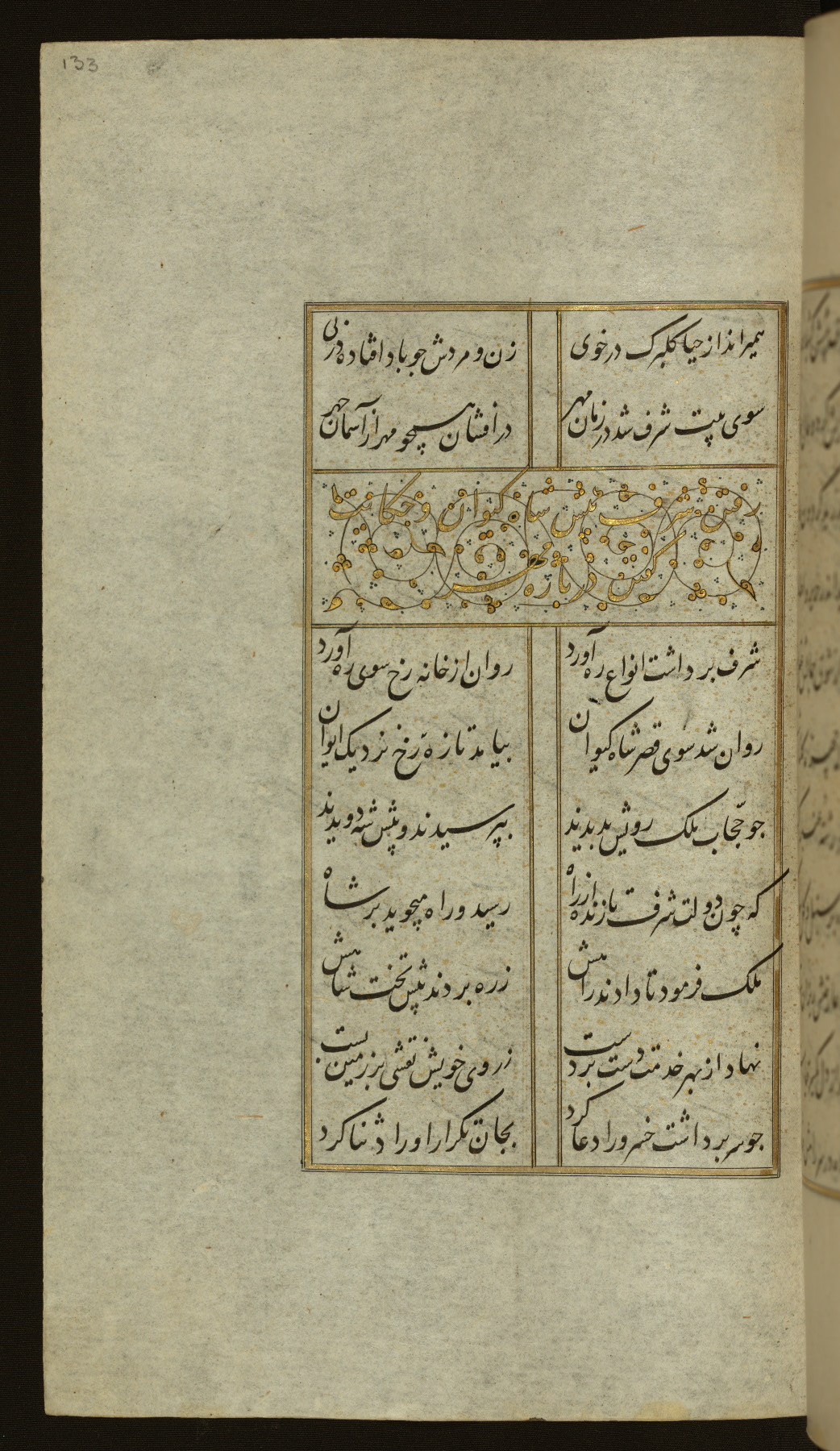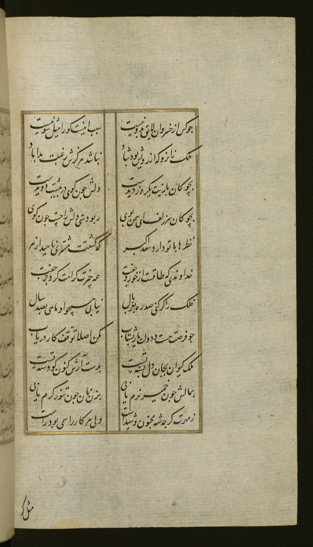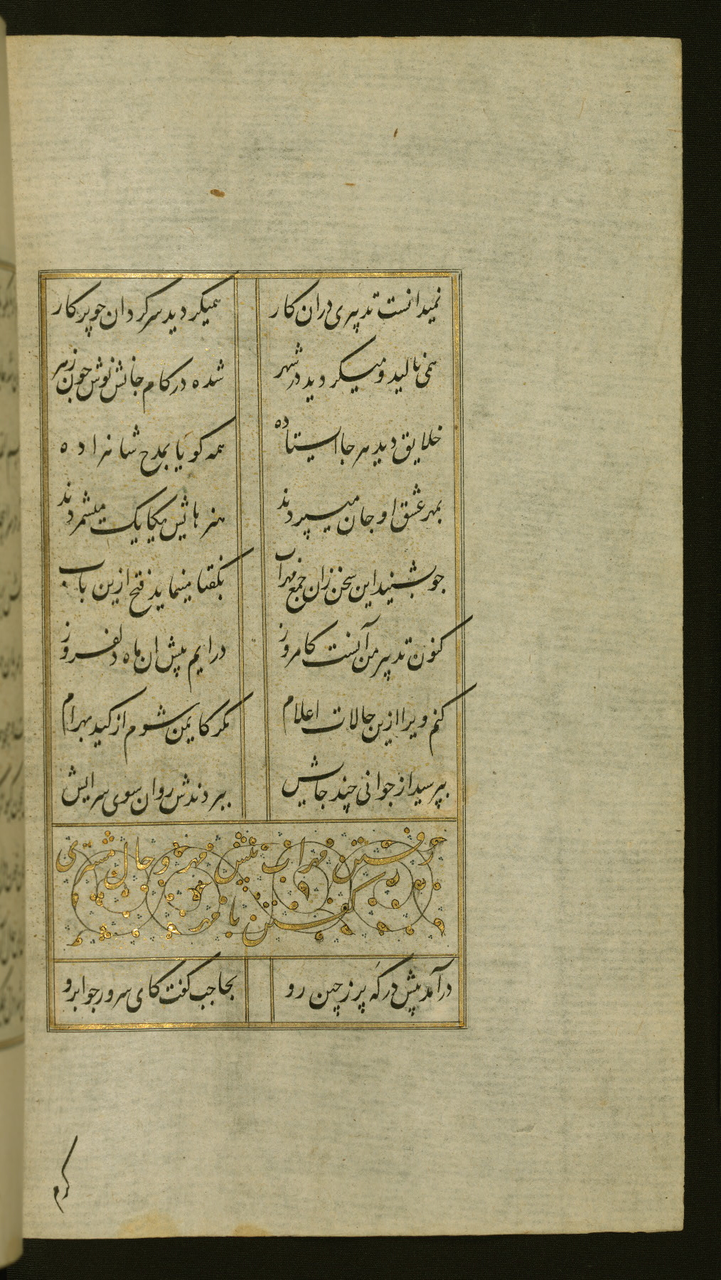 This manuscript is an illustrated copy of the well-known poem recounting the platonic love story between Mihr (the Sun), the son of Shāhpūr, and his vizier's son Mushtarī (Jupiter). The story of 90 chapters was composed by Muḥammad ibn Aḥmad ‘Aṣṣār Tabrīzī (d. 784 AH / 1382 CE). The present copy was written in nasta‘līq script by Murshid al-Kātib in 881 AH / 1476 CE. Considering the number of surviving manuscripts in which this calligrapher’s name is found, it seems he was particularly prolific. The present codex is illustrated with nine paintings. The gold-brushed leather binding with doublures of red leather decorated with filigree work is original to the manuscript.