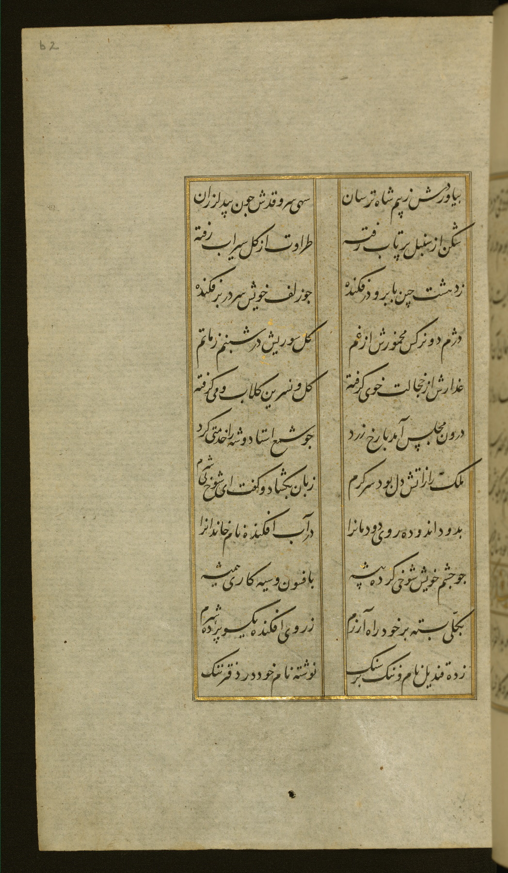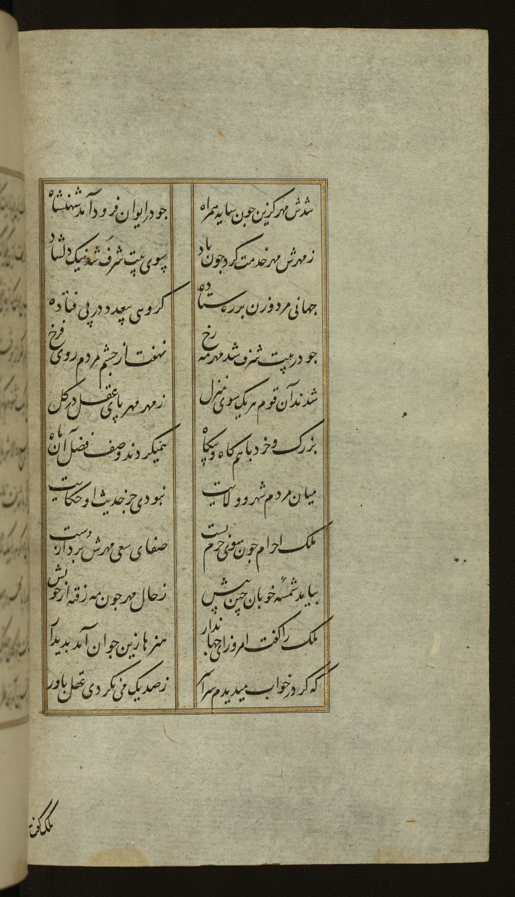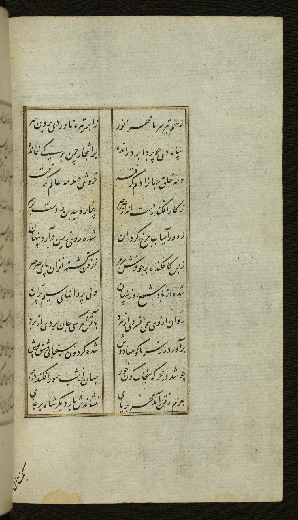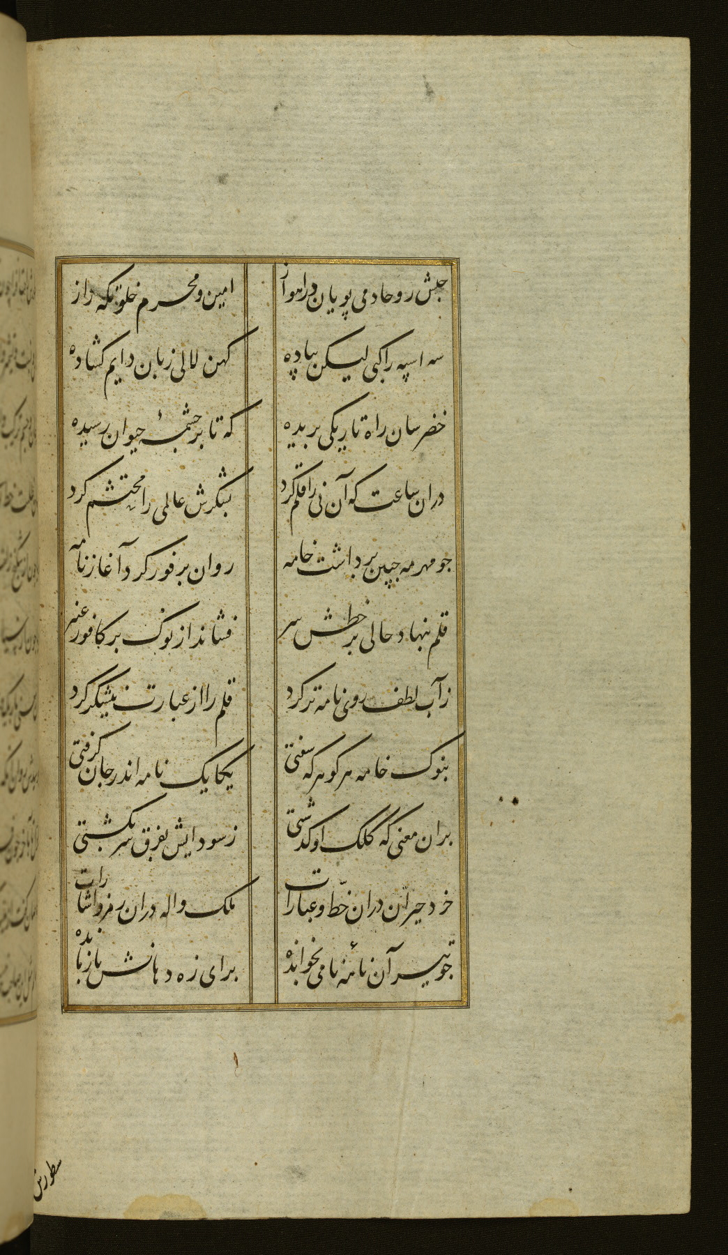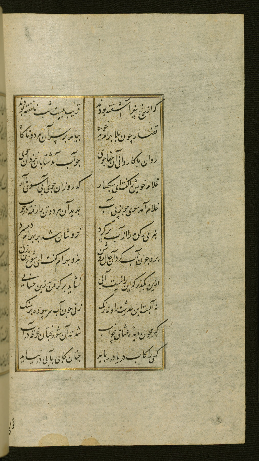 This manuscript is an illustrated copy of the well-known poem recounting the platonic love story between Mihr (the Sun), the son of Shāhpūr, and his vizier's son Mushtarī (Jupiter). The story of 90 chapters was composed by Muḥammad ibn Aḥmad ‘Aṣṣār Tabrīzī (d. 784 AH / 1382 CE). The present copy was written in nasta‘līq script by Murshid al-Kātib in 881 AH / 1476 CE. Considering the number of surviving manuscripts in which this calligrapher’s name is found, it seems he was particularly prolific. The present codex is illustrated with nine paintings. The gold-brushed leather binding with doublures of red leather decorated with filigree work is original to the manuscript.