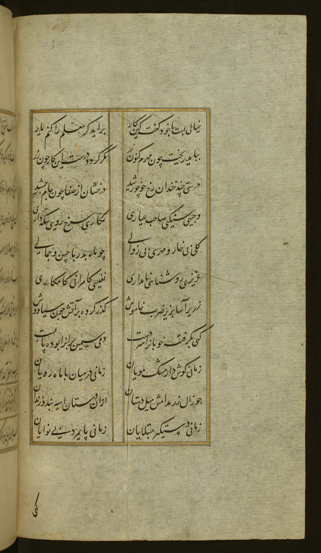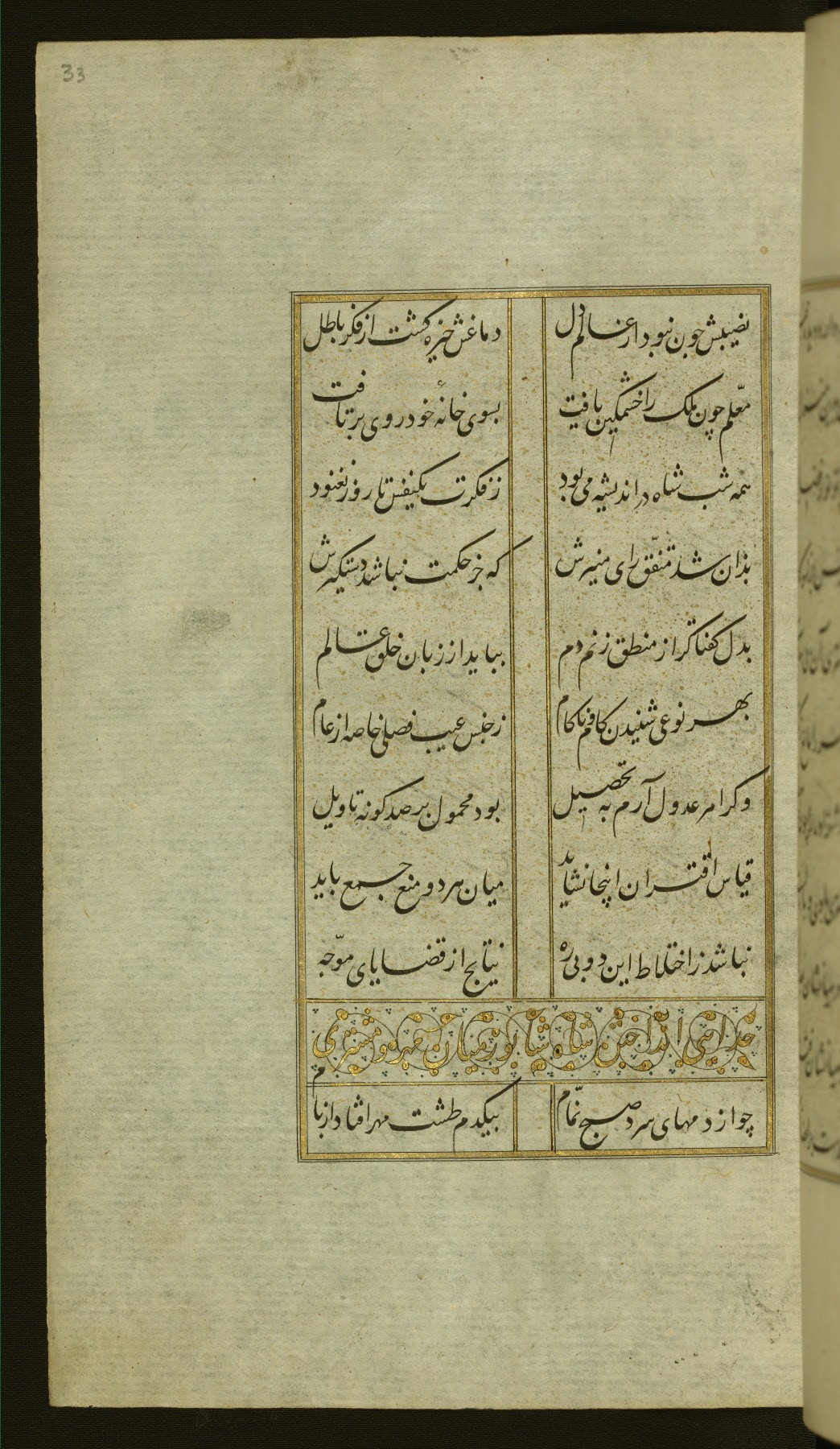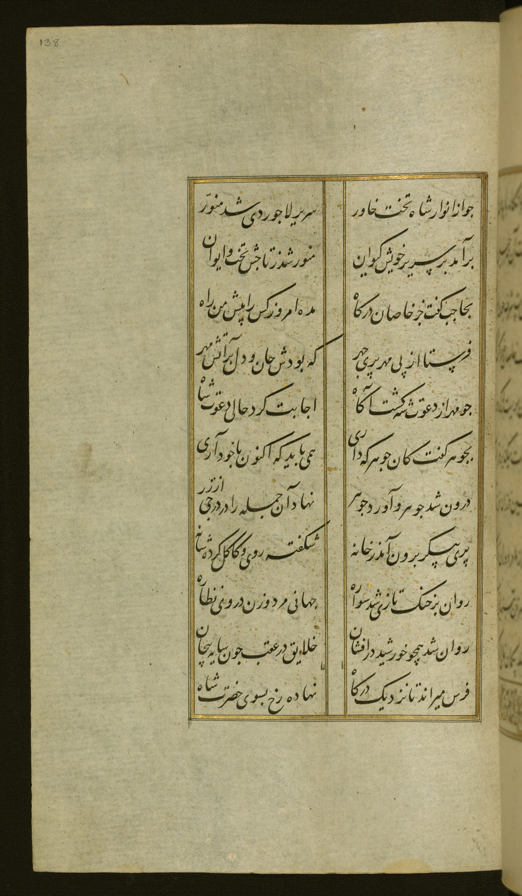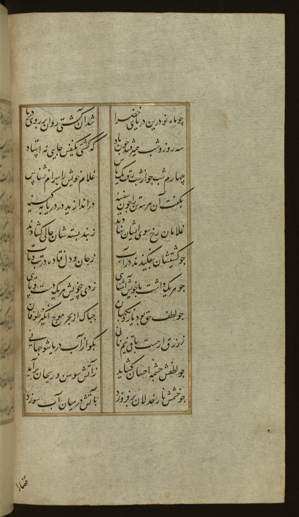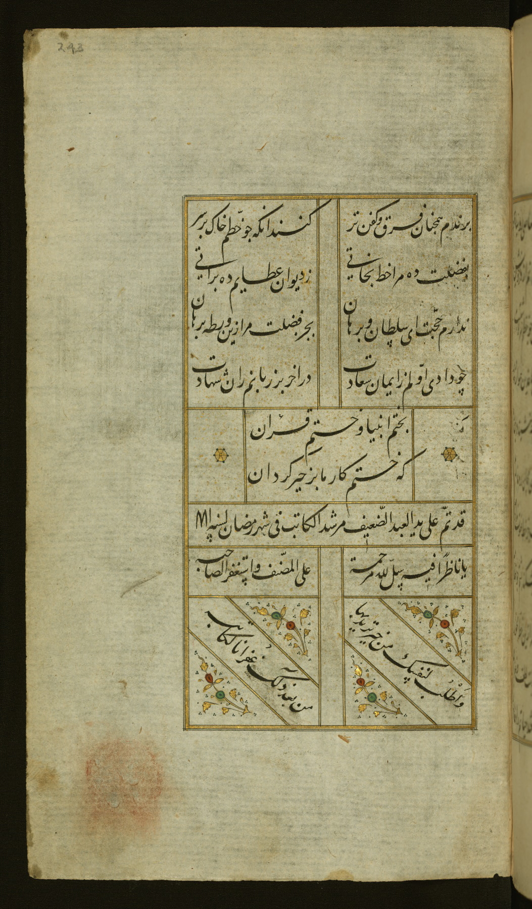 This manuscript is an illustrated copy of the well-known poem recounting the platonic love story between Mihr (the Sun), the son of Shāhpūr, and his vizier's son Mushtarī (Jupiter). The story of 90 chapters was composed by Muḥammad ibn Aḥmad ‘Aṣṣār Tabrīzī (d. 784 AH / 1382 CE). The present copy was written in nasta‘līq script by Murshid al-Kātib in 881 AH / 1476 CE. Considering the number of surviving manuscripts in which this calligrapher’s name is found, it seems he was particularly prolific. The present codex is illustrated with nine paintings. The gold-brushed leather binding with doublures of red leather decorated with filigree work is original to the manuscript.