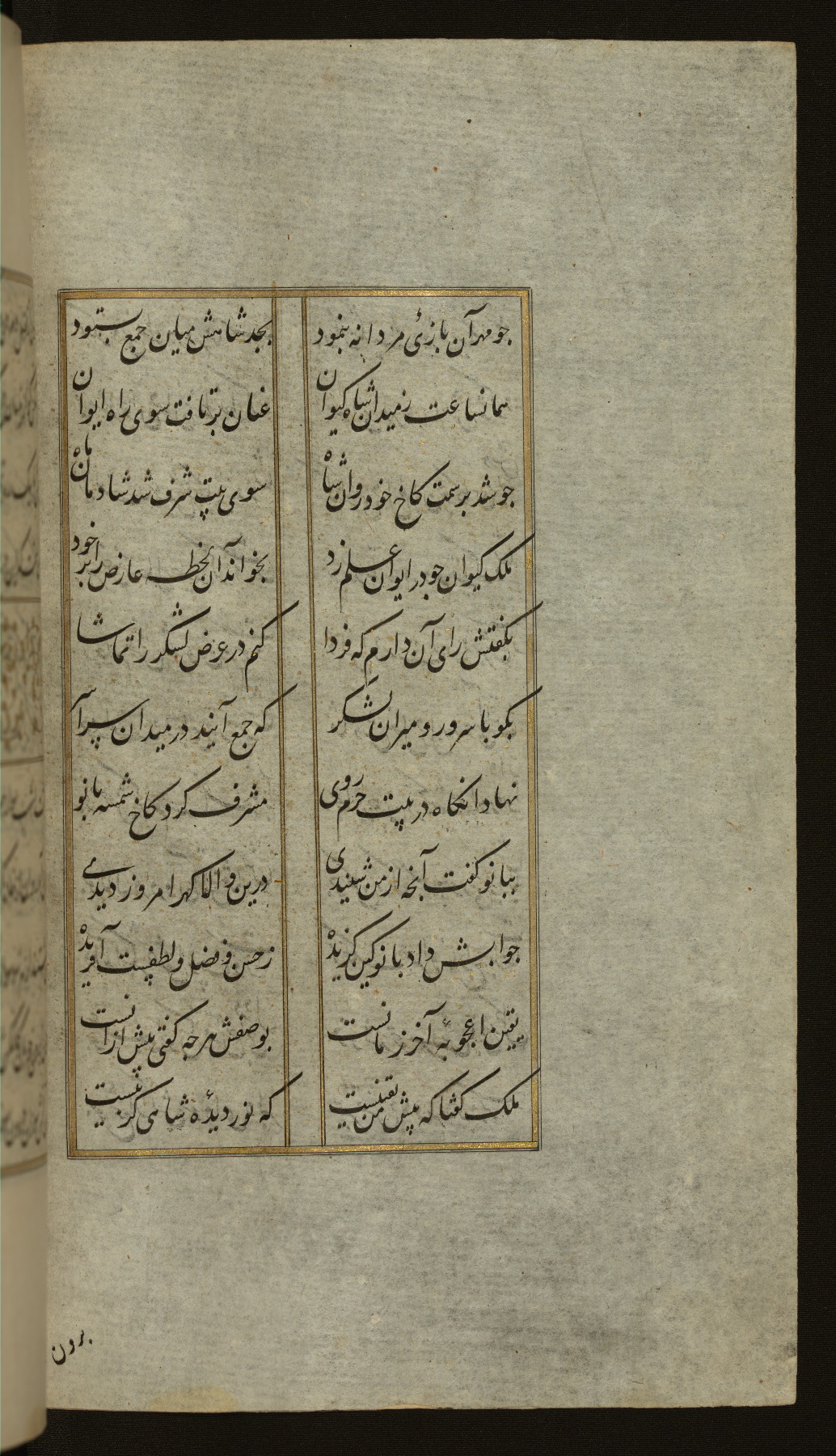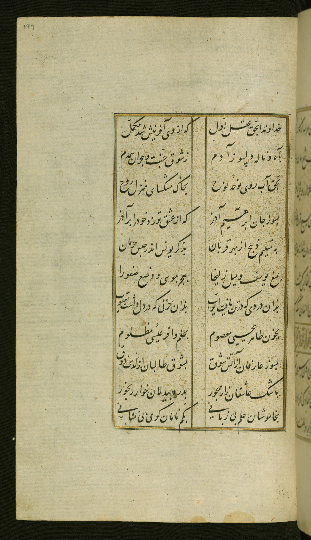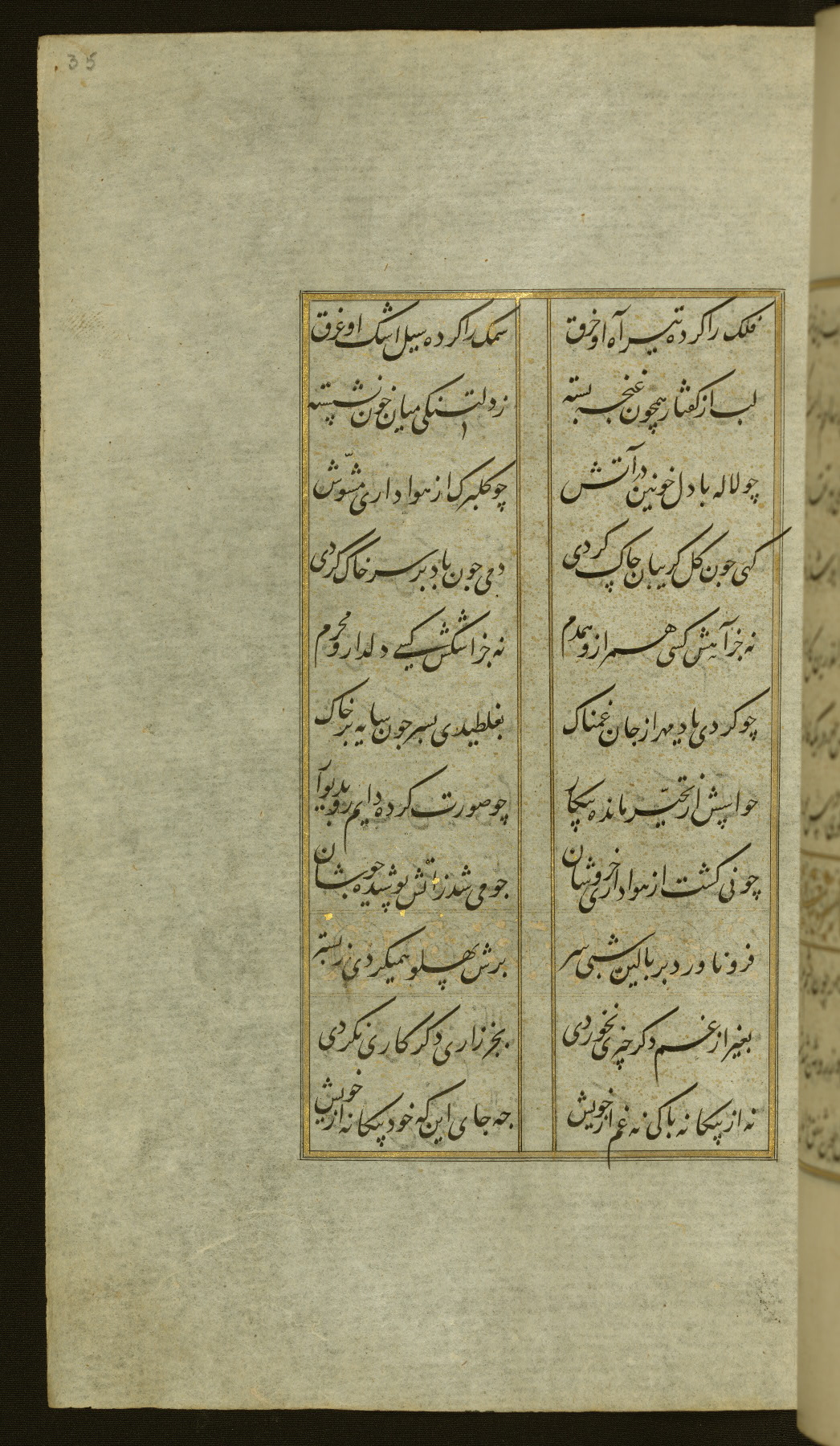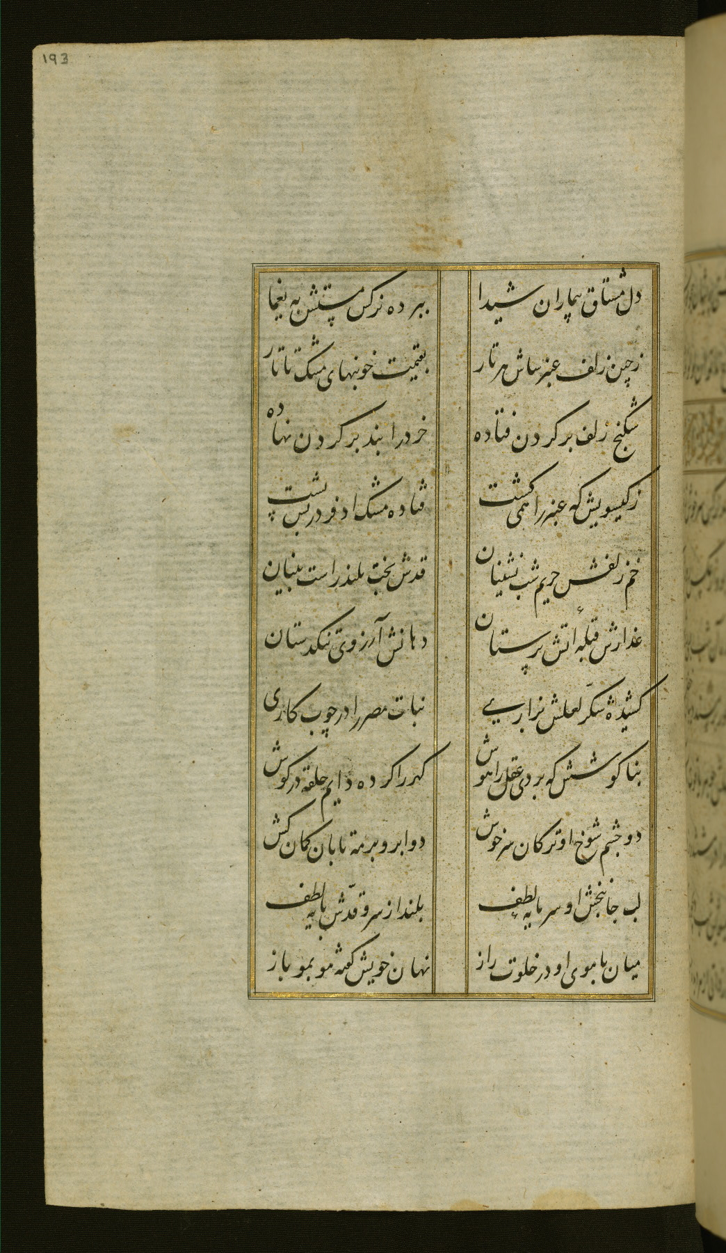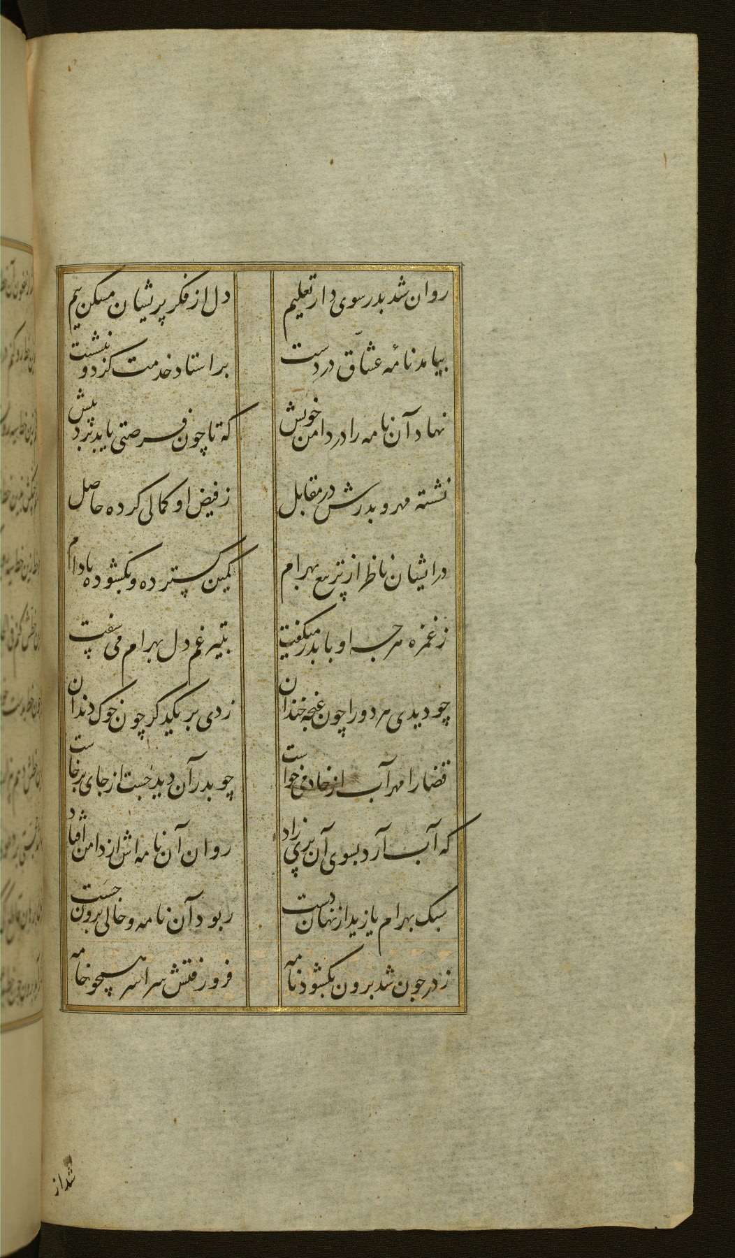 This manuscript is an illustrated copy of the well-known poem recounting the platonic love story between Mihr (the Sun), the son of Shāhpūr, and his vizier's son Mushtarī (Jupiter). The story of 90 chapters was composed by Muḥammad ibn Aḥmad ‘Aṣṣār Tabrīzī (d. 784 AH / 1382 CE). The present copy was written in nasta‘līq script by Murshid al-Kātib in 881 AH / 1476 CE. Considering the number of surviving manuscripts in which this calligrapher’s name is found, it seems he was particularly prolific. The present codex is illustrated with nine paintings. The gold-brushed leather binding with doublures of red leather decorated with filigree work is original to the manuscript.