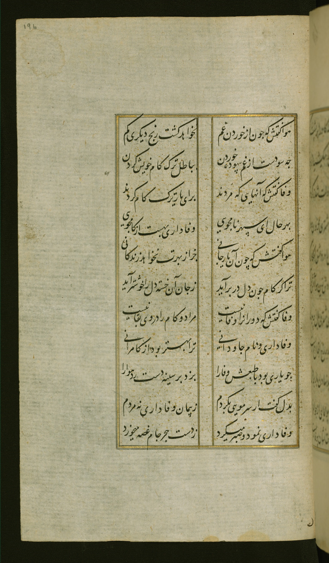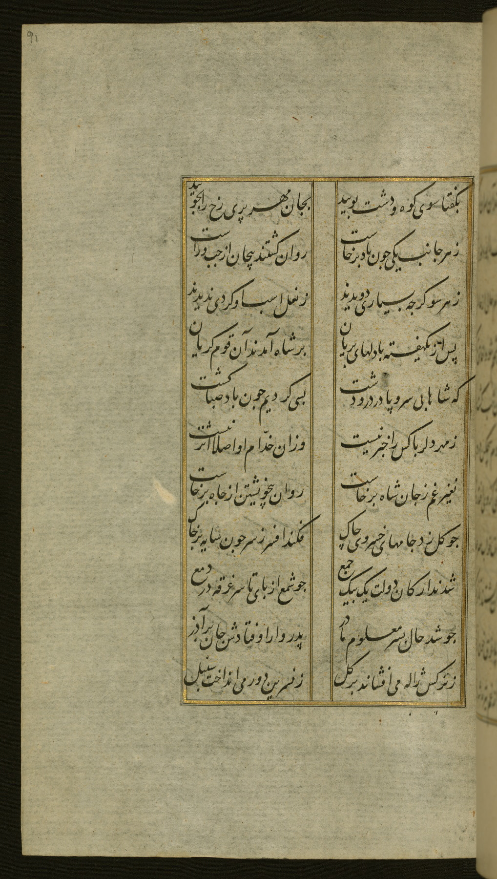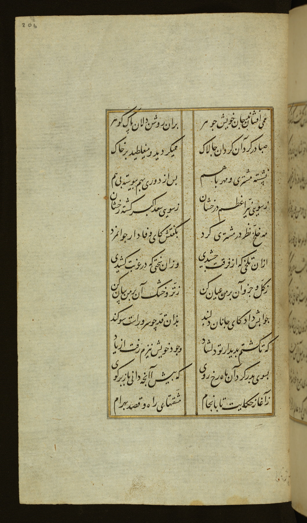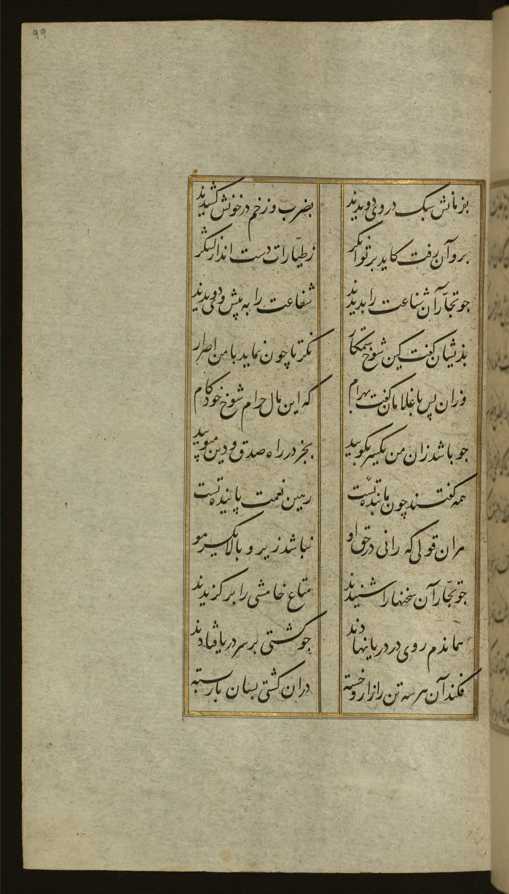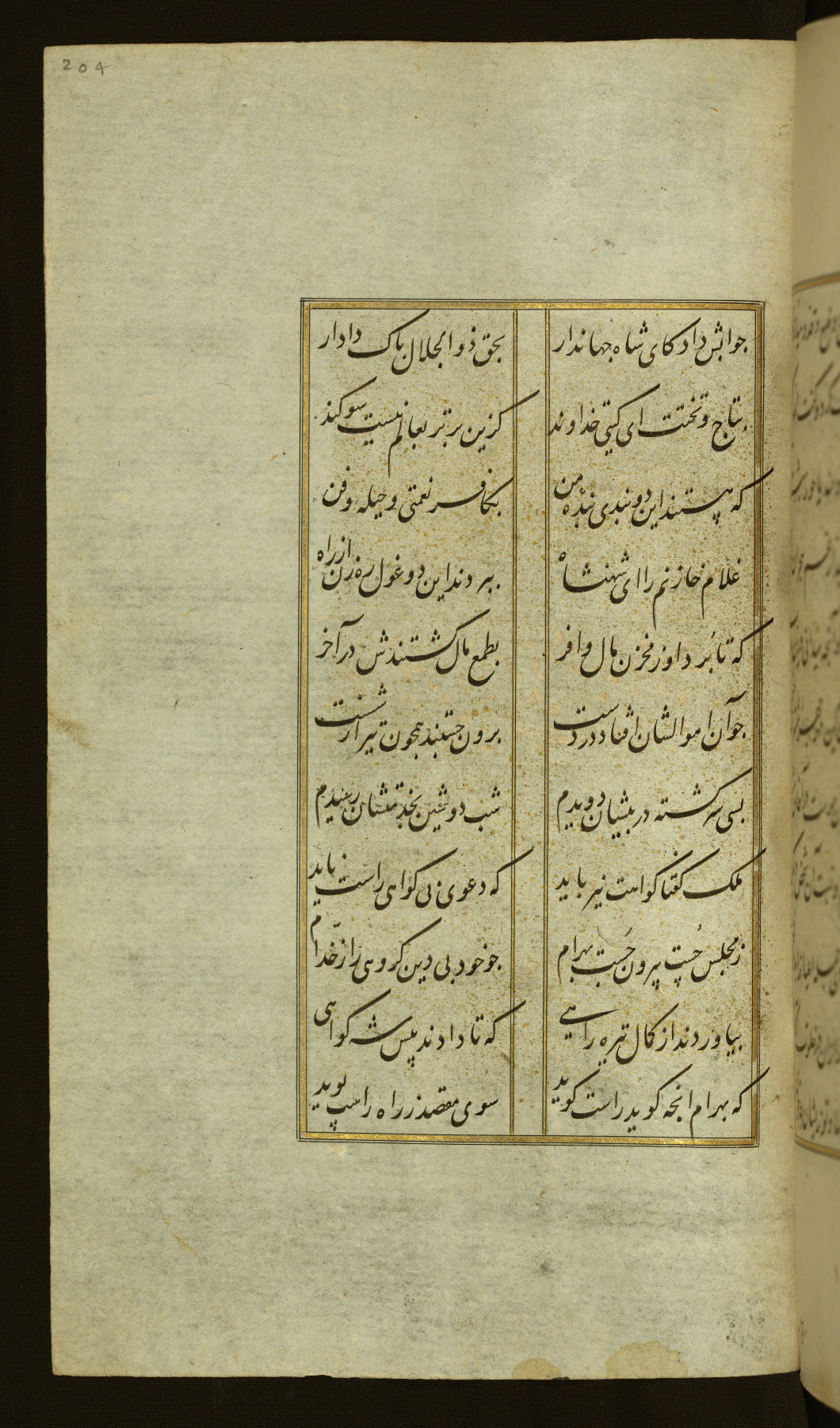 This manuscript is an illustrated copy of the well-known poem recounting the platonic love story between Mihr (the Sun), the son of Shāhpūr, and his vizier's son Mushtarī (Jupiter). The story of 90 chapters was composed by Muḥammad ibn Aḥmad ‘Aṣṣār Tabrīzī (d. 784 AH / 1382 CE). The present copy was written in nasta‘līq script by Murshid al-Kātib in 881 AH / 1476 CE. Considering the number of surviving manuscripts in which this calligrapher’s name is found, it seems he was particularly prolific. The present codex is illustrated with nine paintings. The gold-brushed leather binding with doublures of red leather decorated with filigree work is original to the manuscript.