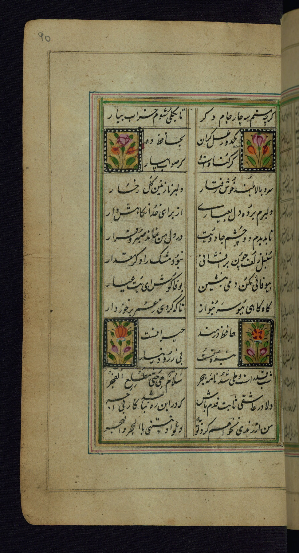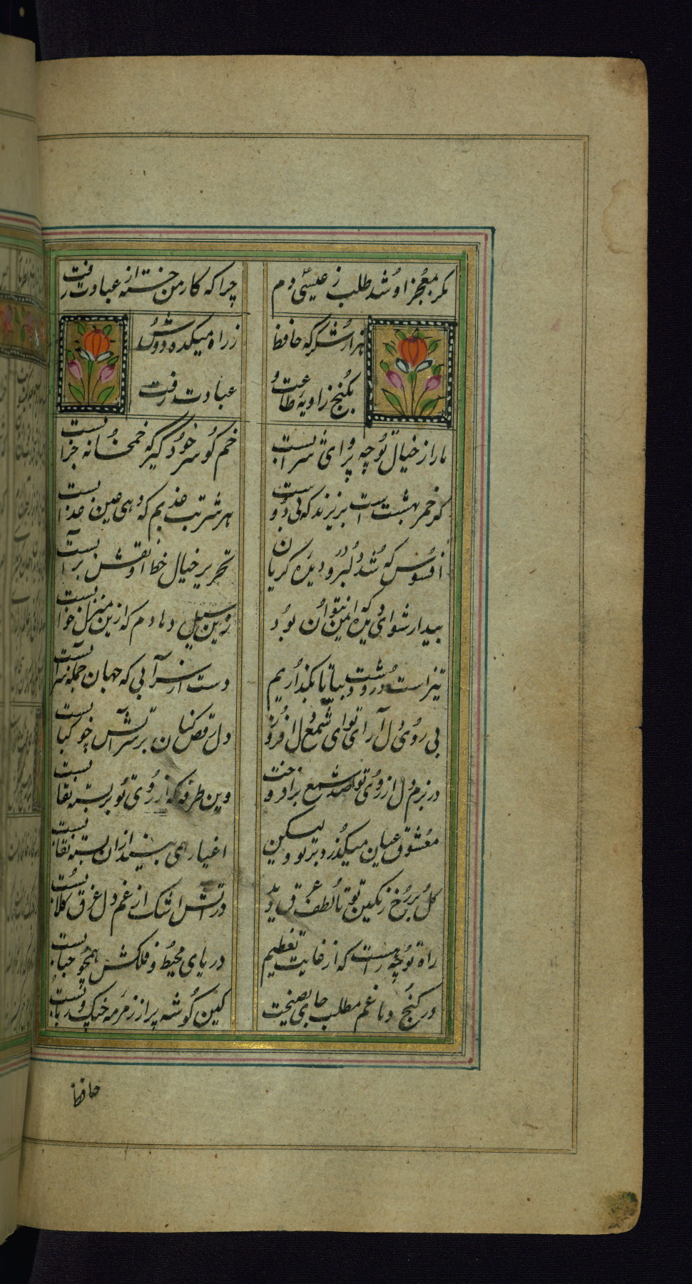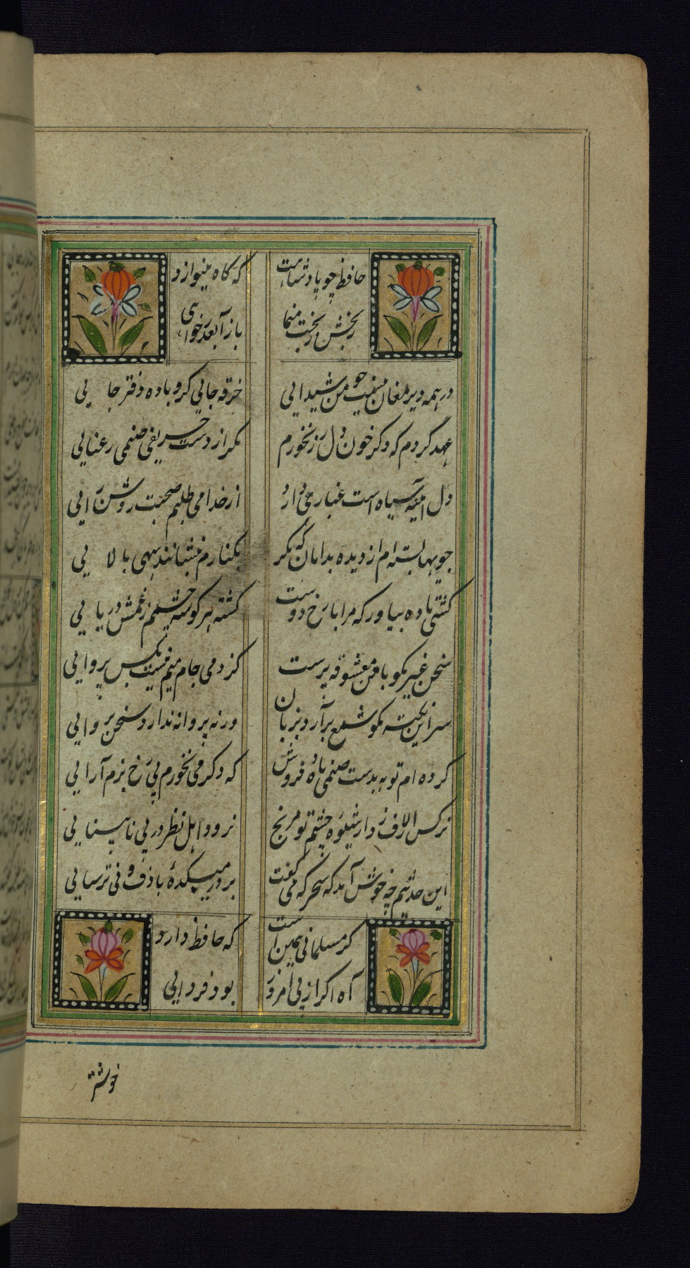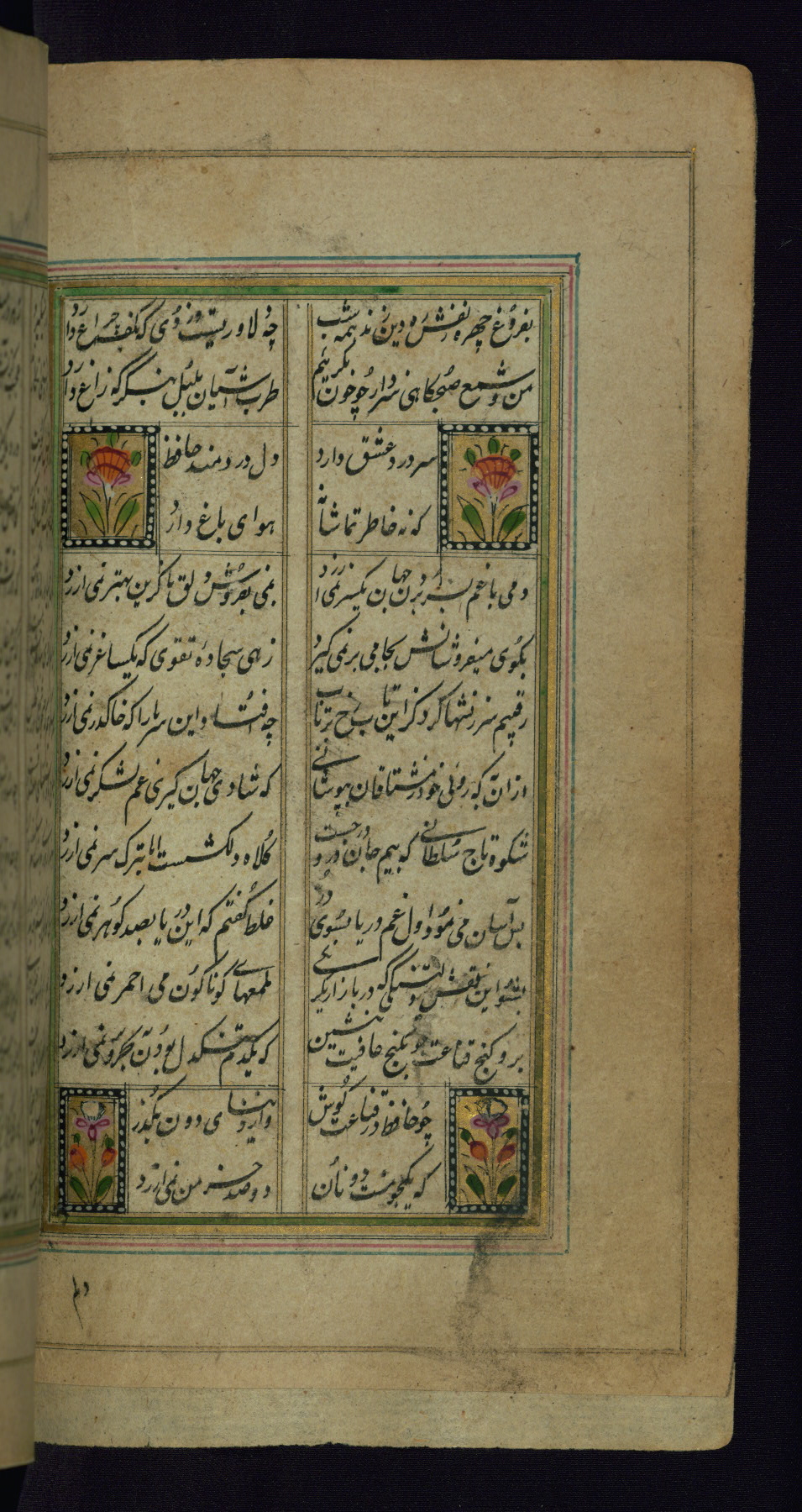 This is an illuminated and illustrated Collection of poems (dīvān) by Shams al-Dīn Muḥammad Ḥāfiz al-Shīrāzī (fl. eighth century AH / fourteenth CE), which was produced in India. According to the colophon, the manuscript was completed on the 19th Rajab 1202[?] AH / 1788[?] CE. It opens with a double-page illuminated incipit (fols. 1b-2a) with headpiece that introduces the preface (dībāchah) (fols. 1b-4b), followed by another double-page illuminated incipit with headpiece opening the main text of the Dīvān (fols. 5b-6a). The codex is decorated throughout with square and rectangular panels, as well as horizontal bands with floral decoration marking the end of odes, quatrains, or series of verses. There are forty-nine illustrations. The brown leather binding with medallion and pendants is contemporary with the manuscript.