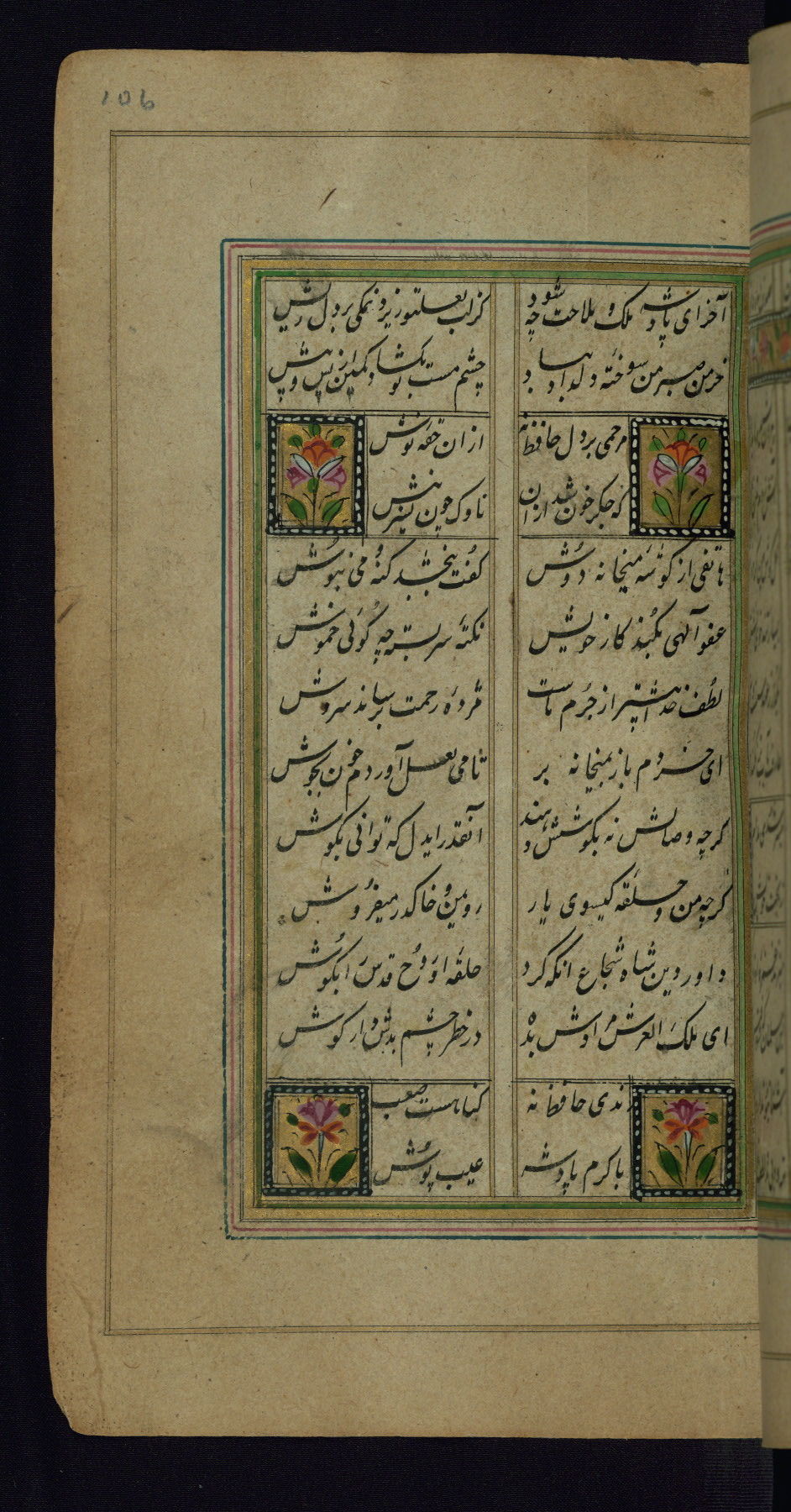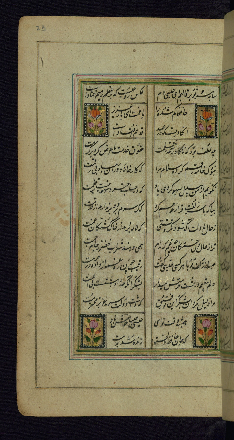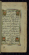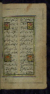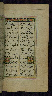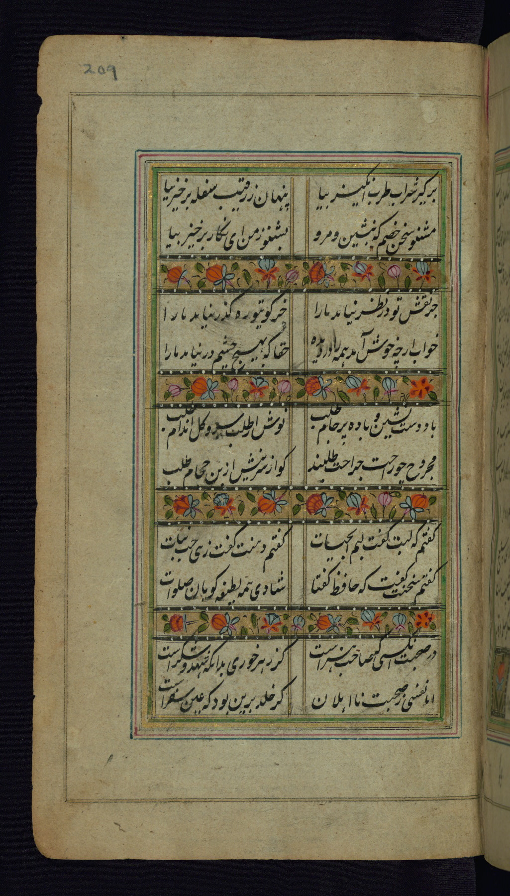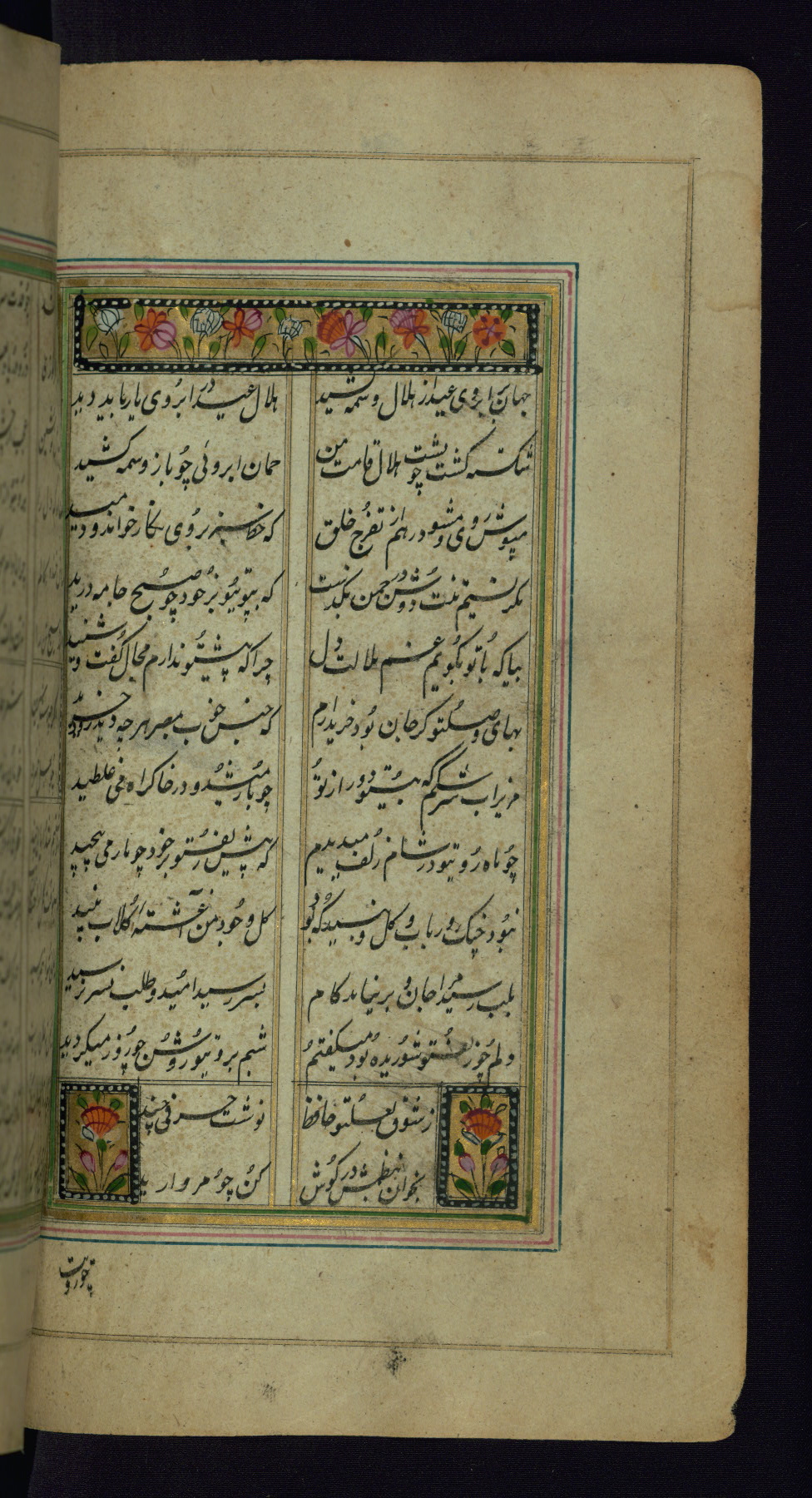This is an illuminated and illustrated Collection of poems (dīvān) by Shams al-Dīn Muḥammad Ḥāfiz al-Shīrāzī (fl. eighth century AH / fourteenth CE), which was produced in India. According to the colophon, the manuscript was completed on the 19th Rajab 1202[?] AH / 1788[?] CE. It opens with a double-page illuminated incipit (fols. 1b-2a) with headpiece that introduces the preface (dībāchah) (fols. 1b-4b), followed by another double-page illuminated incipit with headpiece opening the main text of the Dīvān (fols. 5b-6a). The codex is decorated throughout with square and rectangular panels, as well as horizontal bands with floral decoration marking the end of odes, quatrains, or series of verses. There are forty-nine illustrations. The brown leather binding with medallion and pendants is contemporary with the manuscript.