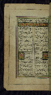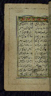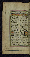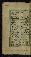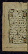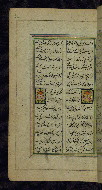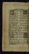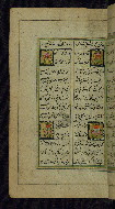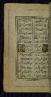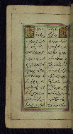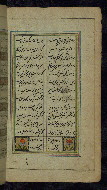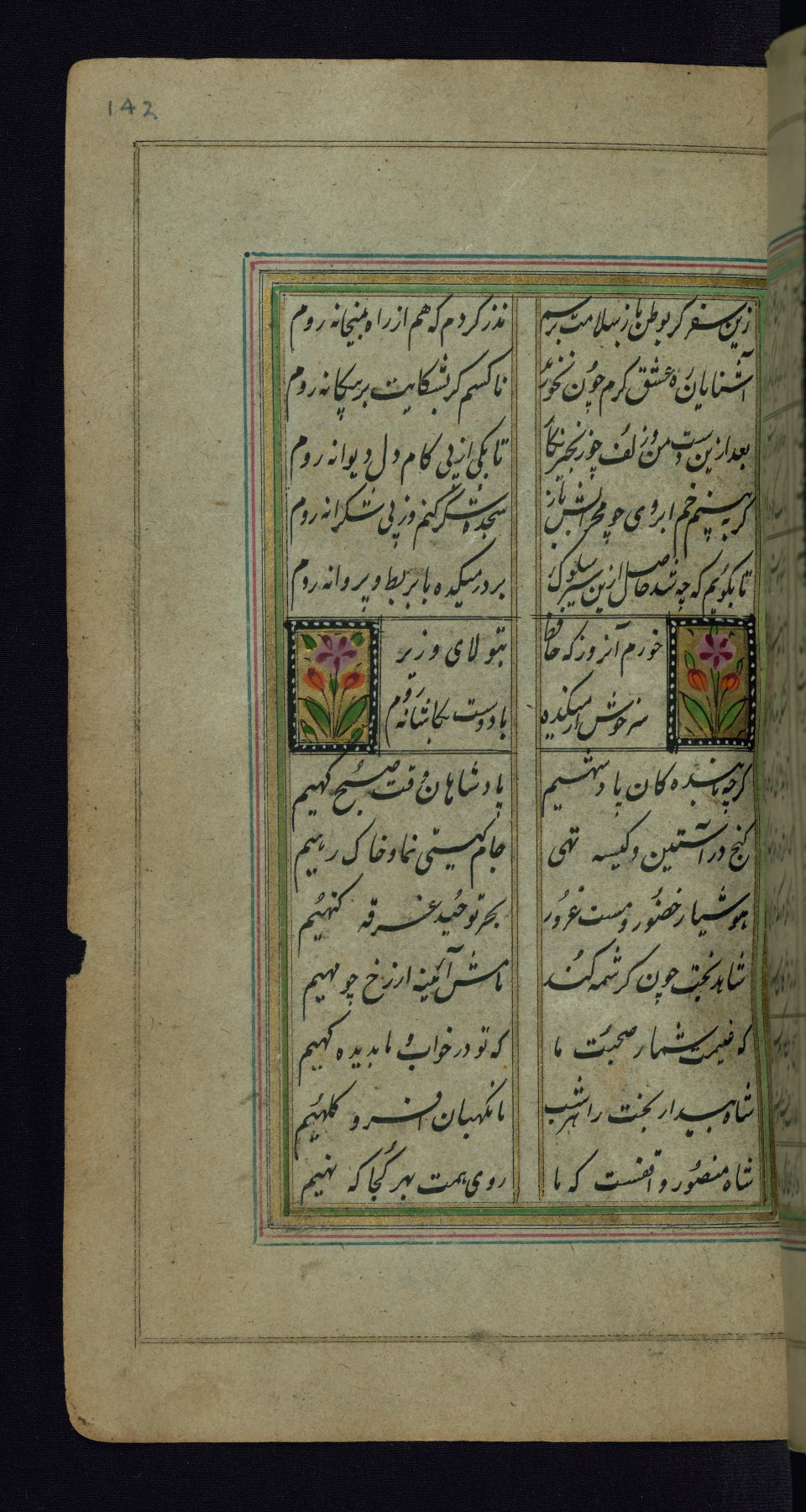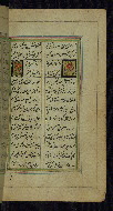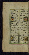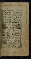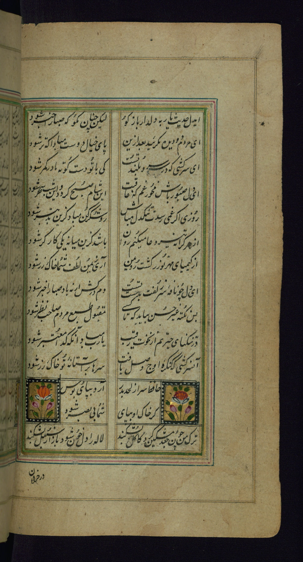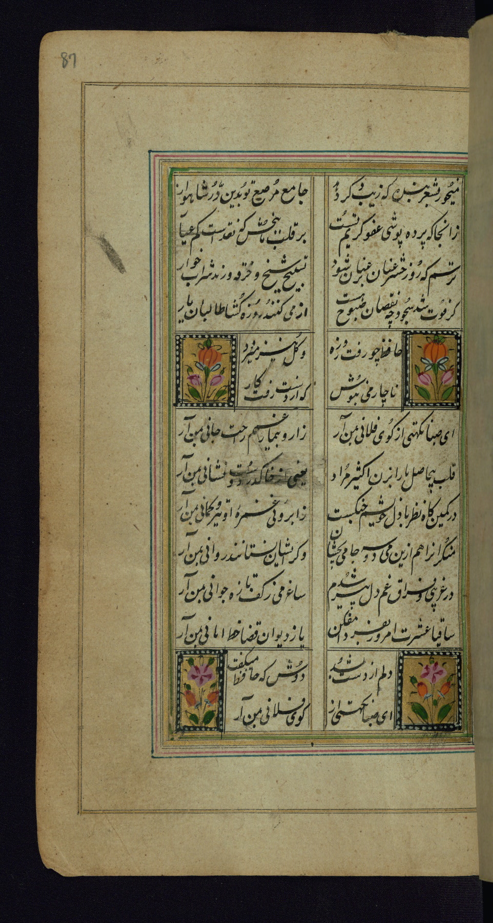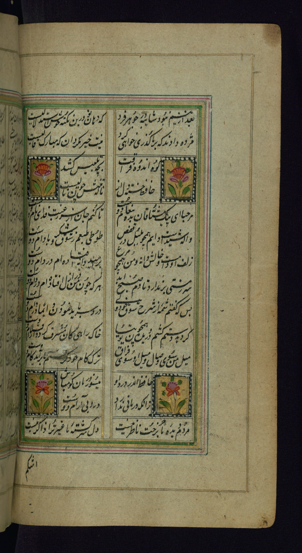 This is an illuminated and illustrated Collection of poems (dīvān) by Shams al-Dīn Muḥammad Ḥāfiz al-Shīrāzī (fl. eighth century AH / fourteenth CE), which was produced in India. According to the colophon, the manuscript was completed on the 19th Rajab 1202[?] AH / 1788[?] CE. It opens with a double-page illuminated incipit (fols. 1b-2a) with headpiece that introduces the preface (dībāchah) (fols. 1b-4b), followed by another double-page illuminated incipit with headpiece opening the main text of the Dīvān (fols. 5b-6a). The codex is decorated throughout with square and rectangular panels, as well as horizontal bands with floral decoration marking the end of odes, quatrains, or series of verses. There are forty-nine illustrations. The brown leather binding with medallion and pendants is contemporary with the manuscript.