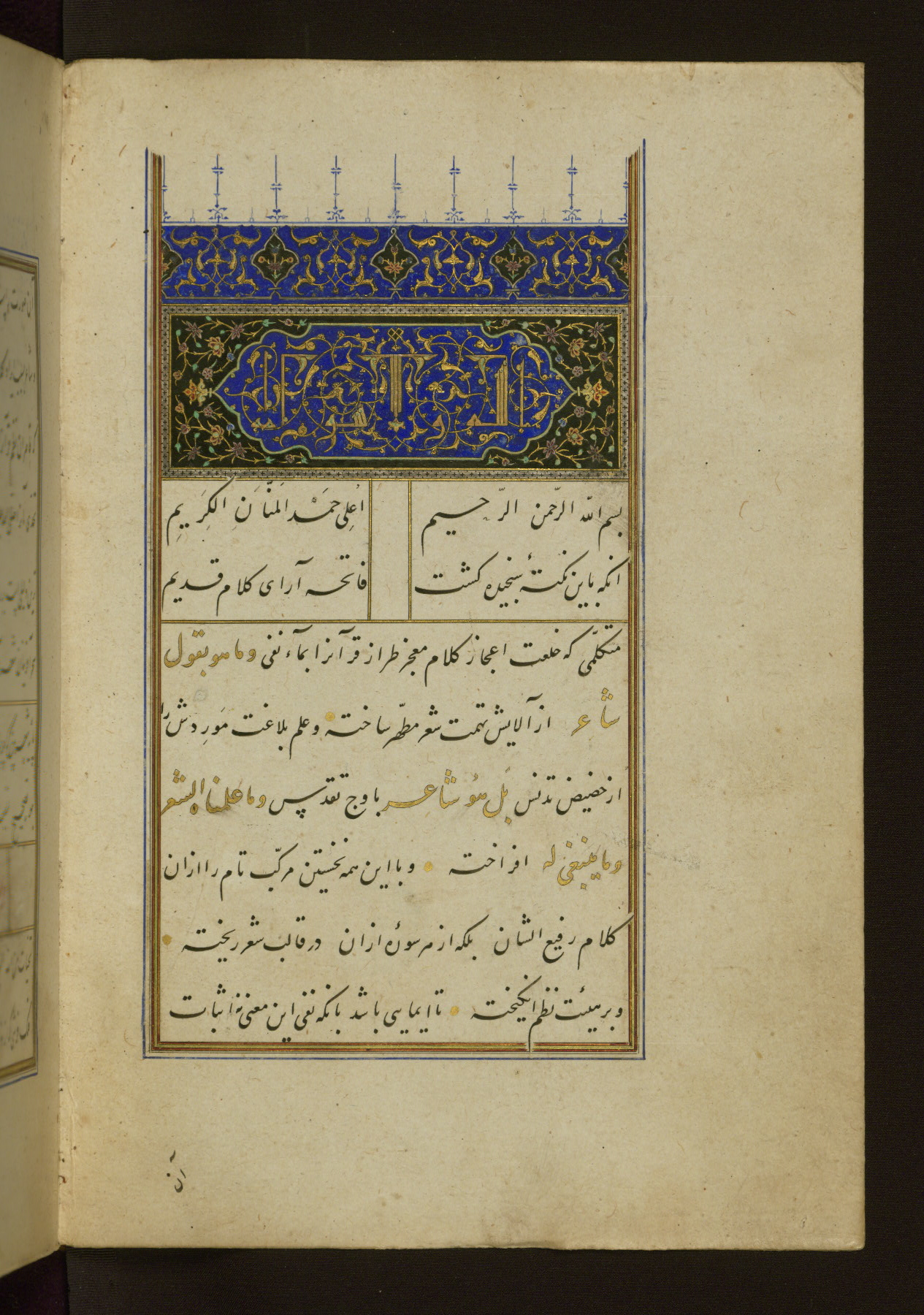 4. Label: This illuminated headpiece is inscribed Allāh wa-lā siwāhu in gold in the New Abbasid (broken cursive) style on a deep blue background. Incidentals are written in gold.