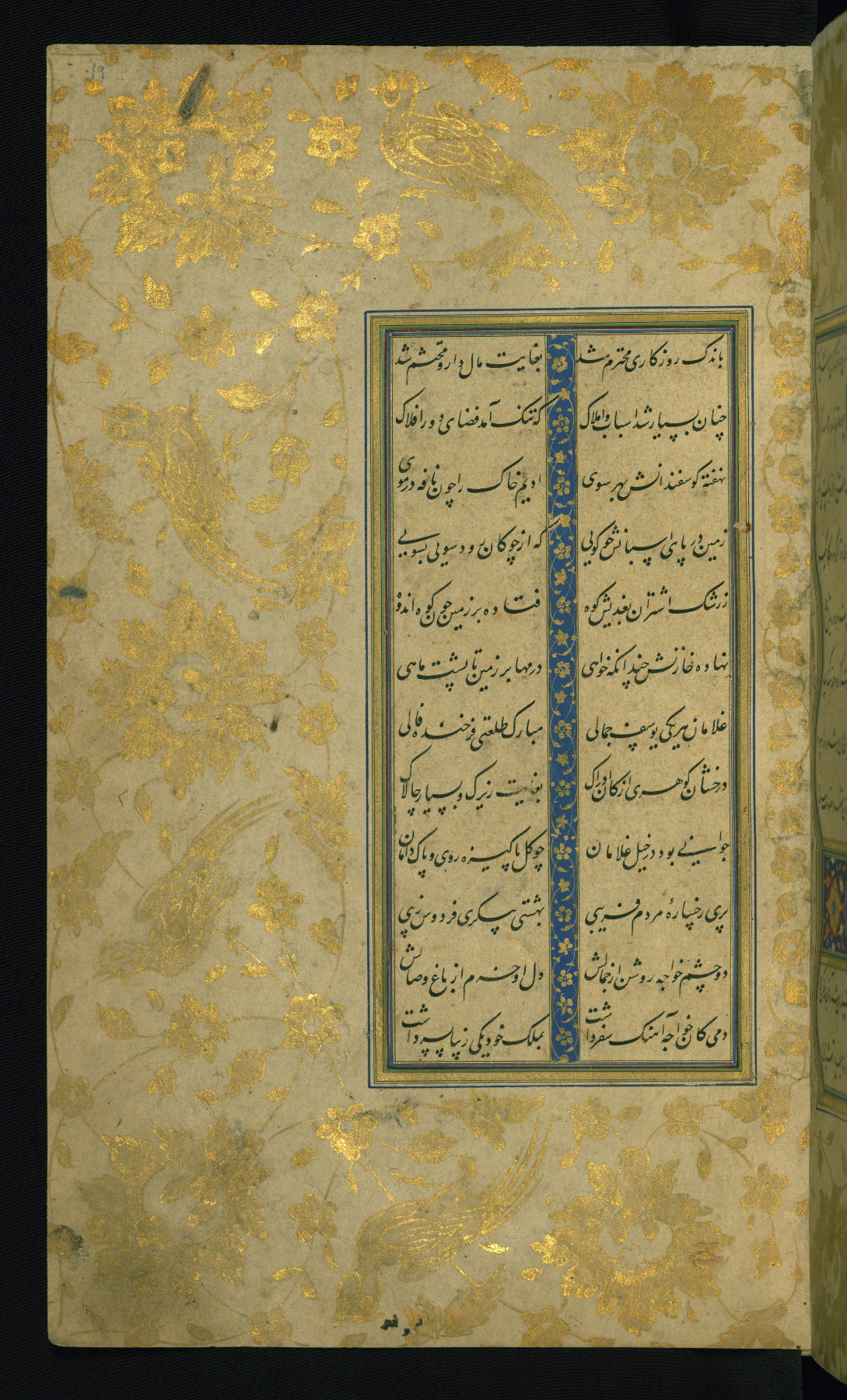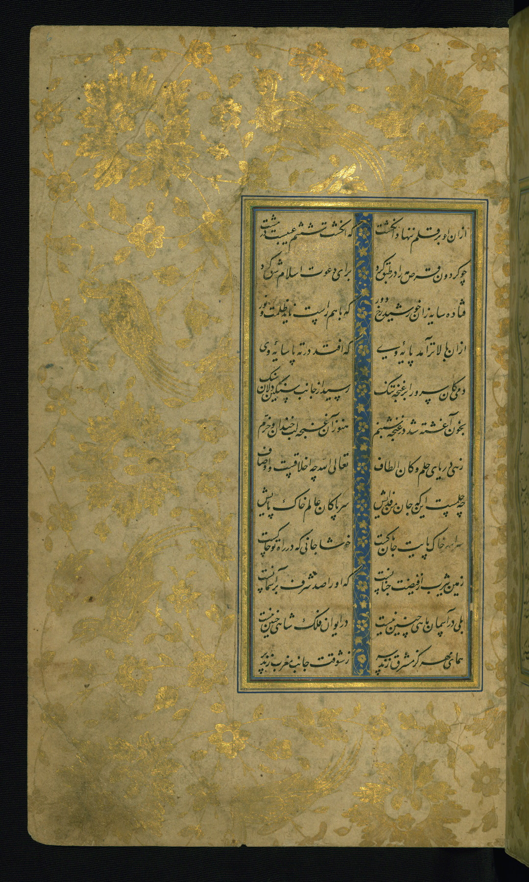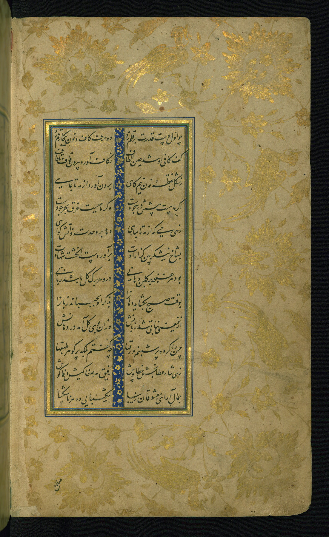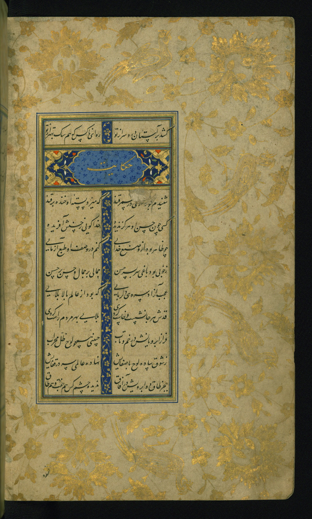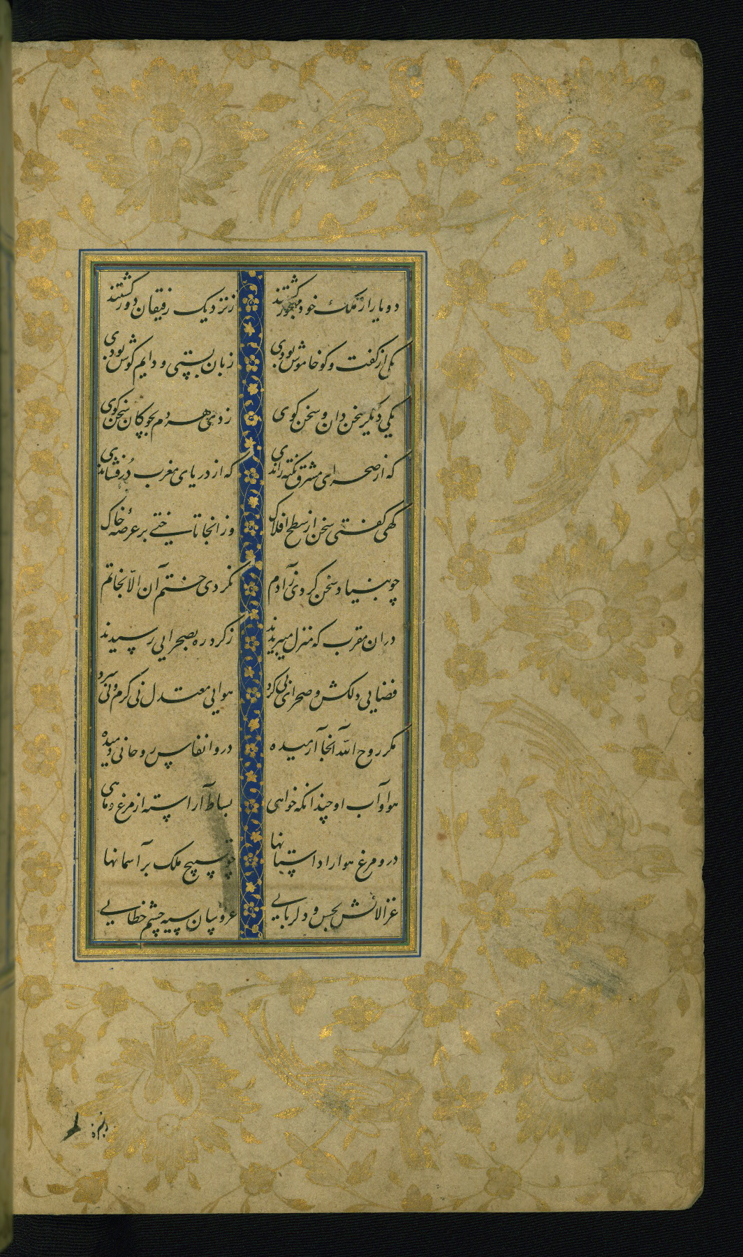 This is an illuminated and illustrated Safavid copy of a mystic poem (masnavi) entitled Ṣifat al-ʿāshiqīn (Qualities of lovers) by Nūr al-Dīn Hilālī (d. 936 AH / 1529-30 CE). It was written in nastaʿlīq script by Muʿizz al-Dīn Muḥammad al-Ḥusaynī in 978 AH / 1570-1 CE. The manuscript opens with a double-page illustrated frontispiece (fols. 1b-2a), followed by a double-page illuminated incipit (fols. 2b-3a). Borders throughout the codex are illuminated with floral and bird motifs. The lacquer binding is original to the manuscript.