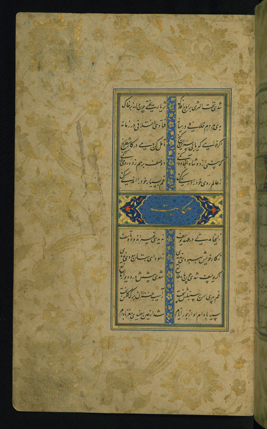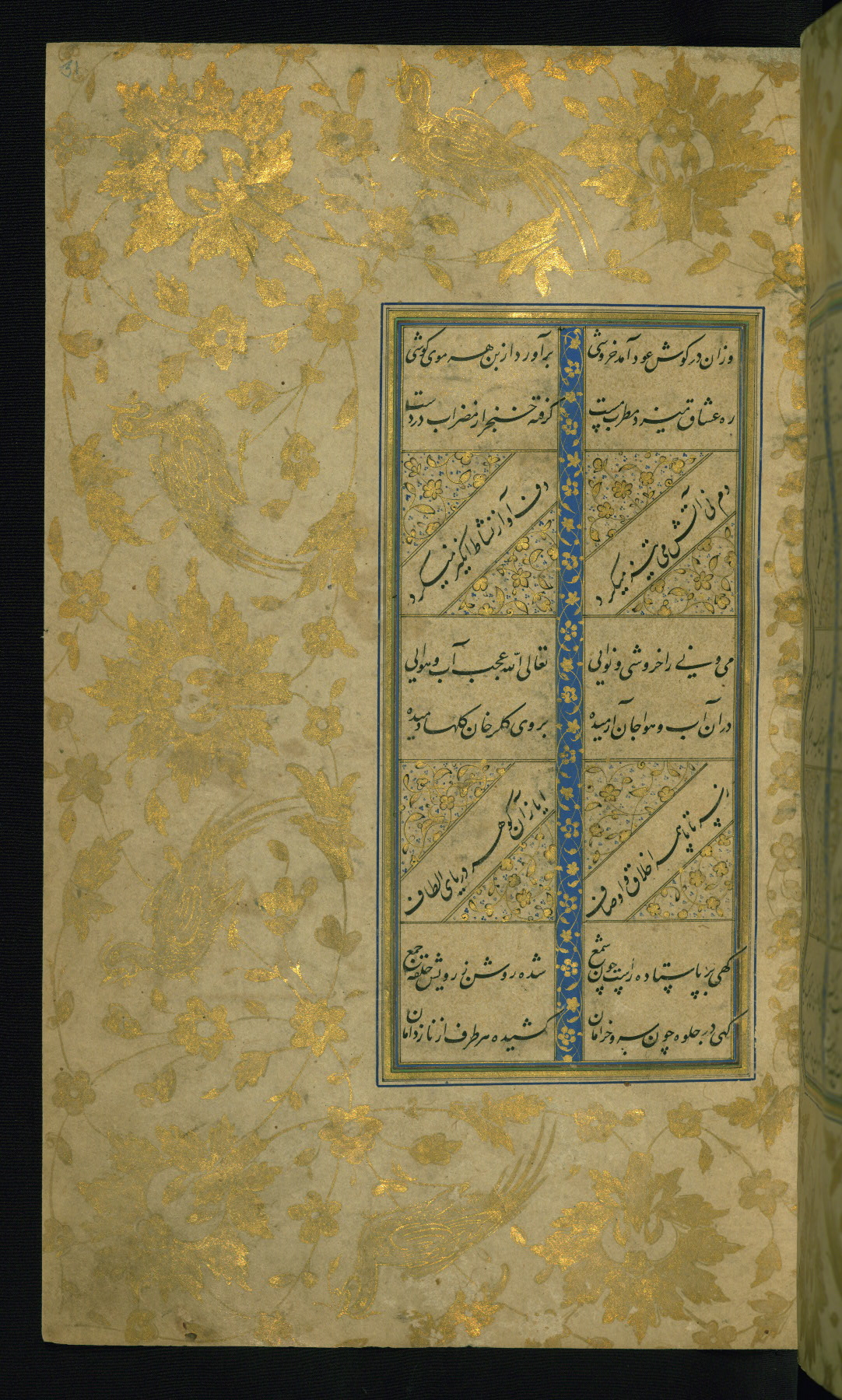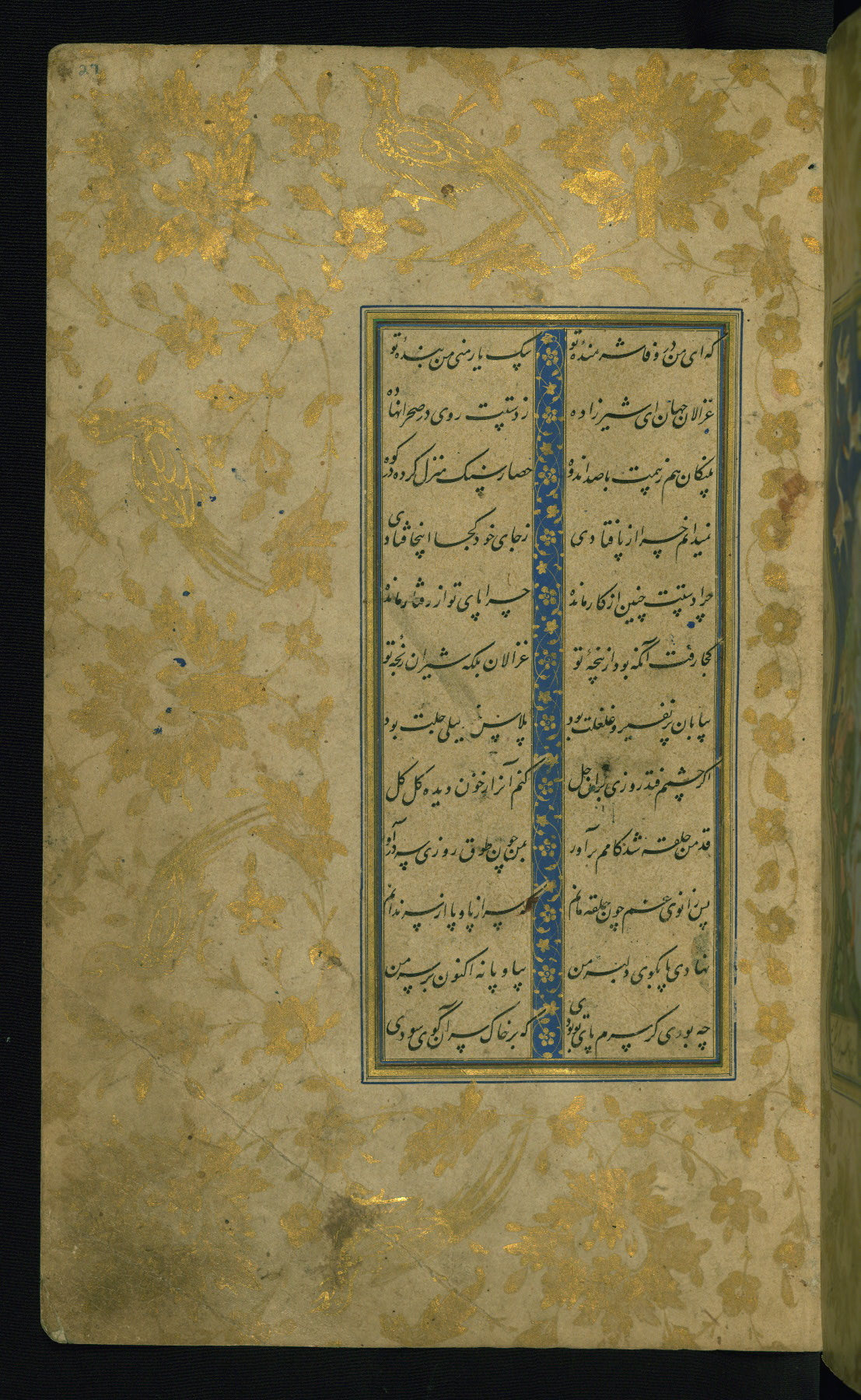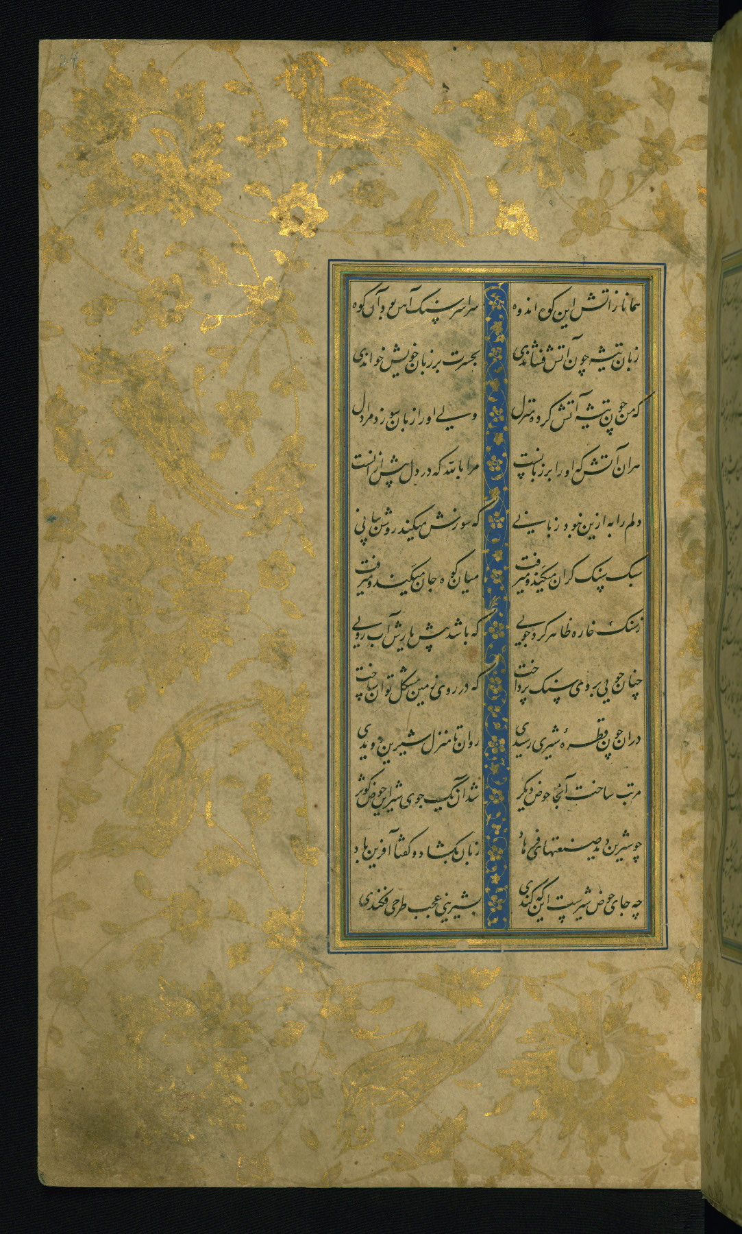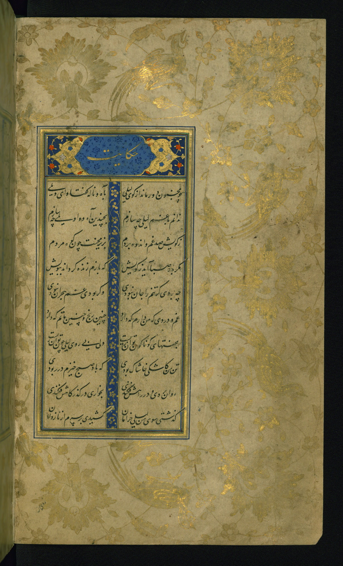 This is an illuminated and illustrated Safavid copy of a mystic poem (masnavi) entitled Ṣifat al-ʿāshiqīn (Qualities of lovers) by Nūr al-Dīn Hilālī (d. 936 AH / 1529-30 CE). It was written in nastaʿlīq script by Muʿizz al-Dīn Muḥammad al-Ḥusaynī in 978 AH / 1570-1 CE. The manuscript opens with a double-page illustrated frontispiece (fols. 1b-2a), followed by a double-page illuminated incipit (fols. 2b-3a). Borders throughout the codex are illuminated with floral and bird motifs. The lacquer binding is original to the manuscript.