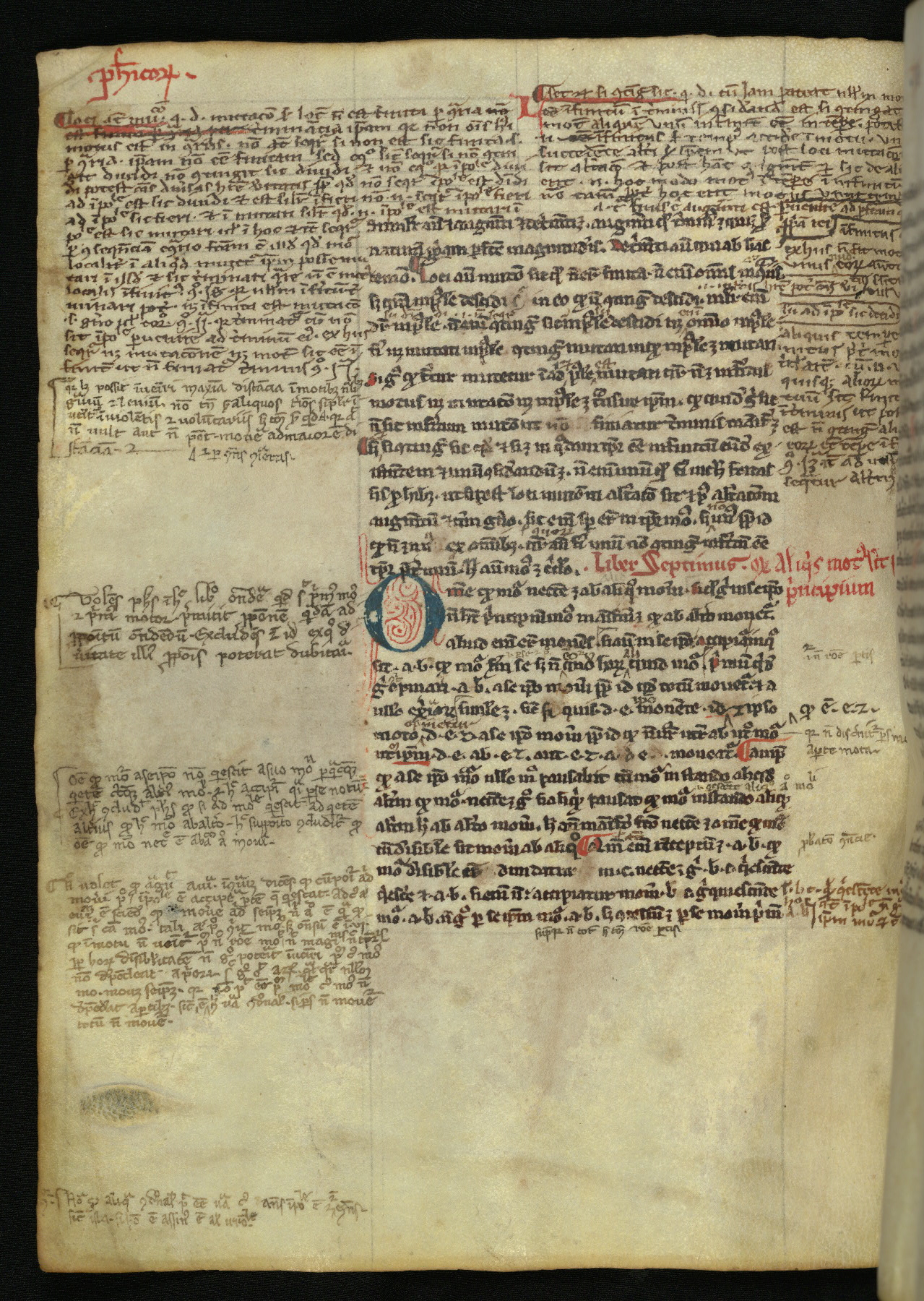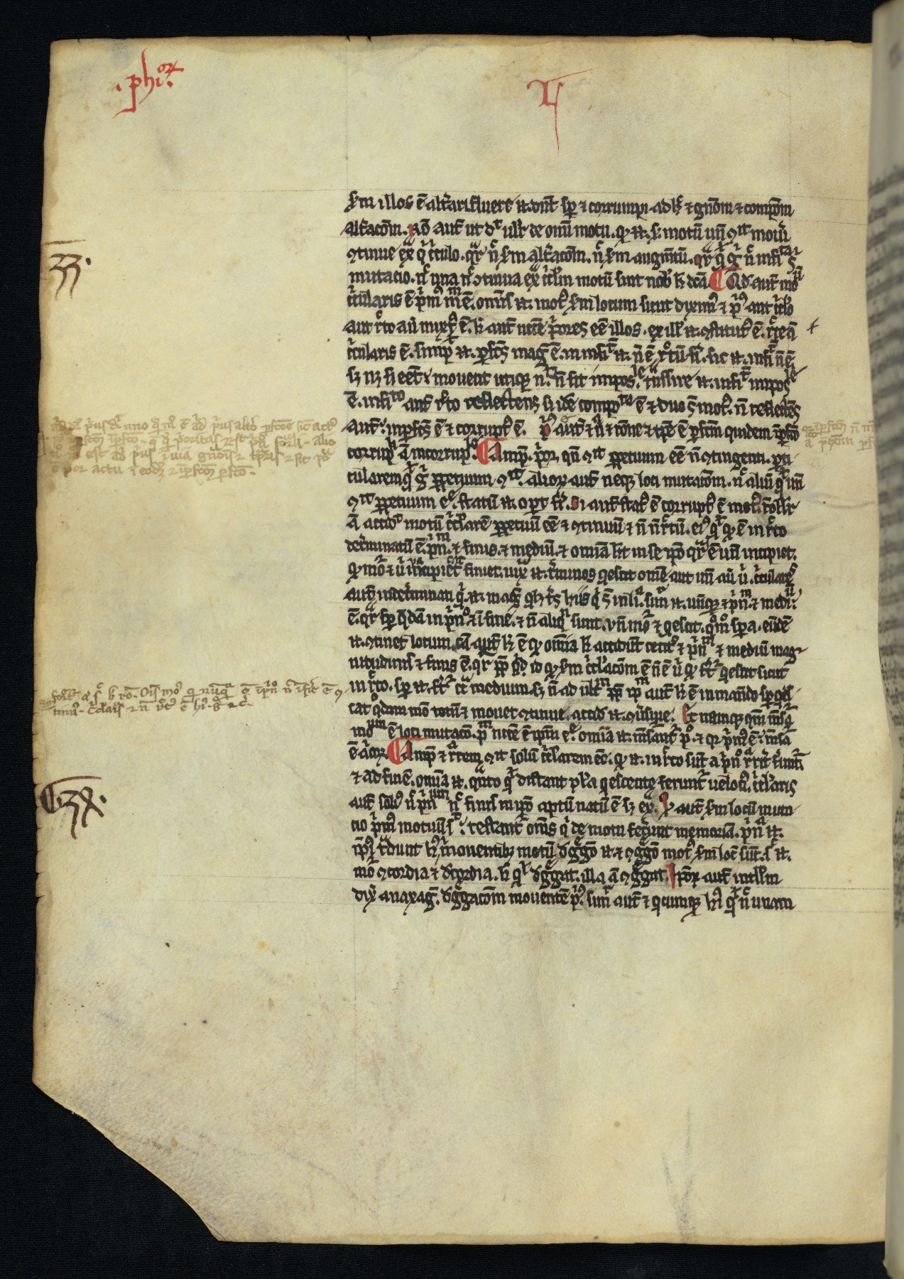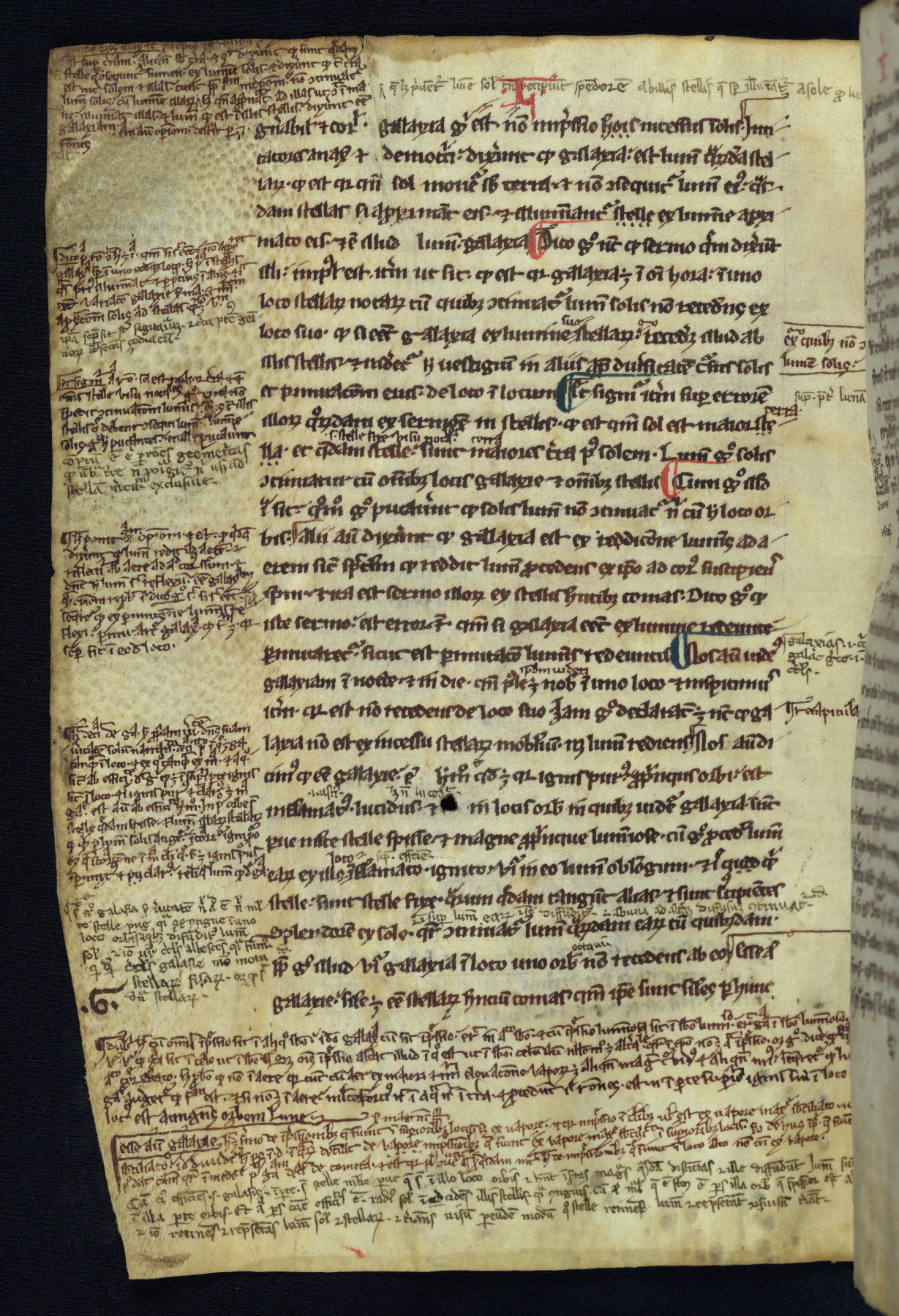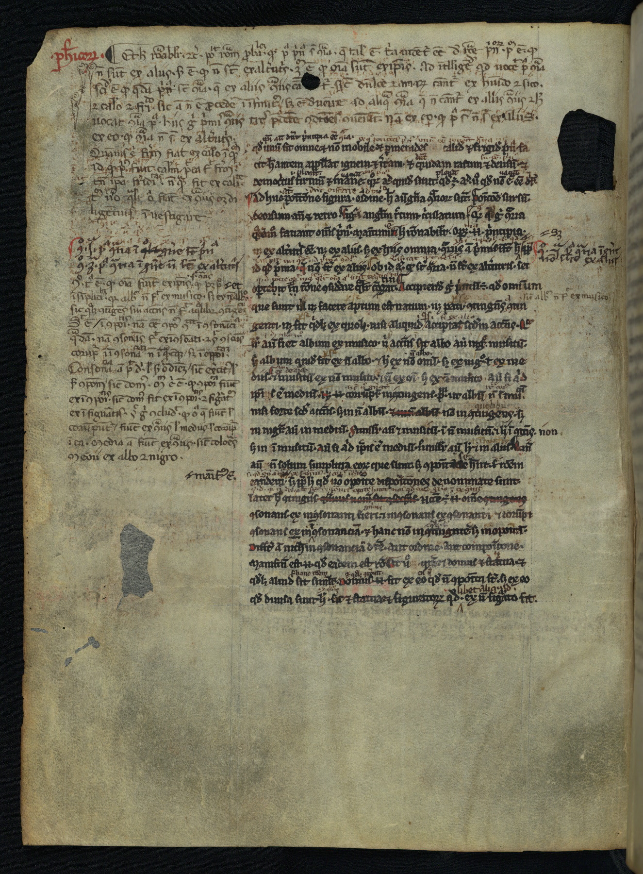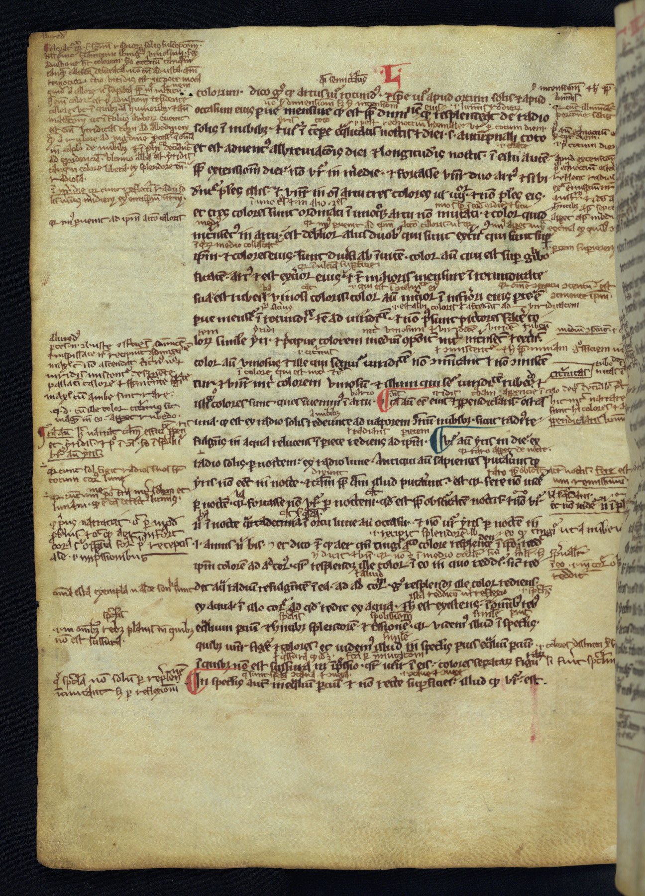 This thirteenth-century scholar’s text appears to be a composite of various smaller booklets, written in a variety of different places and times; the script, layout, and even parchment type change drastically from one section to the next. It contains Latin translations of several scientific works of Aristotle, along with other works by a variety of authors. Those additional authors, who are primarily medieval and represent a wide range of scholars who engaged with Aristotle across both time and place, include Frederick II, Holy Roman Emperor (1194-1250), Alfred of Sareshel (also known as Alfredus Anglicus, a 13th century English scholar), Henricus Aristippus (fl. 1156-1162), Qusṭā ibn Lūqā (ca. 820-912, known as Costa ben Luca), Nicolaus of Damascus (b. 64 BCE), Joannes Hispalensis (12th century), William of Moerbeke (ca. 1215-1286), Averroës (1126-1198), Kindī (d. ca. 873, and name written in text as ysaac filii iacob alchindi), and Rāzī, Abū Bakr Muḥammad ibn Zakarīyā (865?-925?). The majority of the texts, and the abundance of marginal notes and glosses that accompany them, were probably produced in England, France, or Spain, but the last folios and many of the notes seem to be of Italian origin, suggesting a text that was well traveled in addition to being well read.