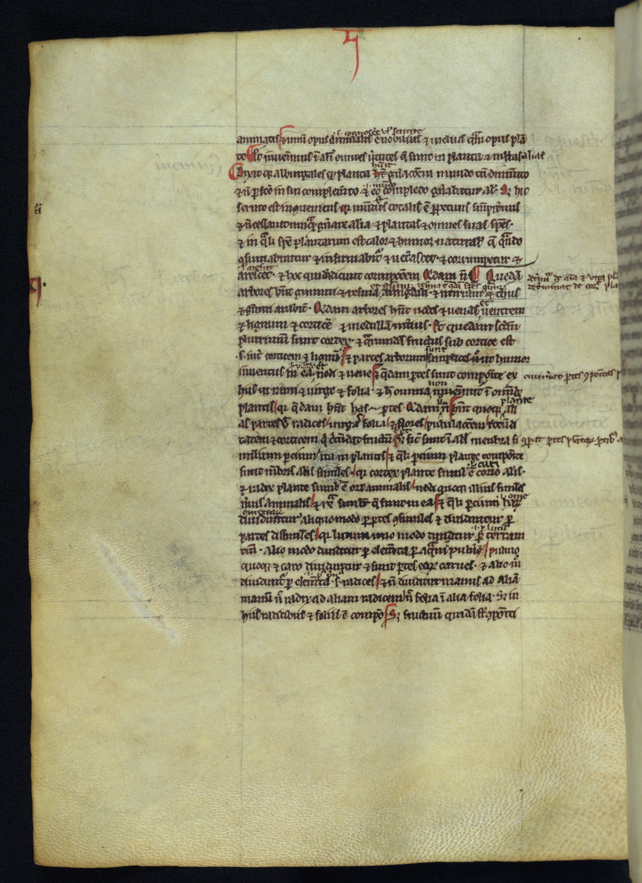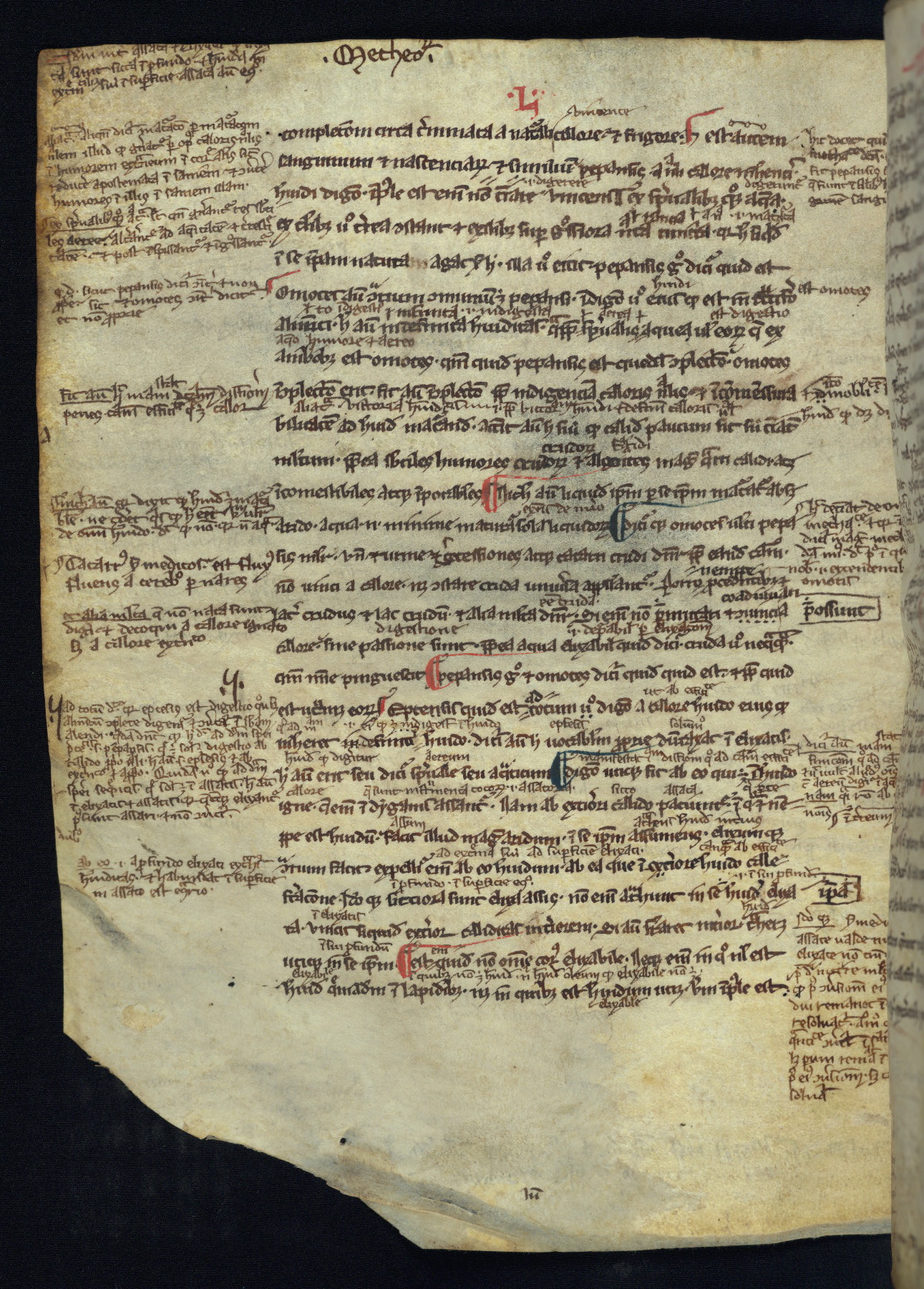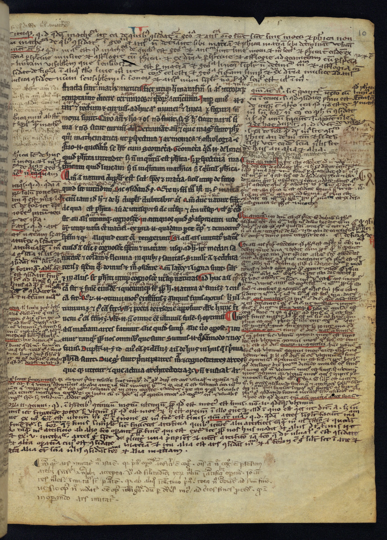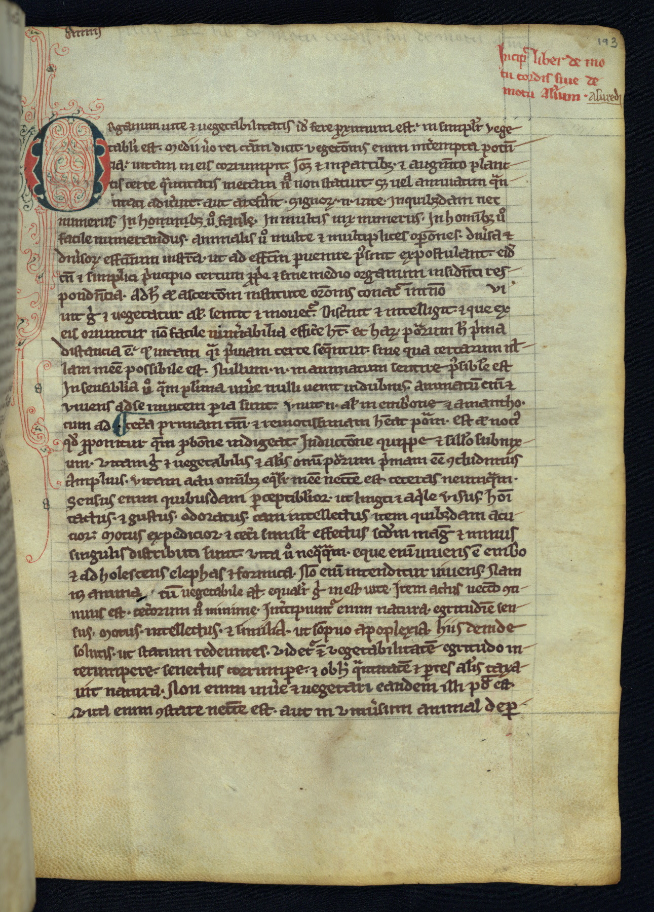 This thirteenth-century scholar’s text appears to be a composite of various smaller booklets, written in a variety of different places and times; the script, layout, and even parchment type change drastically from one section to the next. It contains Latin translations of several scientific works of Aristotle, along with other works by a variety of authors. Those additional authors, who are primarily medieval and represent a wide range of scholars who engaged with Aristotle across both time and place, include Frederick II, Holy Roman Emperor (1194-1250), Alfred of Sareshel (also known as Alfredus Anglicus, a 13th century English scholar), Henricus Aristippus (fl. 1156-1162), Qusṭā ibn Lūqā (ca. 820-912, known as Costa ben Luca), Nicolaus of Damascus (b. 64 BCE), Joannes Hispalensis (12th century), William of Moerbeke (ca. 1215-1286), Averroës (1126-1198), Kindī (d. ca. 873, and name written in text as ysaac filii iacob alchindi), and Rāzī, Abū Bakr Muḥammad ibn Zakarīyā (865?-925?). The majority of the texts, and the abundance of marginal notes and glosses that accompany them, were probably produced in England, France, or Spain, but the last folios and many of the notes seem to be of Italian origin, suggesting a text that was well traveled in addition to being well read.
