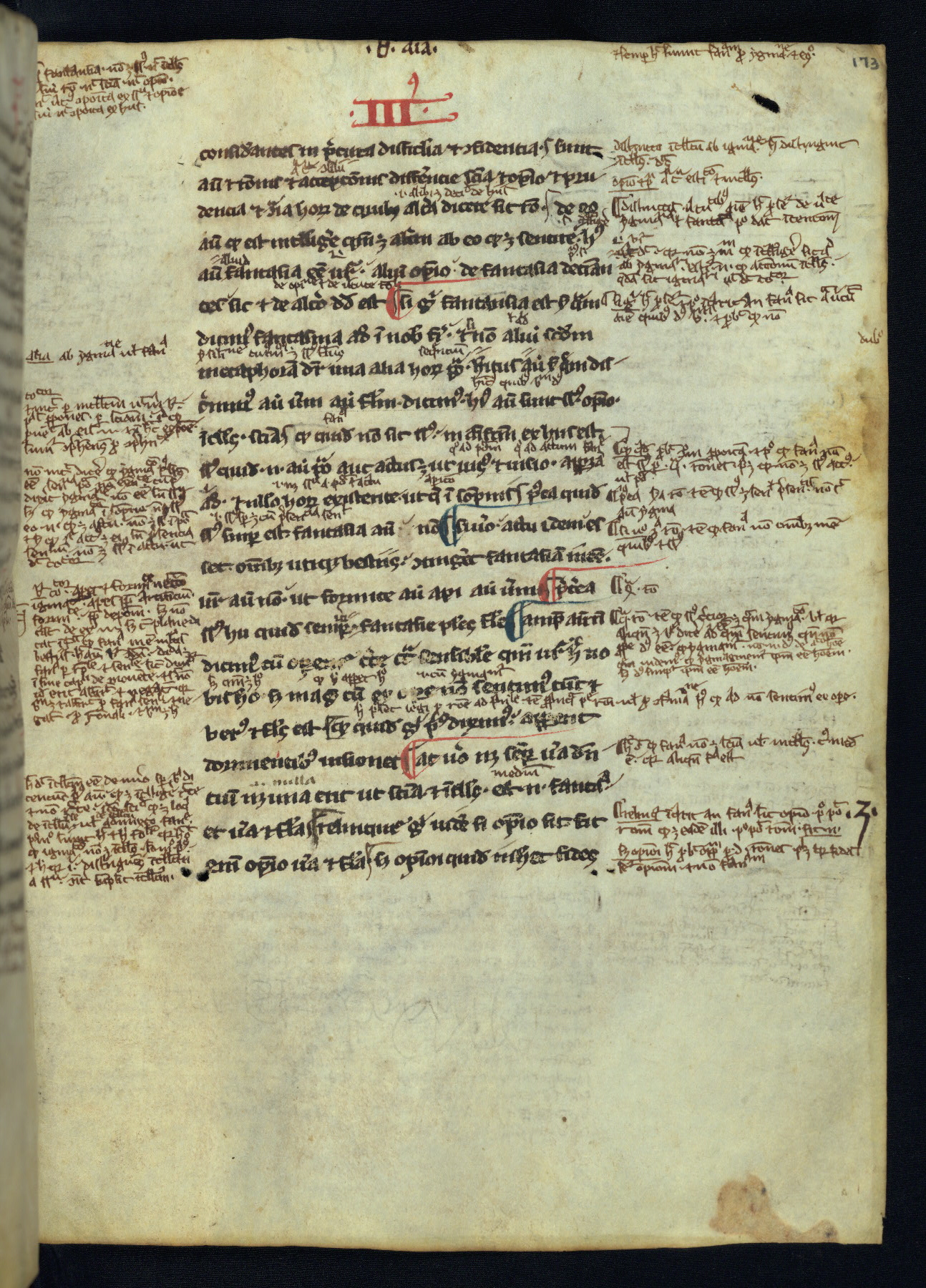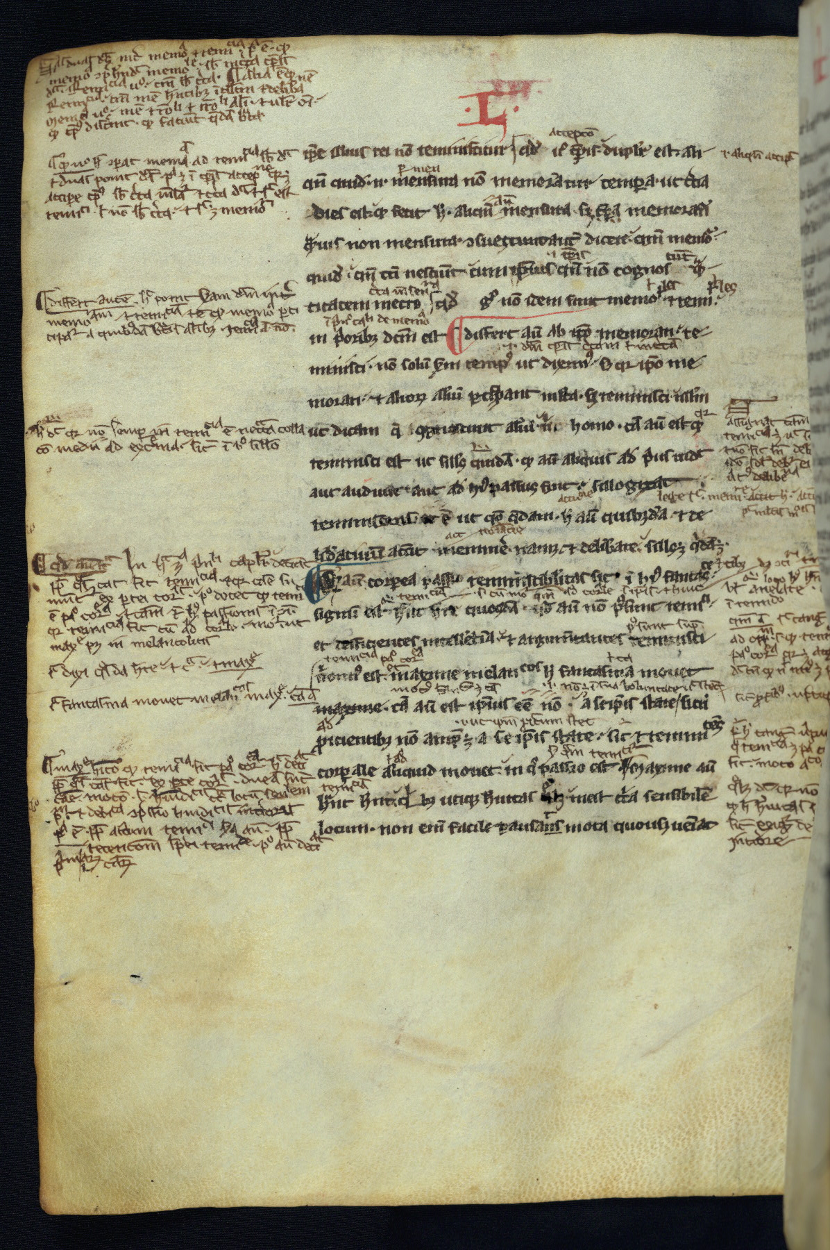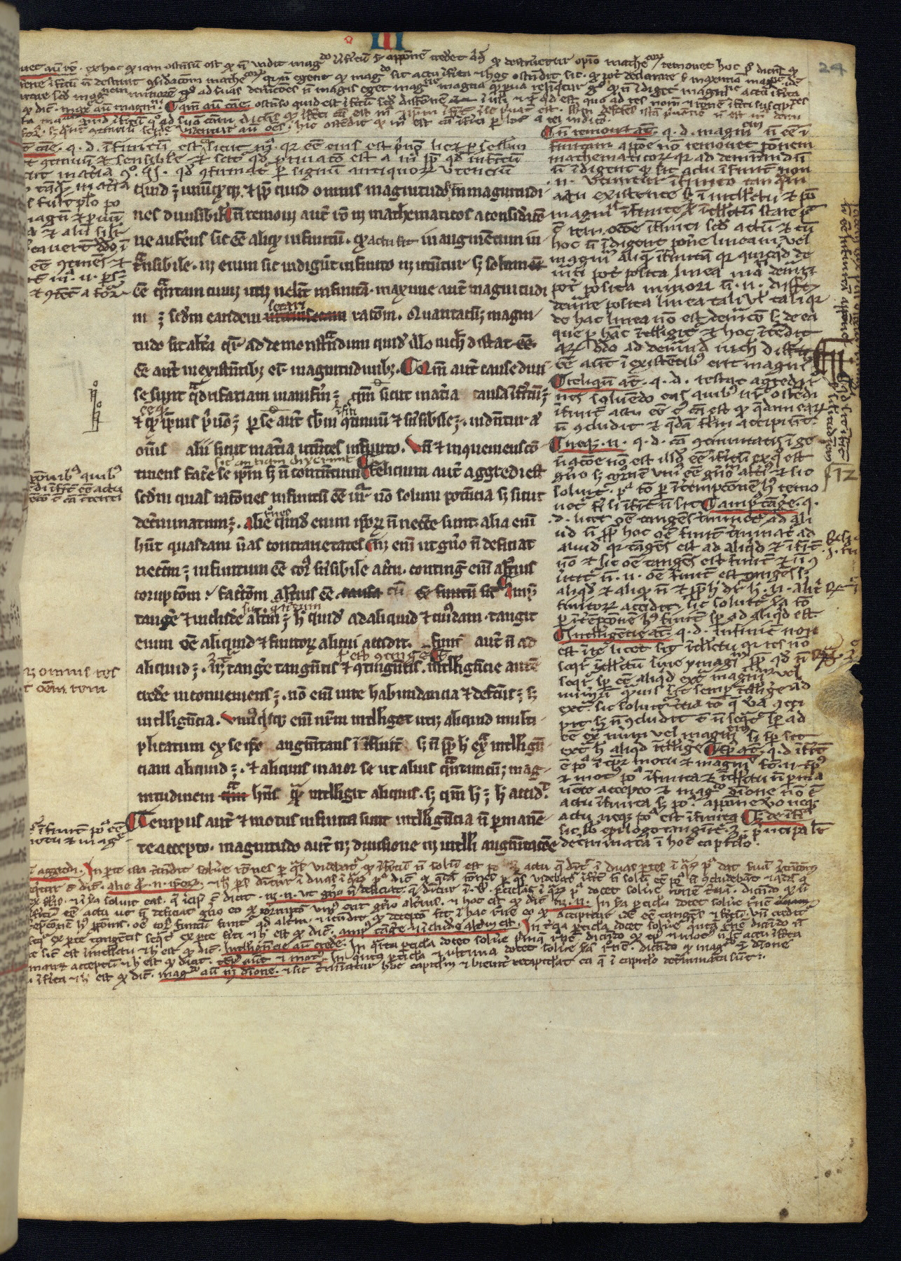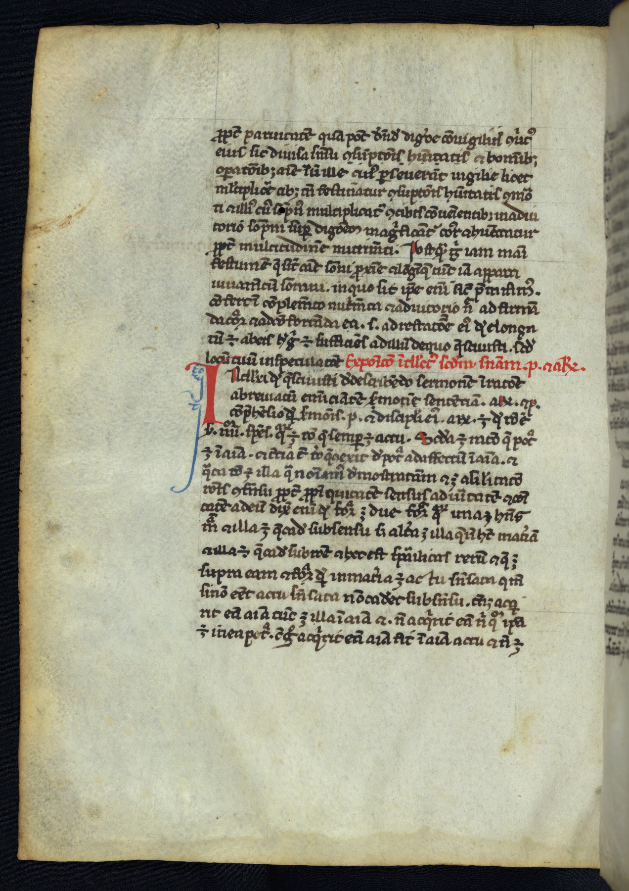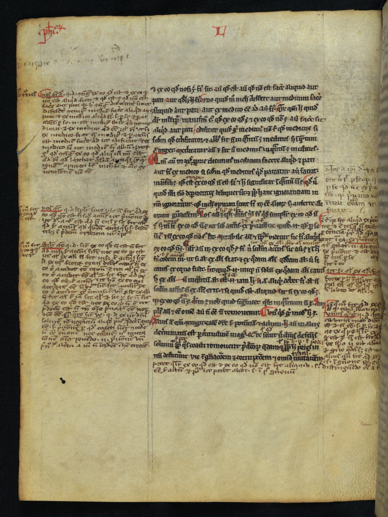 This thirteenth-century scholar’s text appears to be a composite of various smaller booklets, written in a variety of different places and times; the script, layout, and even parchment type change drastically from one section to the next. It contains Latin translations of several scientific works of Aristotle, along with other works by a variety of authors. Those additional authors, who are primarily medieval and represent a wide range of scholars who engaged with Aristotle across both time and place, include Frederick II, Holy Roman Emperor (1194-1250), Alfred of Sareshel (also known as Alfredus Anglicus, a 13th century English scholar), Henricus Aristippus (fl. 1156-1162), Qusṭā ibn Lūqā (ca. 820-912, known as Costa ben Luca), Nicolaus of Damascus (b. 64 BCE), Joannes Hispalensis (12th century), William of Moerbeke (ca. 1215-1286), Averroës (1126-1198), Kindī (d. ca. 873, and name written in text as ysaac filii iacob alchindi), and Rāzī, Abū Bakr Muḥammad ibn Zakarīyā (865?-925?). The majority of the texts, and the abundance of marginal notes and glosses that accompany them, were probably produced in England, France, or Spain, but the last folios and many of the notes seem to be of Italian origin, suggesting a text that was well traveled in addition to being well read.