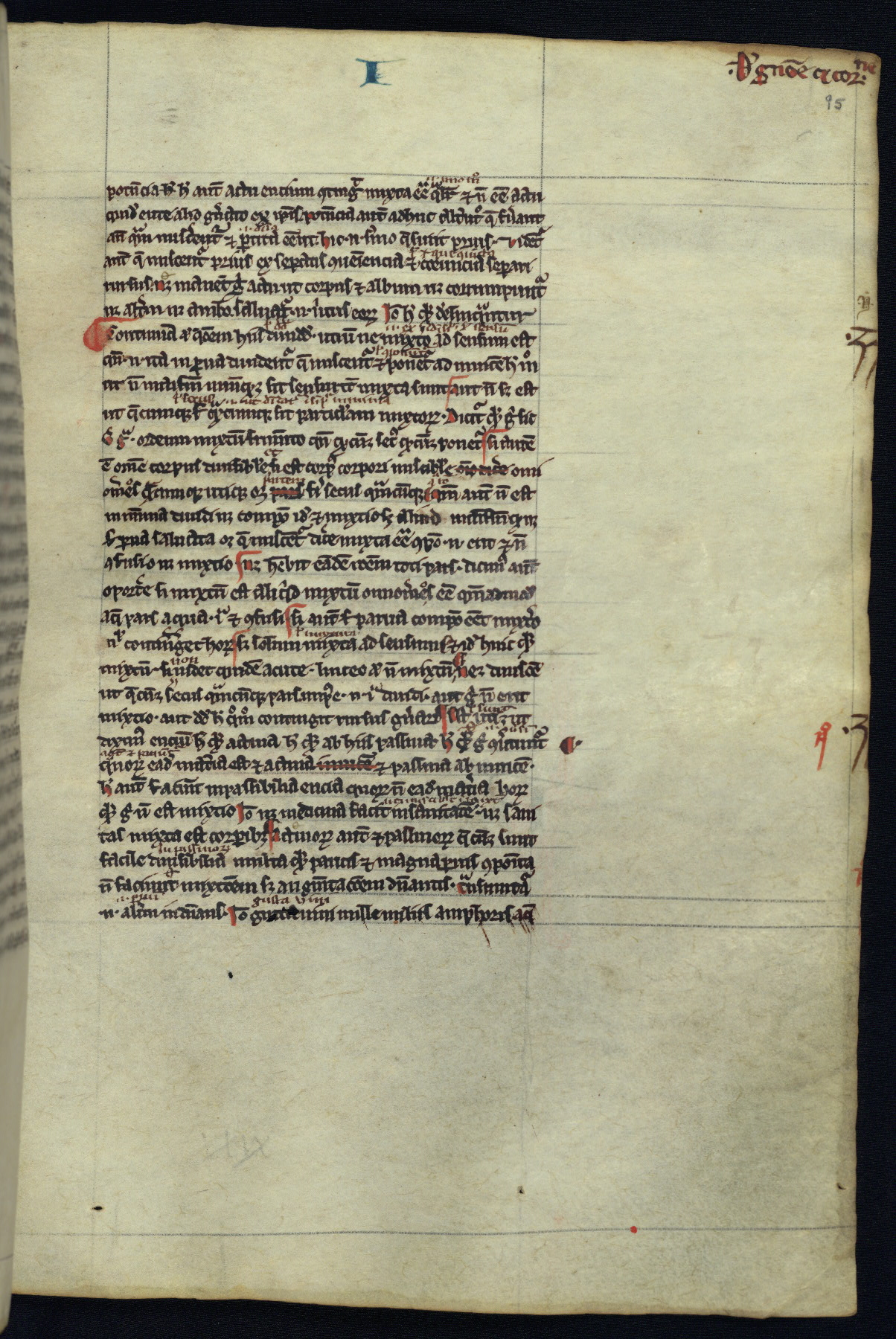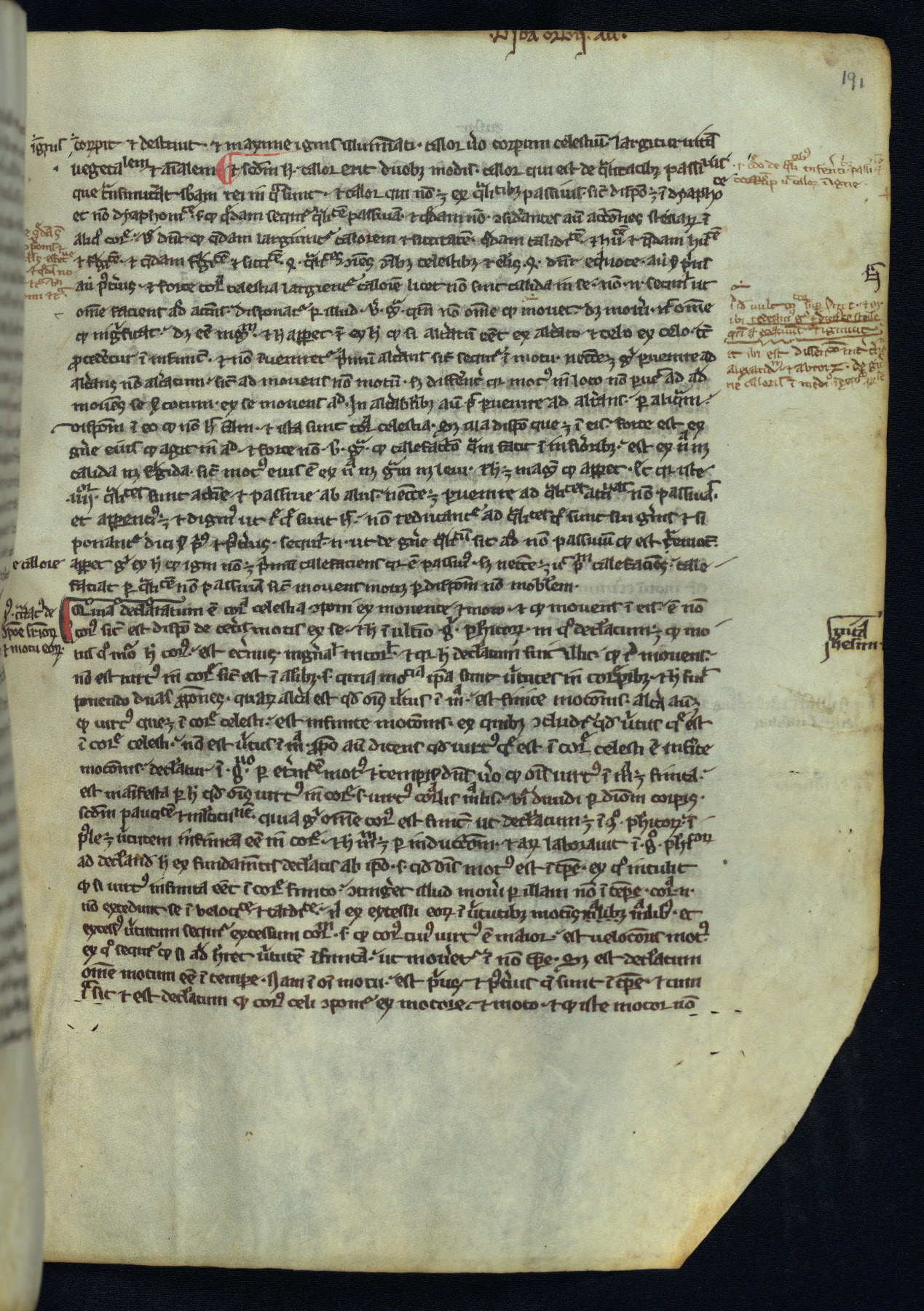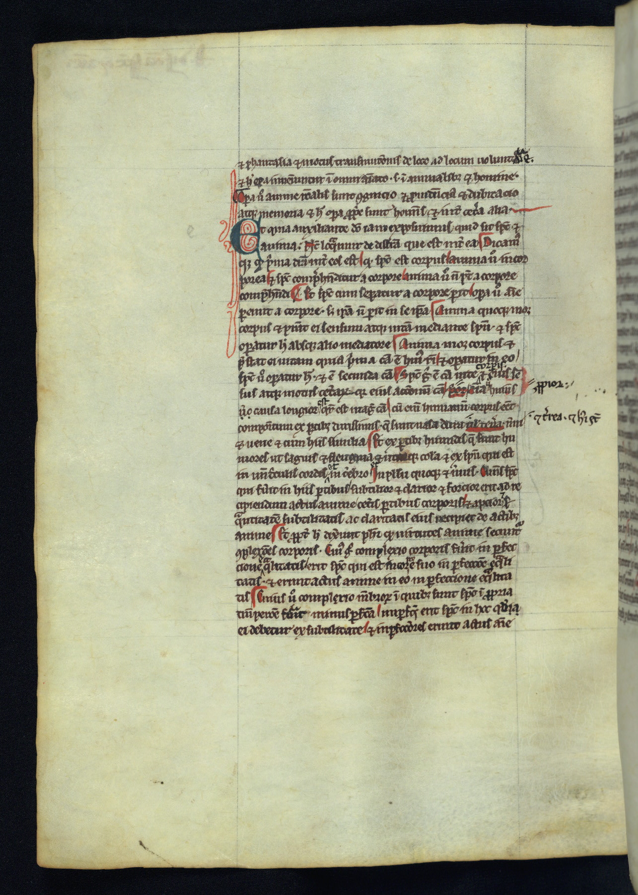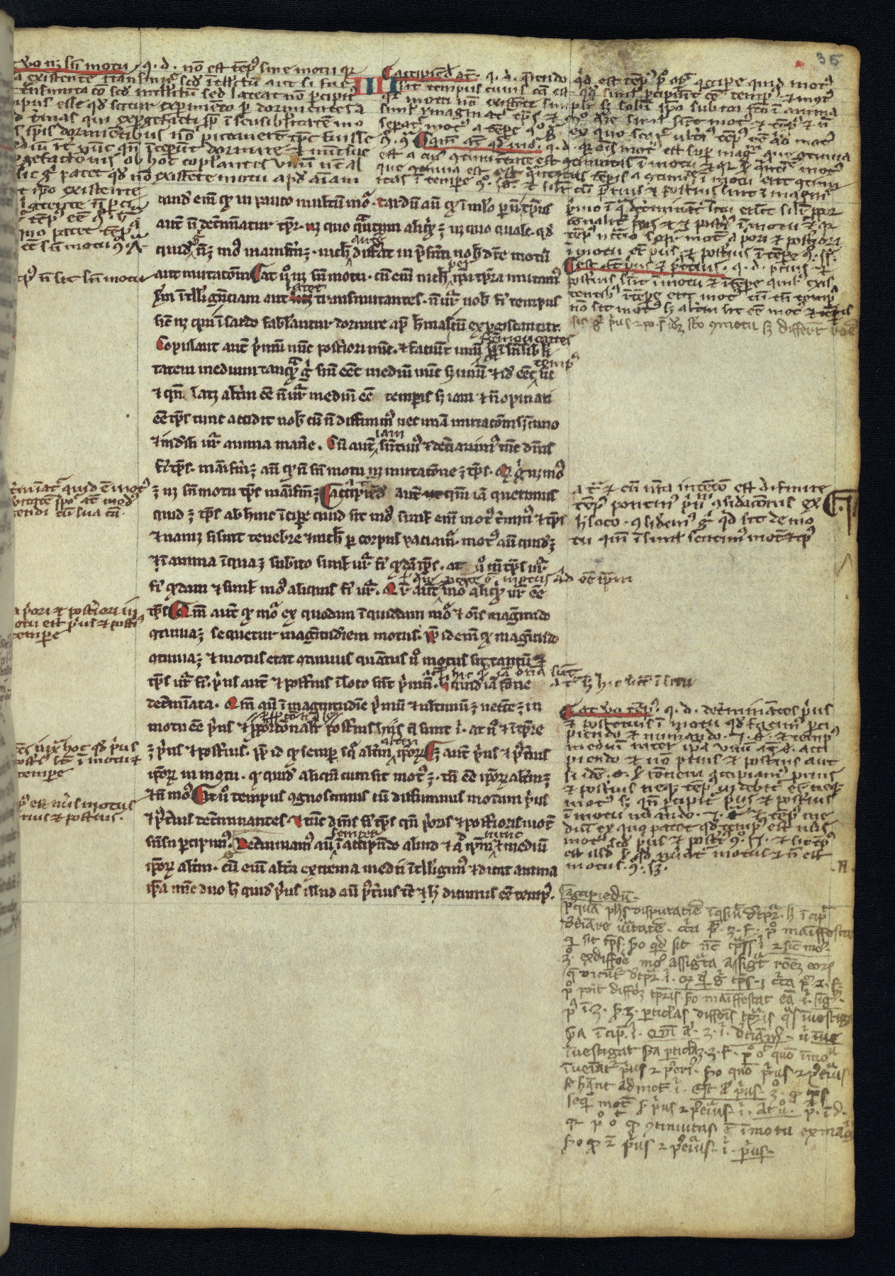 This thirteenth-century scholar’s text appears to be a composite of various smaller booklets, written in a variety of different places and times; the script, layout, and even parchment type change drastically from one section to the next. It contains Latin translations of several scientific works of Aristotle, along with other works by a variety of authors. Those additional authors, who are primarily medieval and represent a wide range of scholars who engaged with Aristotle across both time and place, include Frederick II, Holy Roman Emperor (1194-1250), Alfred of Sareshel (also known as Alfredus Anglicus, a 13th century English scholar), Henricus Aristippus (fl. 1156-1162), Qusṭā ibn Lūqā (ca. 820-912, known as Costa ben Luca), Nicolaus of Damascus (b. 64 BCE), Joannes Hispalensis (12th century), William of Moerbeke (ca. 1215-1286), Averroës (1126-1198), Kindī (d. ca. 873, and name written in text as ysaac filii iacob alchindi), and Rāzī, Abū Bakr Muḥammad ibn Zakarīyā (865?-925?). The majority of the texts, and the abundance of marginal notes and glosses that accompany them, were probably produced in England, France, or Spain, but the last folios and many of the notes seem to be of Italian origin, suggesting a text that was well traveled in addition to being well read.