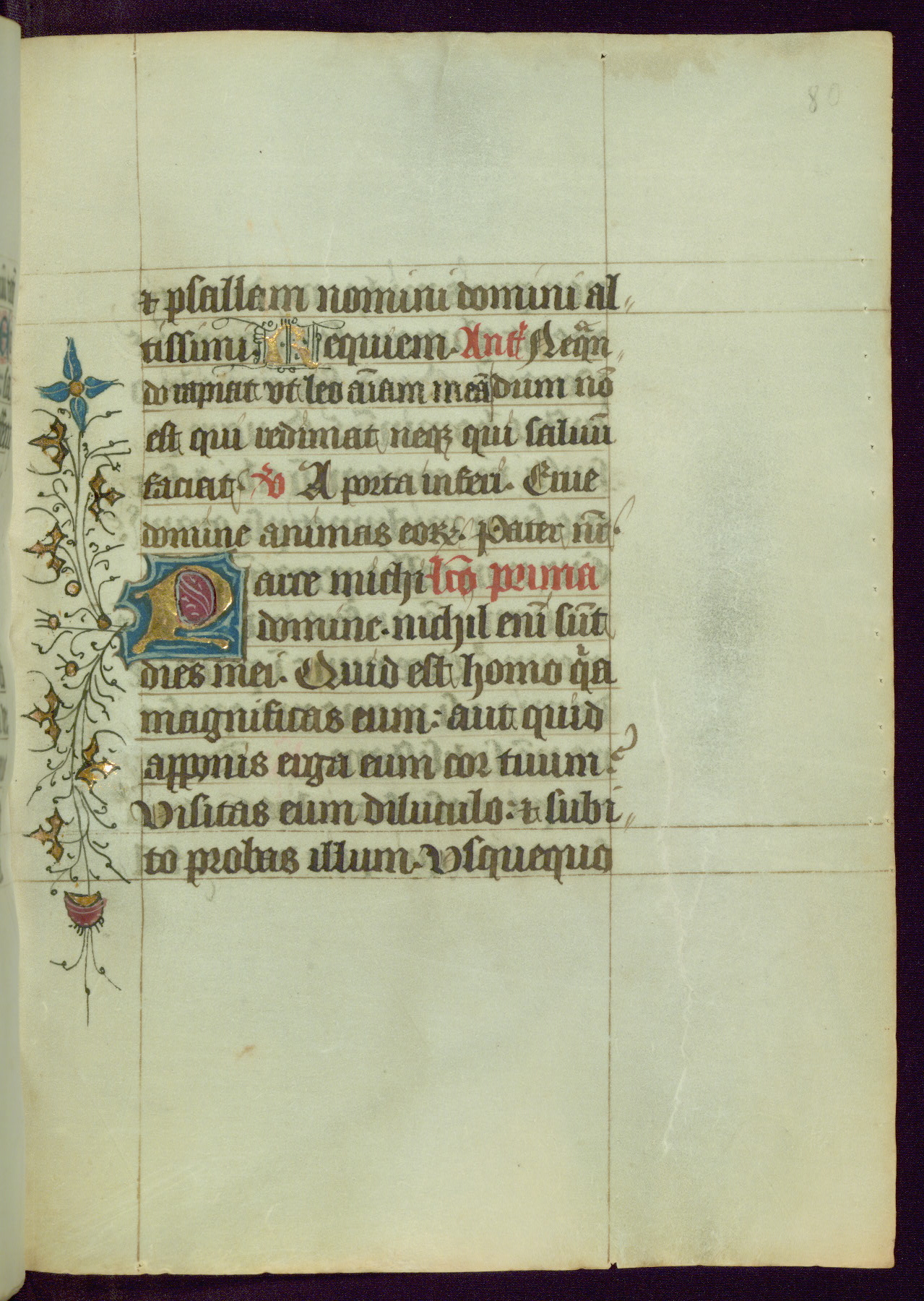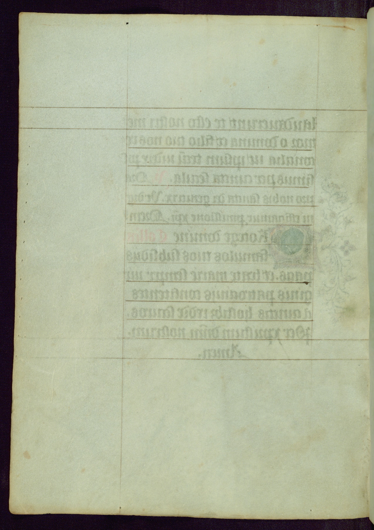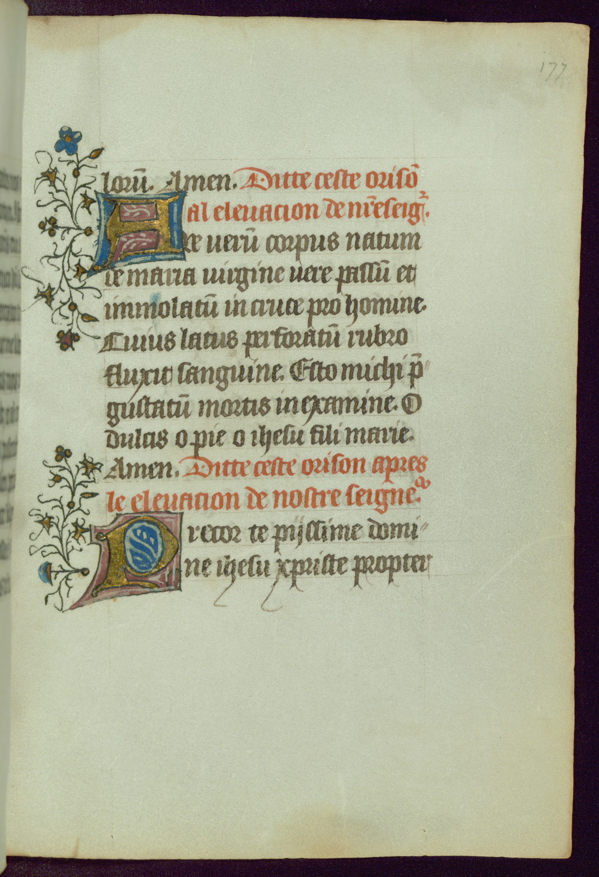 This Book of Hours was completed ca. 1450, illuminated by the Master of Ghent Privileges and associates. The first owner is depicted in the border of fol. 13v as well as arms of the Egmont family of Guelders, found in the margins nearby. On front flyleaf iir, a note indicates that the manuscript was given by Francois de Bonge to an unidentified recipient in memory of a close friend. While many prayers are in Latin, there is a strong presence of French found in rubrics, headings, and several narratives (tales of a canon's dream sequence, the salvation of a nun, and directives for prayers that would result in a vision of the Virgin three days before the supplicant's death) paired with prayers and devotions in Latin.