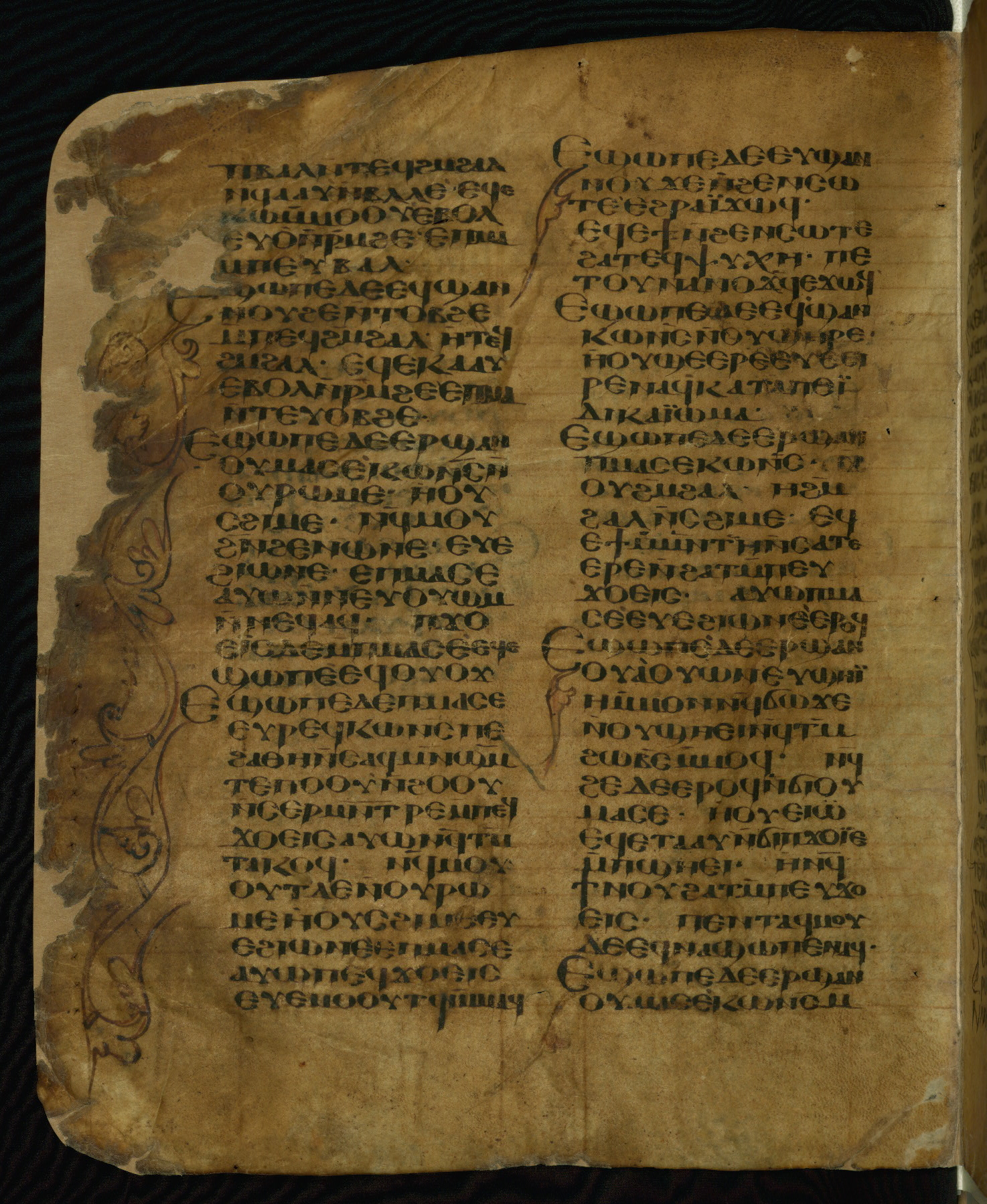 This fragment from the Book of Exodus is a bifolium presenting the text of Exodus 21:16-35a on fol. 1 and 23:5b-21a on fol. 2. The missing text in between these two folios would have constituted another bifolium. Written in Sahidic Coptic script, the biblical manuscript to which the bifolium once belonged was produced in Egypt in the eighth century, probably by a monastic scribe and perhaps in the Fayum or Wadi al-Natrun, where monasteries continued to thrive during the early Islamic conquest. It is difficult to determine the full extent of the manuscript, but a combined volume of Genesis and Exodus as part of a multivolume set of the Bible is certainly possible, if not likely, on the evidence of the Coptic numerals inscribed at the top of each folio side.