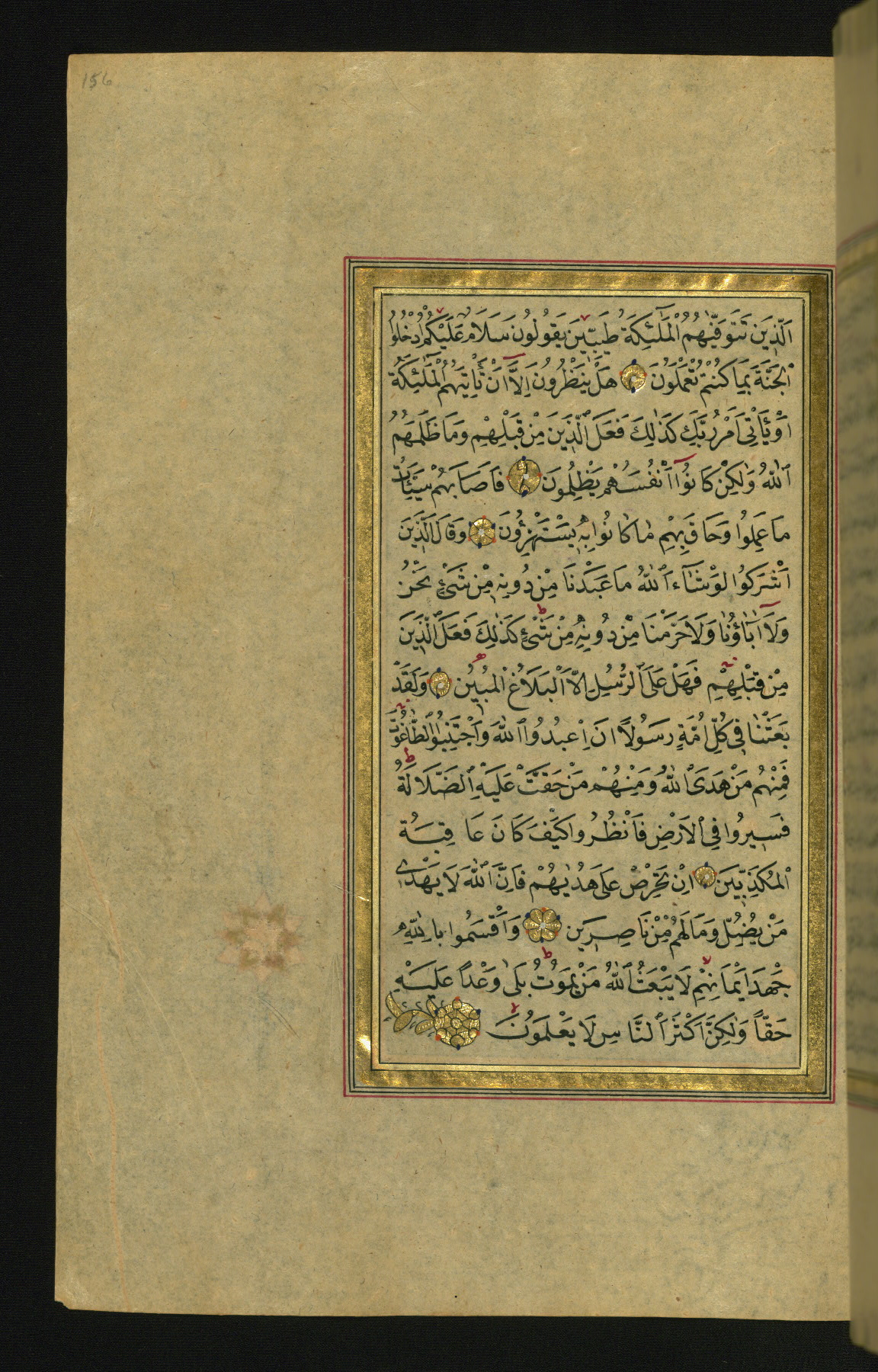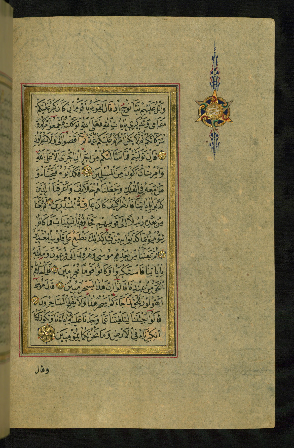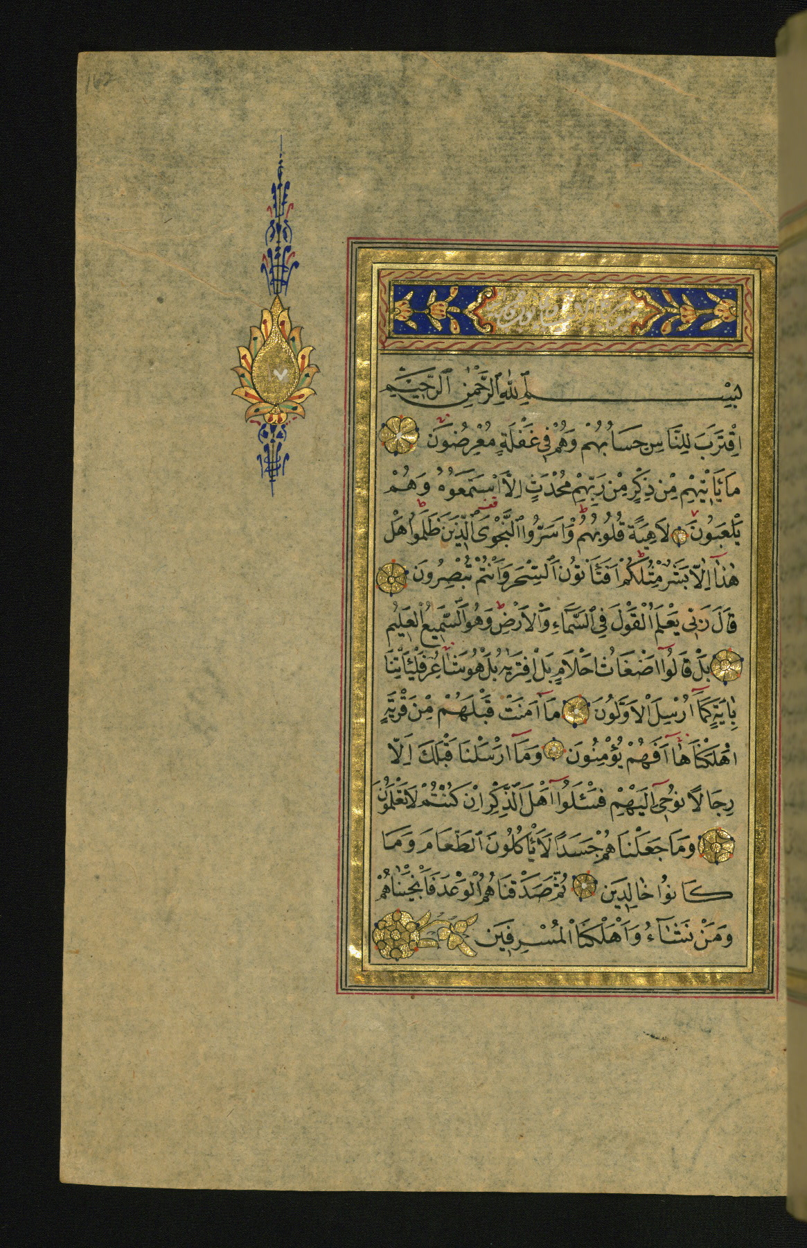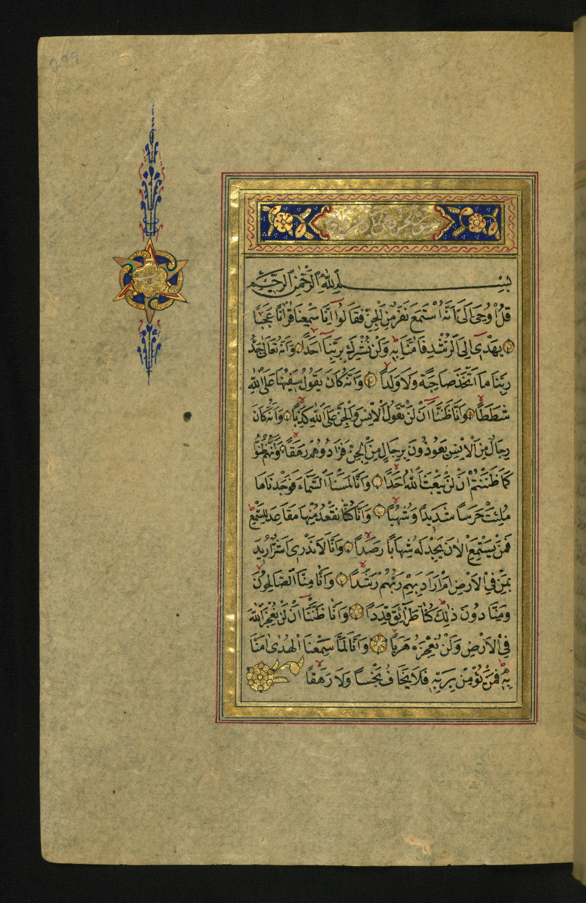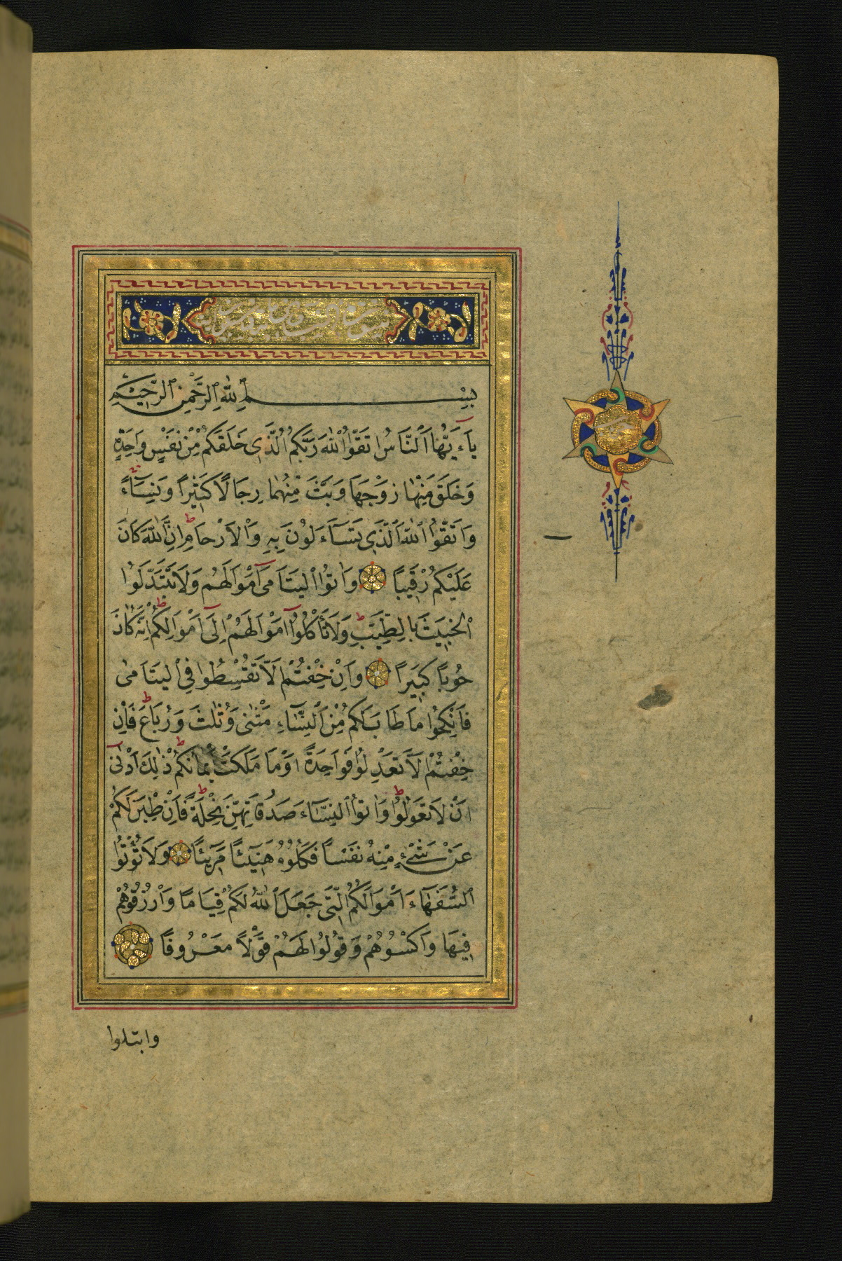 This illuminated copy of the Qur'an was written in naskh script in Istanbul (al-Qusṭanṭinīyah) in 1269 AH / 1853 CE by Muḥammad Ṣāliḥ ibn ʿUmar, a pupil of Amīn al-Bahjat (Behcet). According to the colophon (fol. 257b), the manuscript was finished in Ramaḍān 1269 AH / 1853 CE. The scribe states that he was born in Kūmuljunah (Gümülcine, Komotini in northeastern Greece) and resided in the Madrasat Mulāzimlar, in the vicinity of Ḥammām Sulaymānīyah in al-Qusṭanṭinīyah. The manuscript opens with a double-page illuminated frontispiece of Sūrat al-fātiḥah and the beginning of Sūrat al-baqarah. There are two finispieces: a colophon (misbound at fol. 257b) and a final prayer (fol. 305a). Other illuminated elements include chapter headings and verse markers in the form of illuminated disks and rosettes.