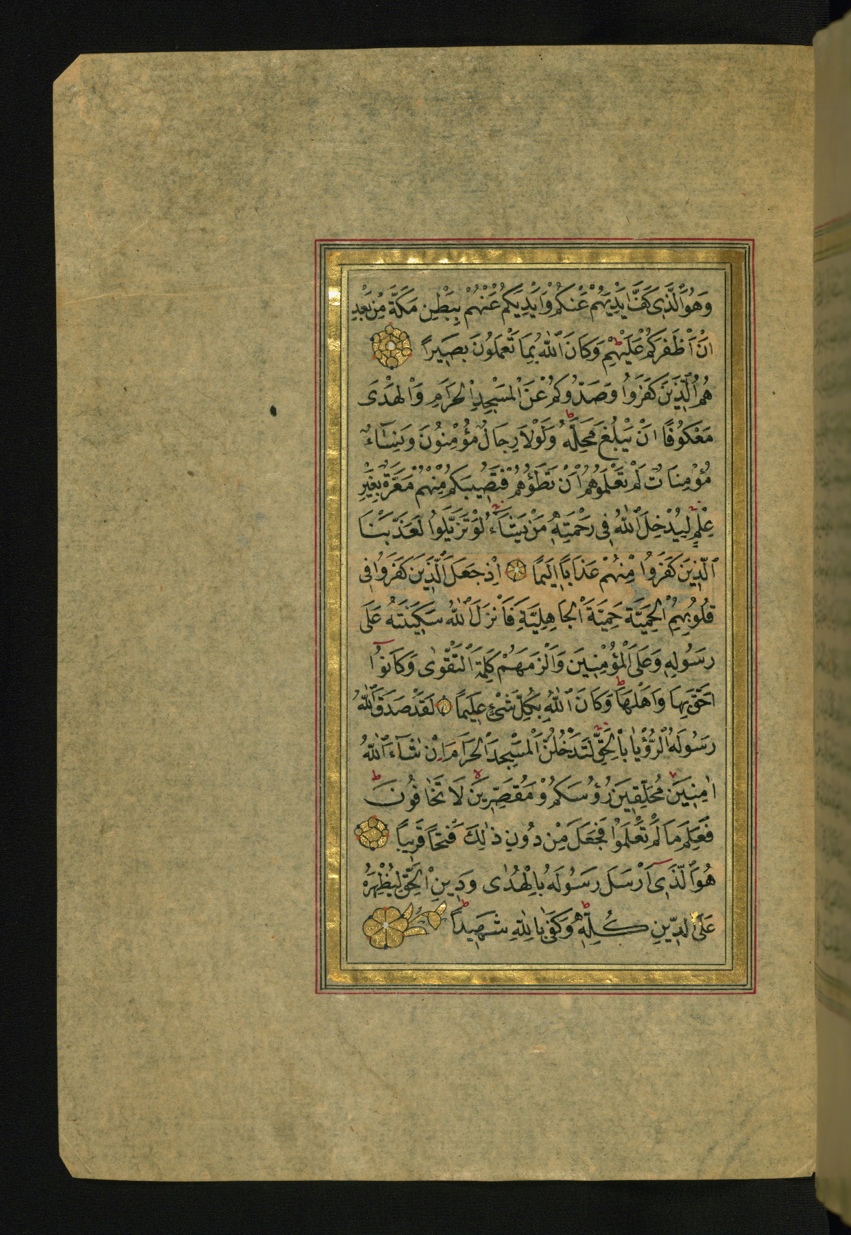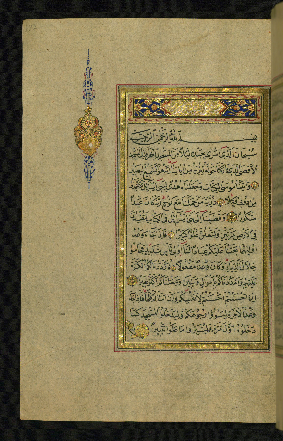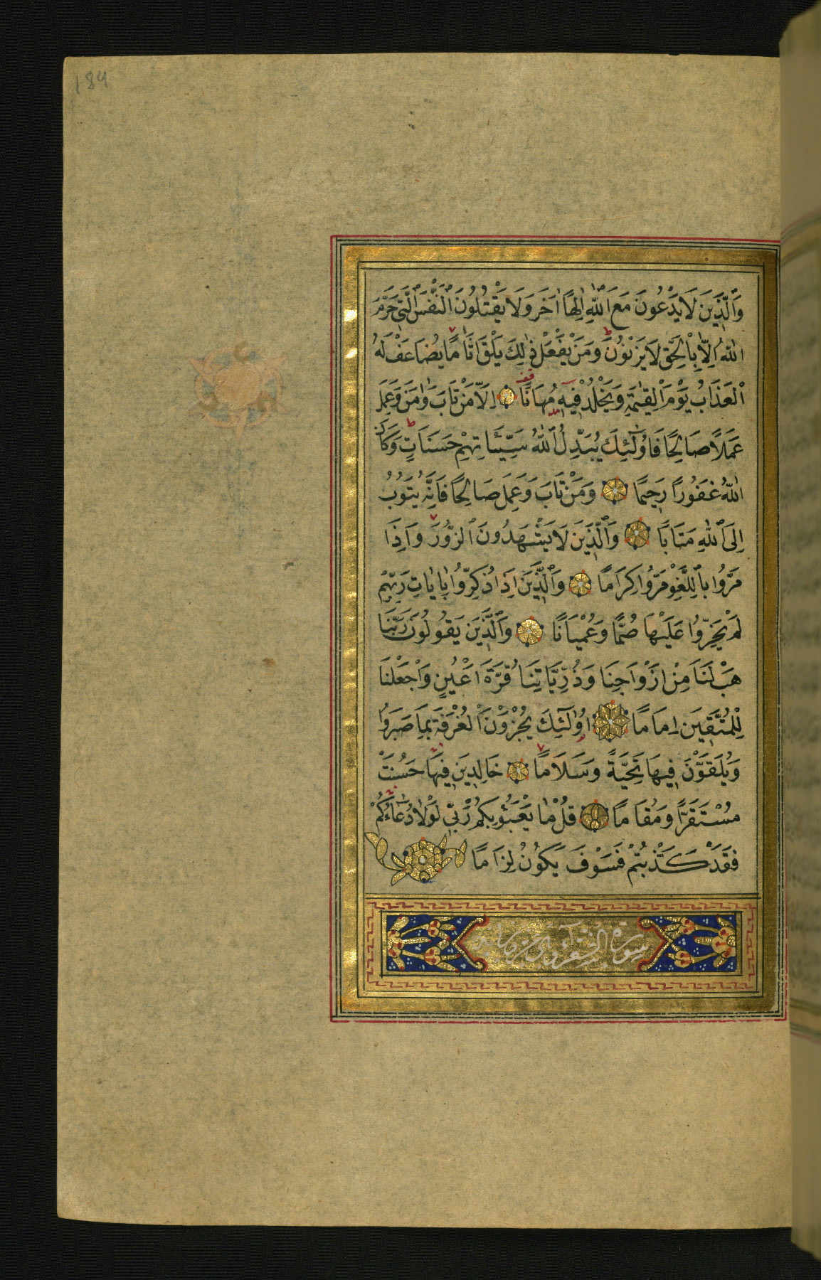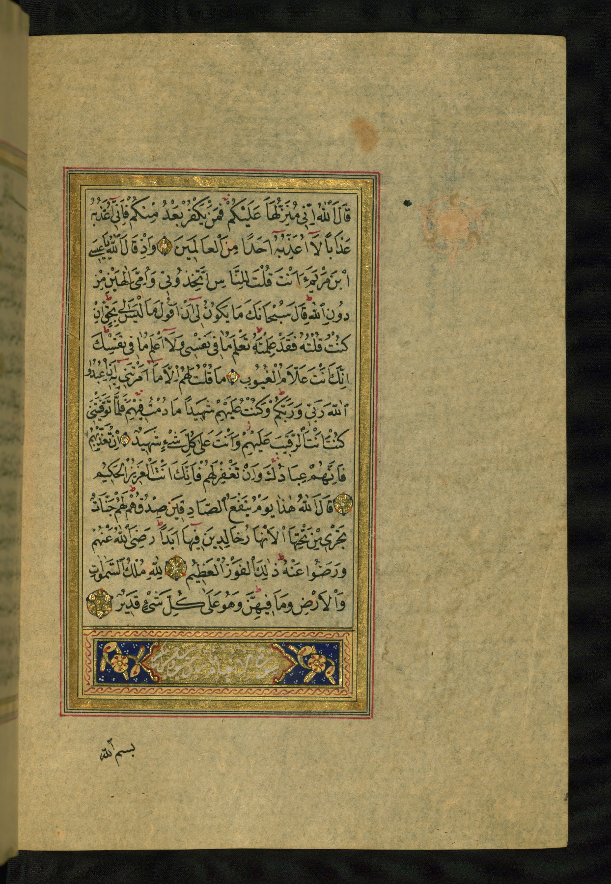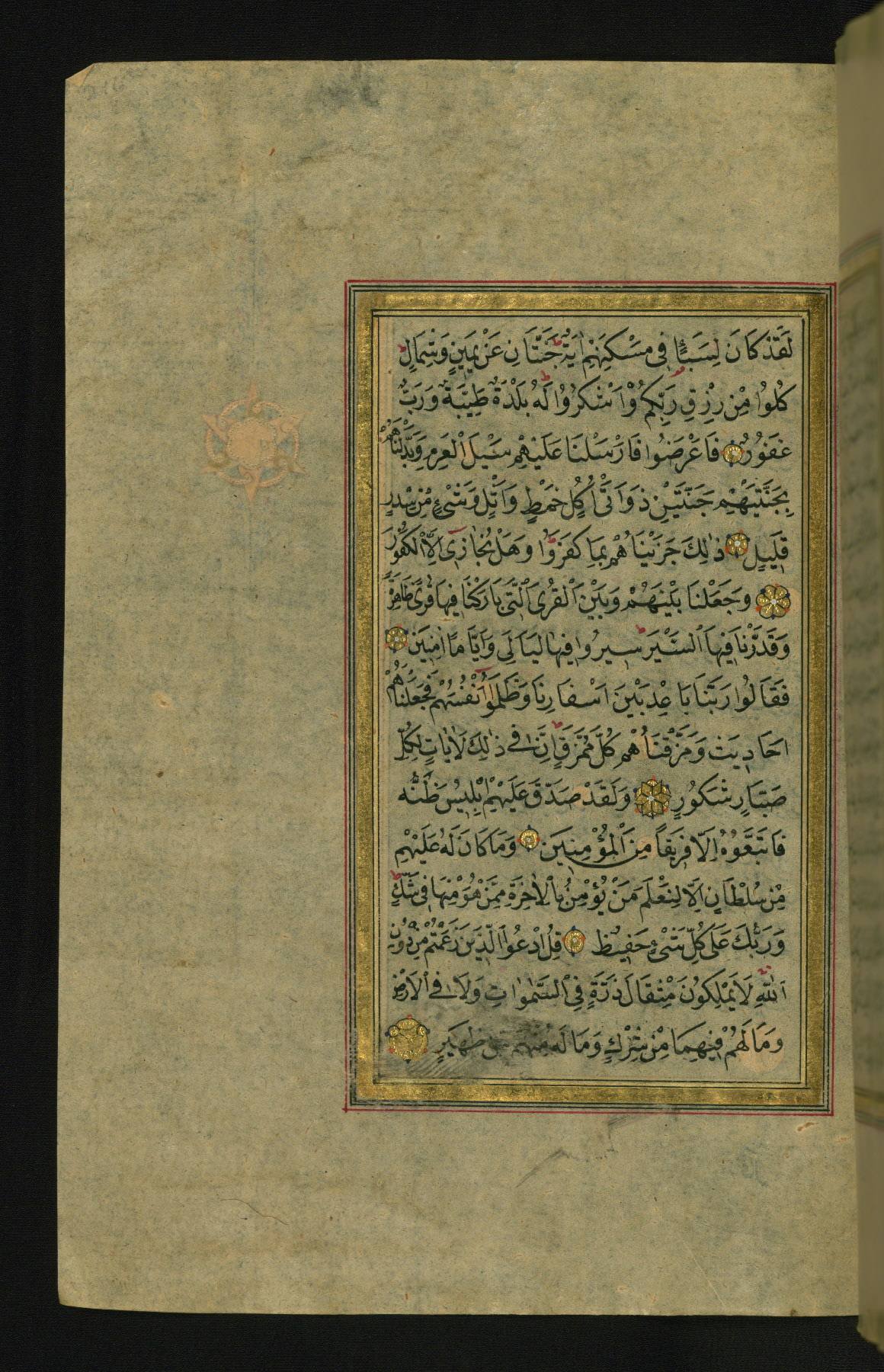 This illuminated copy of the Qur'an was written in naskh script in Istanbul (al-Qusṭanṭinīyah) in 1269 AH / 1853 CE by Muḥammad Ṣāliḥ ibn ʿUmar, a pupil of Amīn al-Bahjat (Behcet). According to the colophon (fol. 257b), the manuscript was finished in Ramaḍān 1269 AH / 1853 CE. The scribe states that he was born in Kūmuljunah (Gümülcine, Komotini in northeastern Greece) and resided in the Madrasat Mulāzimlar, in the vicinity of Ḥammām Sulaymānīyah in al-Qusṭanṭinīyah. The manuscript opens with a double-page illuminated frontispiece of Sūrat al-fātiḥah and the beginning of Sūrat al-baqarah. There are two finispieces: a colophon (misbound at fol. 257b) and a final prayer (fol. 305a). Other illuminated elements include chapter headings and verse markers in the form of illuminated disks and rosettes.