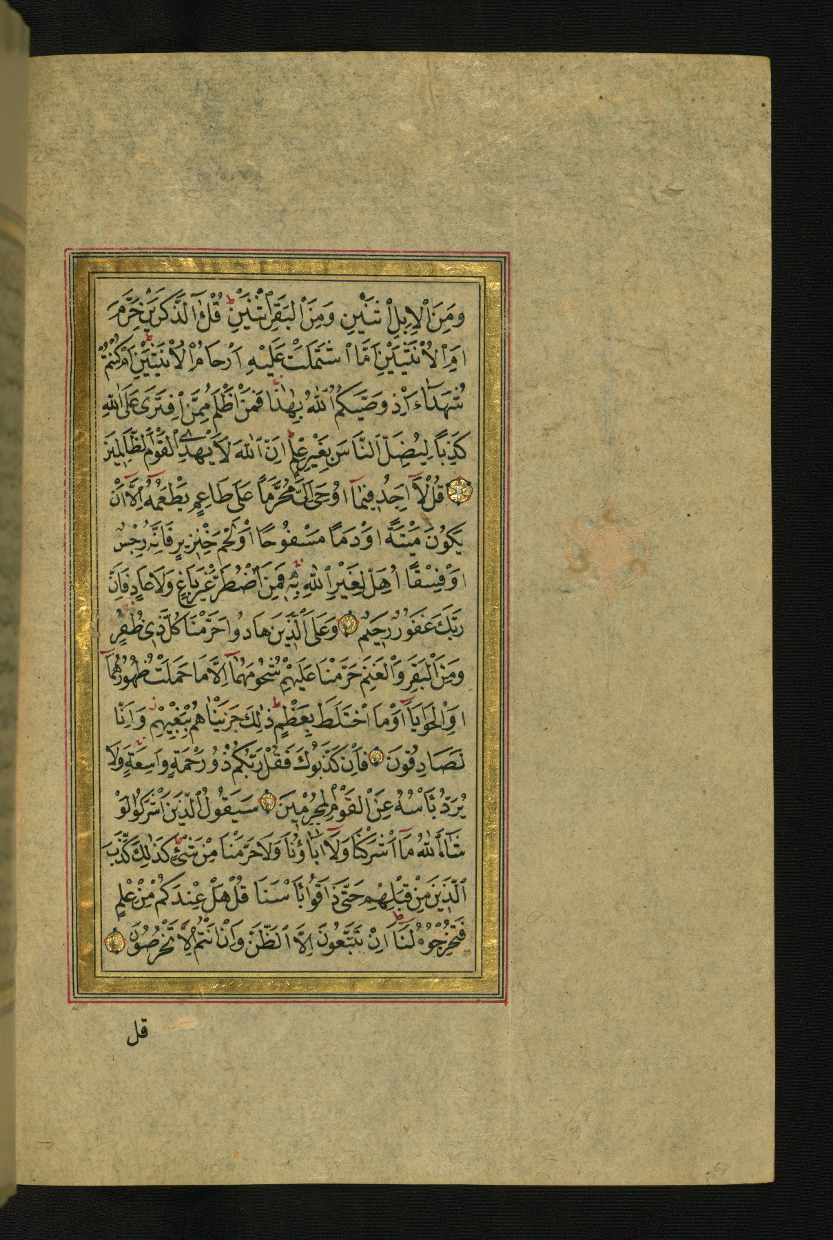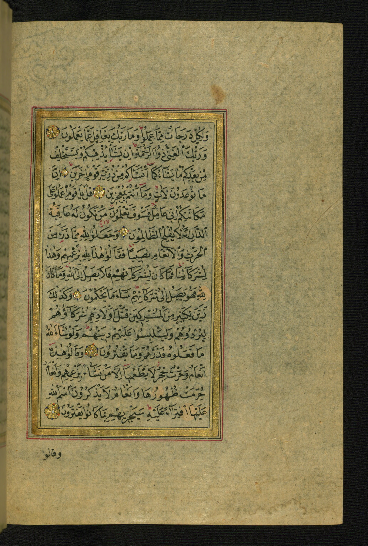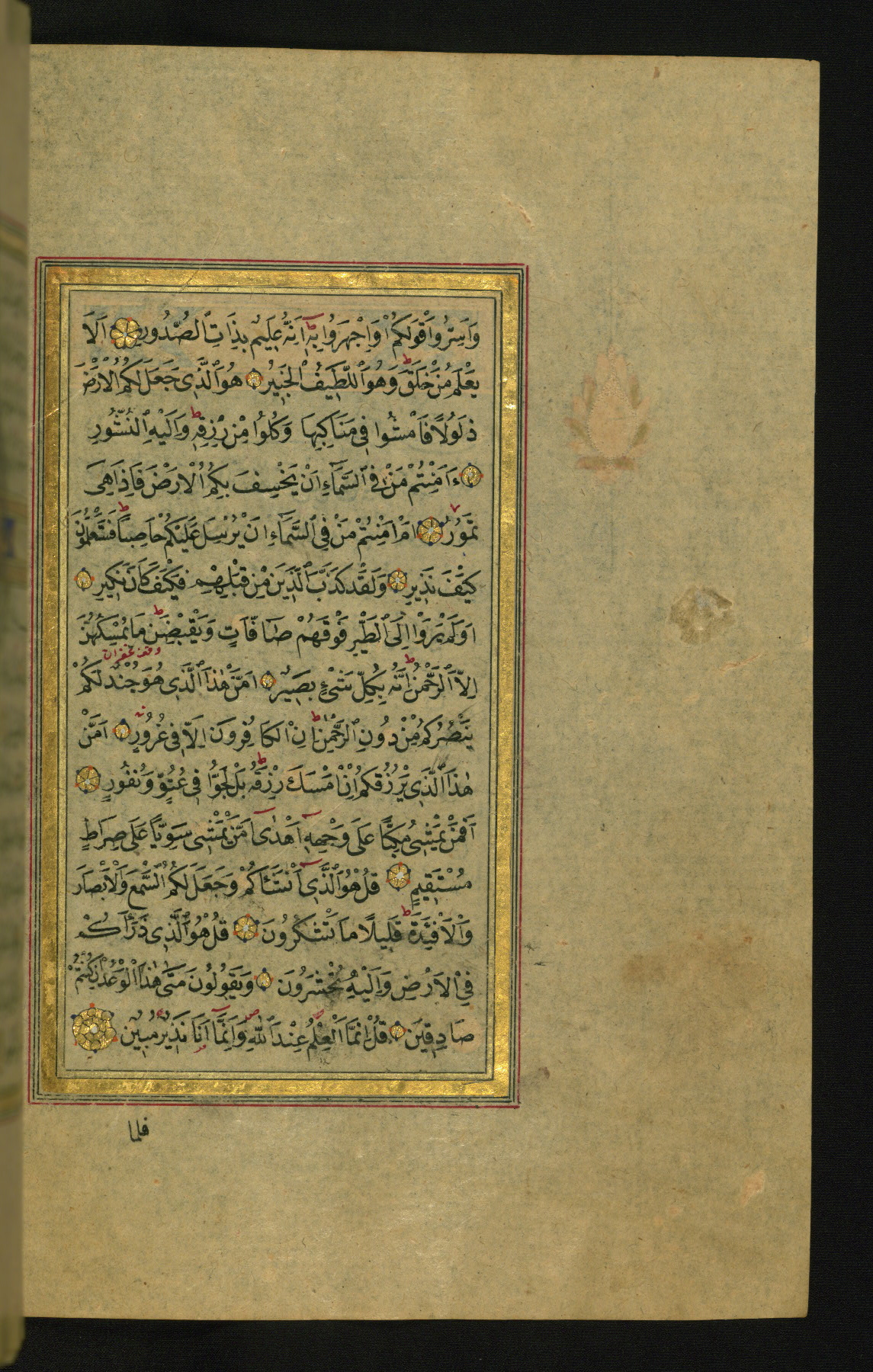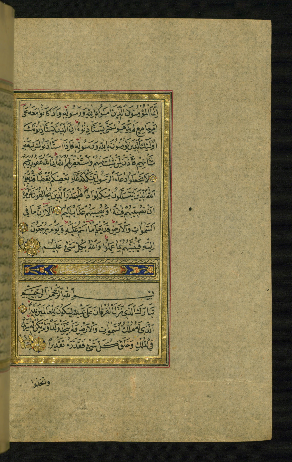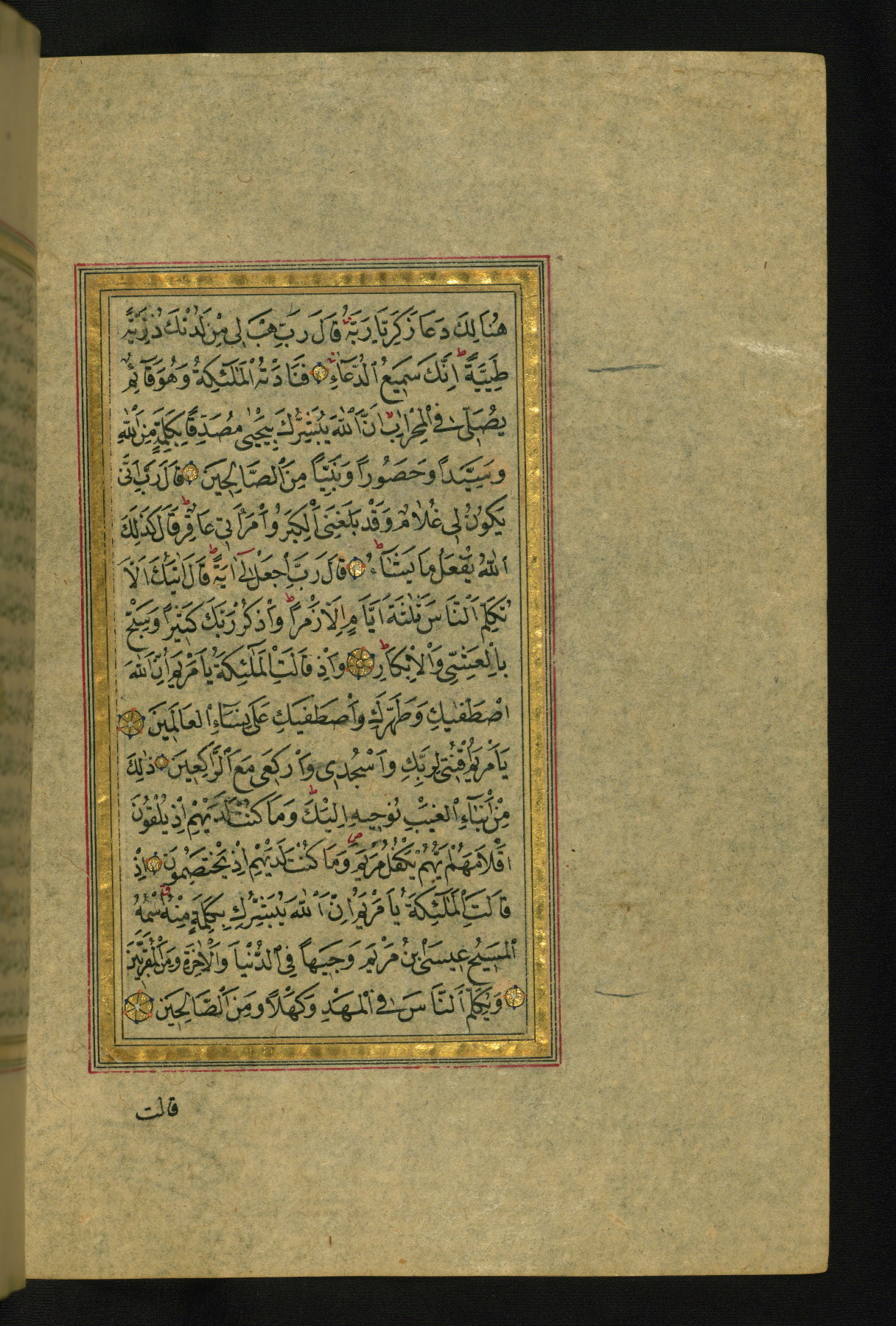 This illuminated copy of the Qur'an was written in naskh script in Istanbul (al-Qusṭanṭinīyah) in 1269 AH / 1853 CE by Muḥammad Ṣāliḥ ibn ʿUmar, a pupil of Amīn al-Bahjat (Behcet). According to the colophon (fol. 257b), the manuscript was finished in Ramaḍān 1269 AH / 1853 CE. The scribe states that he was born in Kūmuljunah (Gümülcine, Komotini in northeastern Greece) and resided in the Madrasat Mulāzimlar, in the vicinity of Ḥammām Sulaymānīyah in al-Qusṭanṭinīyah. The manuscript opens with a double-page illuminated frontispiece of Sūrat al-fātiḥah and the beginning of Sūrat al-baqarah. There are two finispieces: a colophon (misbound at fol. 257b) and a final prayer (fol. 305a). Other illuminated elements include chapter headings and verse markers in the form of illuminated disks and rosettes.