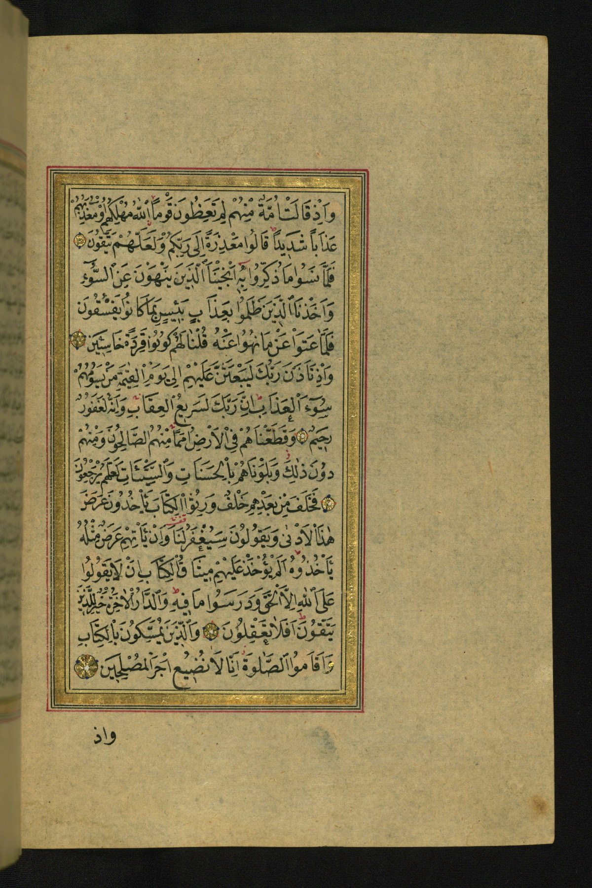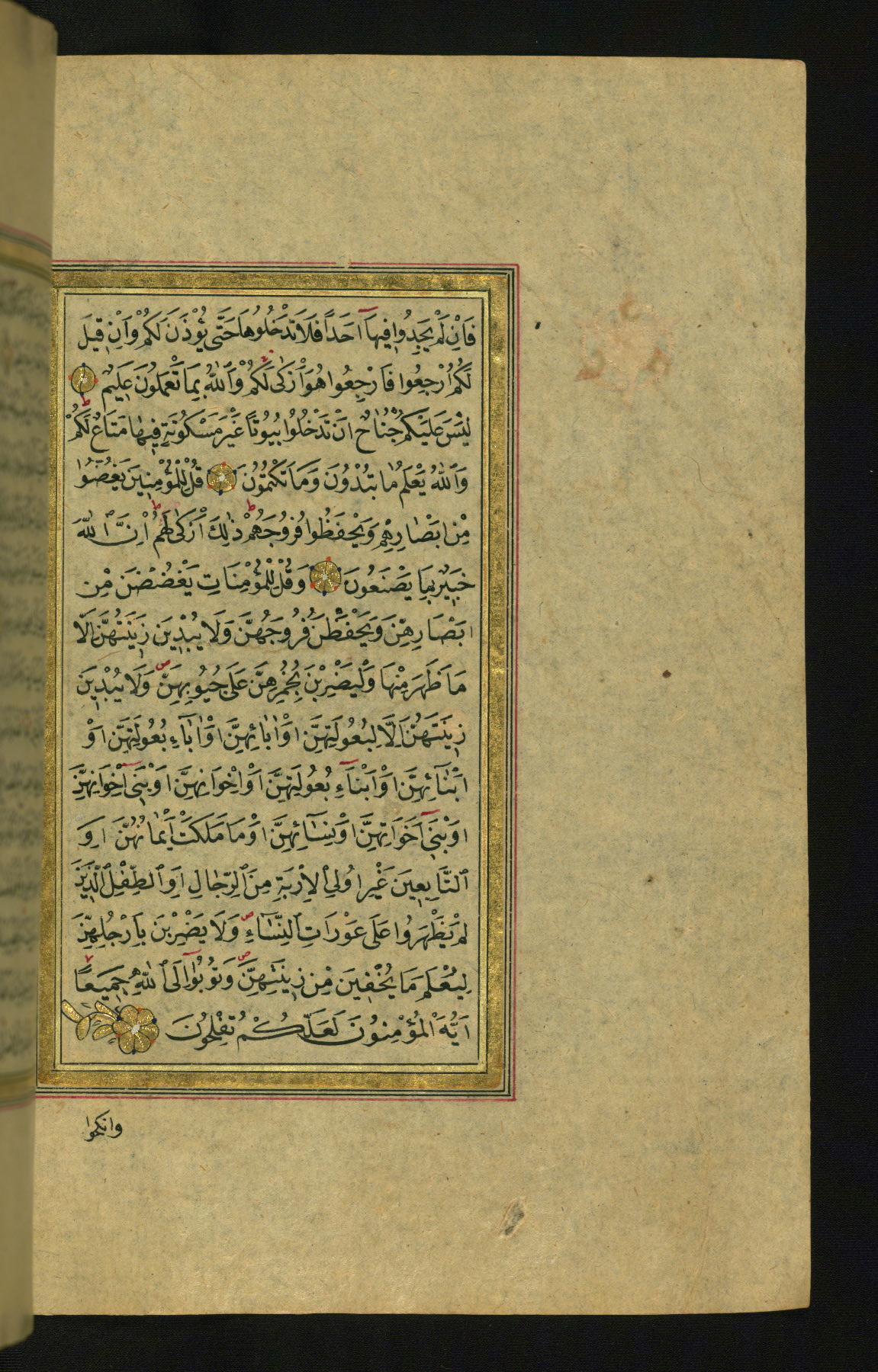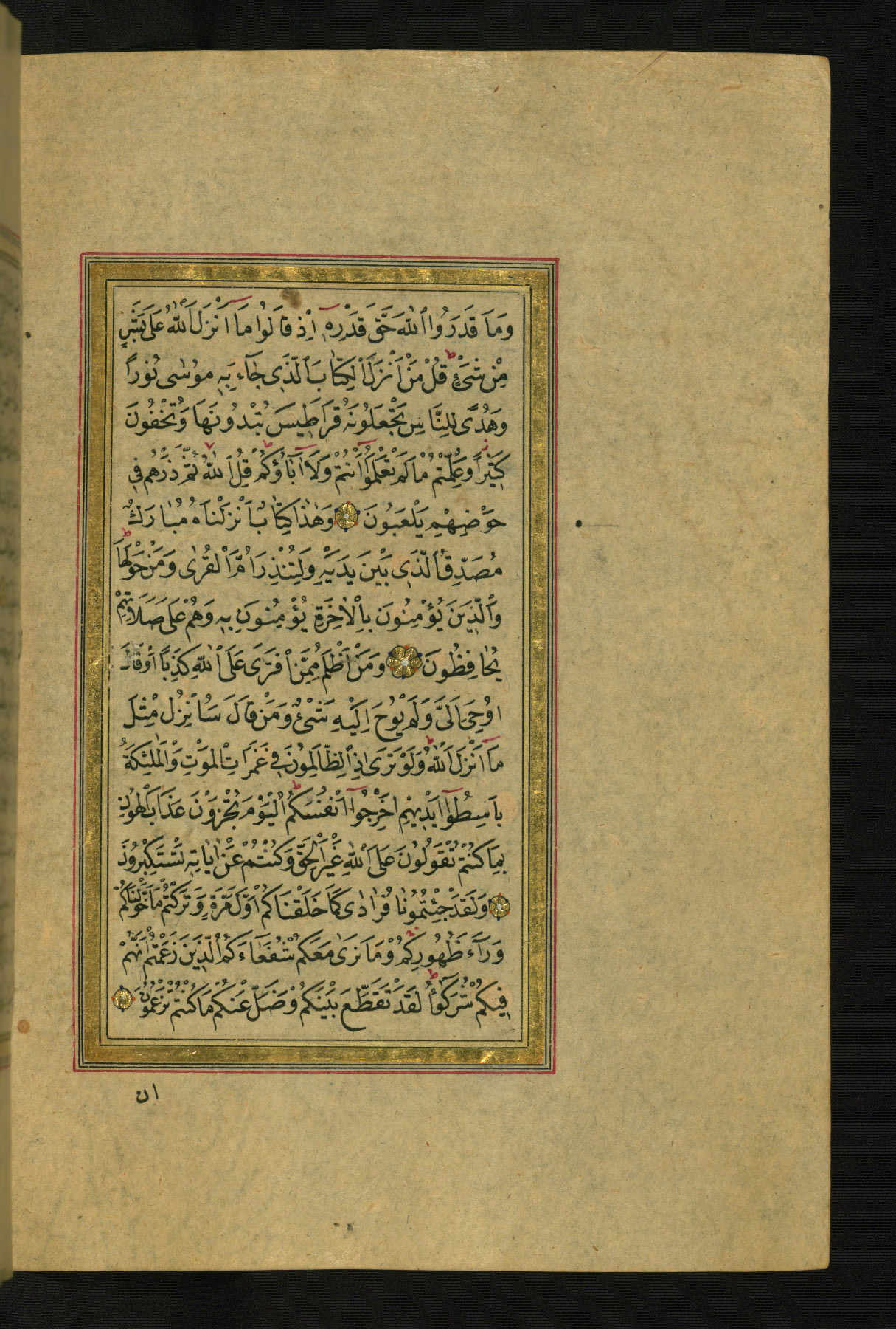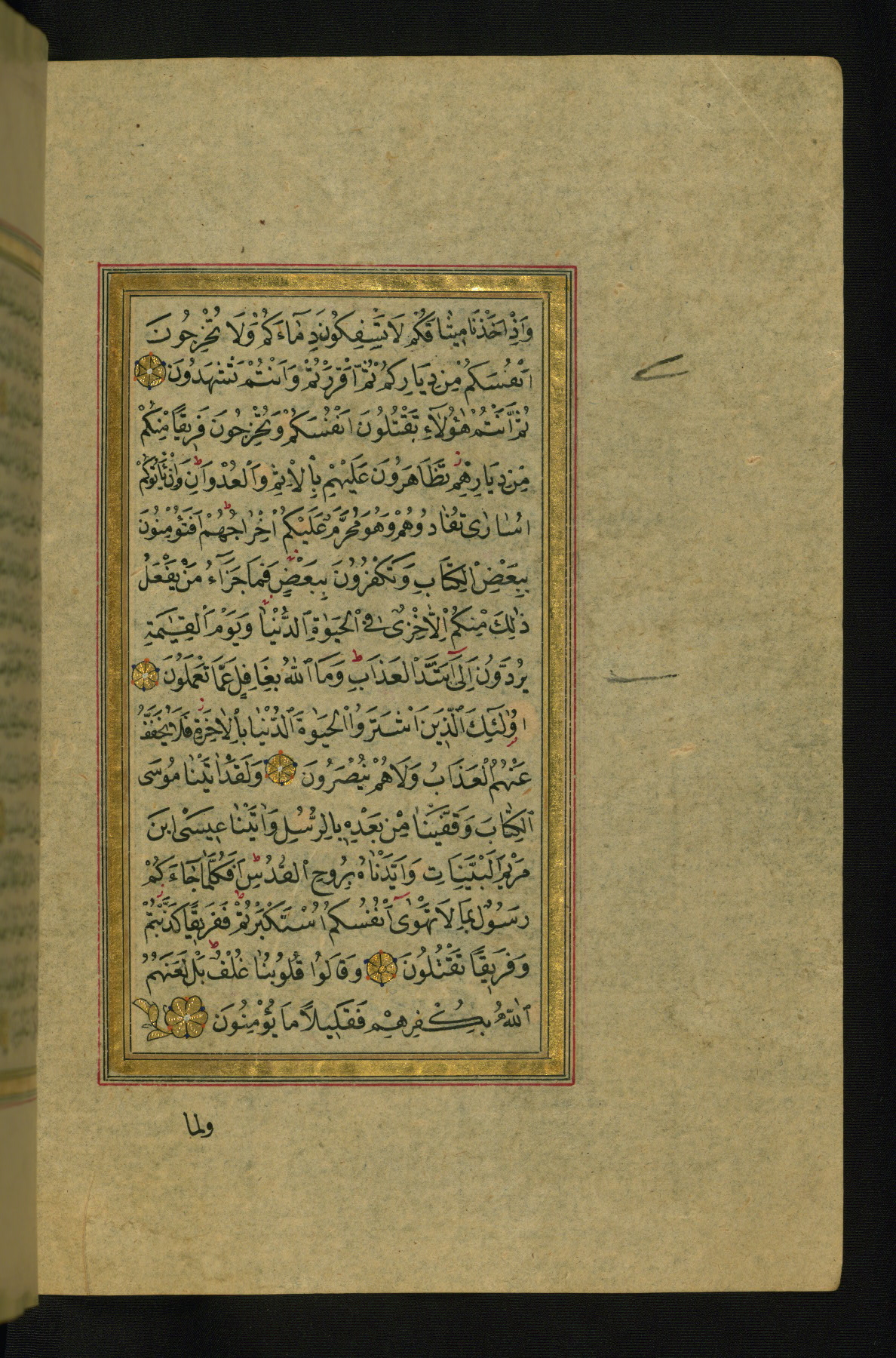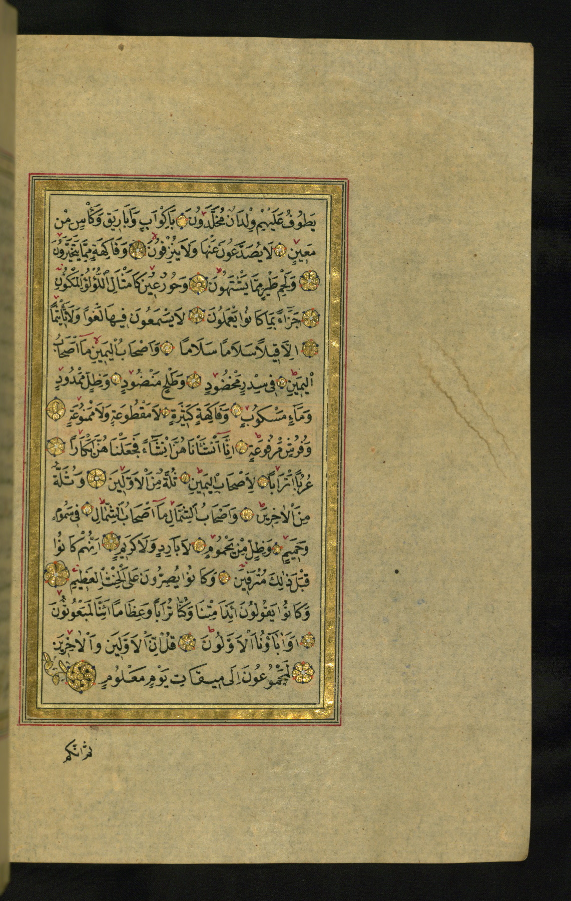 This illuminated copy of the Qur'an was written in naskh script in Istanbul (al-Qusṭanṭinīyah) in 1269 AH / 1853 CE by Muḥammad Ṣāliḥ ibn ʿUmar, a pupil of Amīn al-Bahjat (Behcet). According to the colophon (fol. 257b), the manuscript was finished in Ramaḍān 1269 AH / 1853 CE. The scribe states that he was born in Kūmuljunah (Gümülcine, Komotini in northeastern Greece) and resided in the Madrasat Mulāzimlar, in the vicinity of Ḥammām Sulaymānīyah in al-Qusṭanṭinīyah. The manuscript opens with a double-page illuminated frontispiece of Sūrat al-fātiḥah and the beginning of Sūrat al-baqarah. There are two finispieces: a colophon (misbound at fol. 257b) and a final prayer (fol. 305a). Other illuminated elements include chapter headings and verse markers in the form of illuminated disks and rosettes.