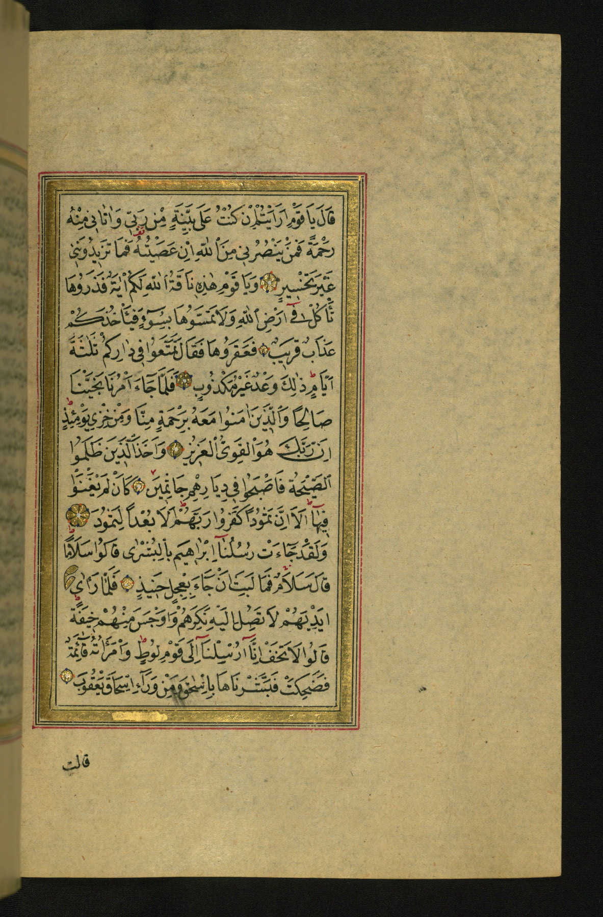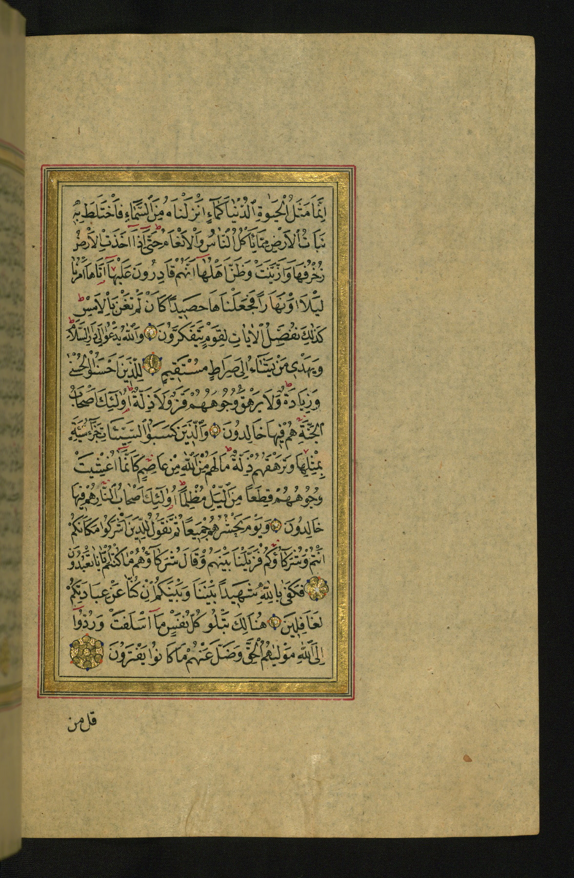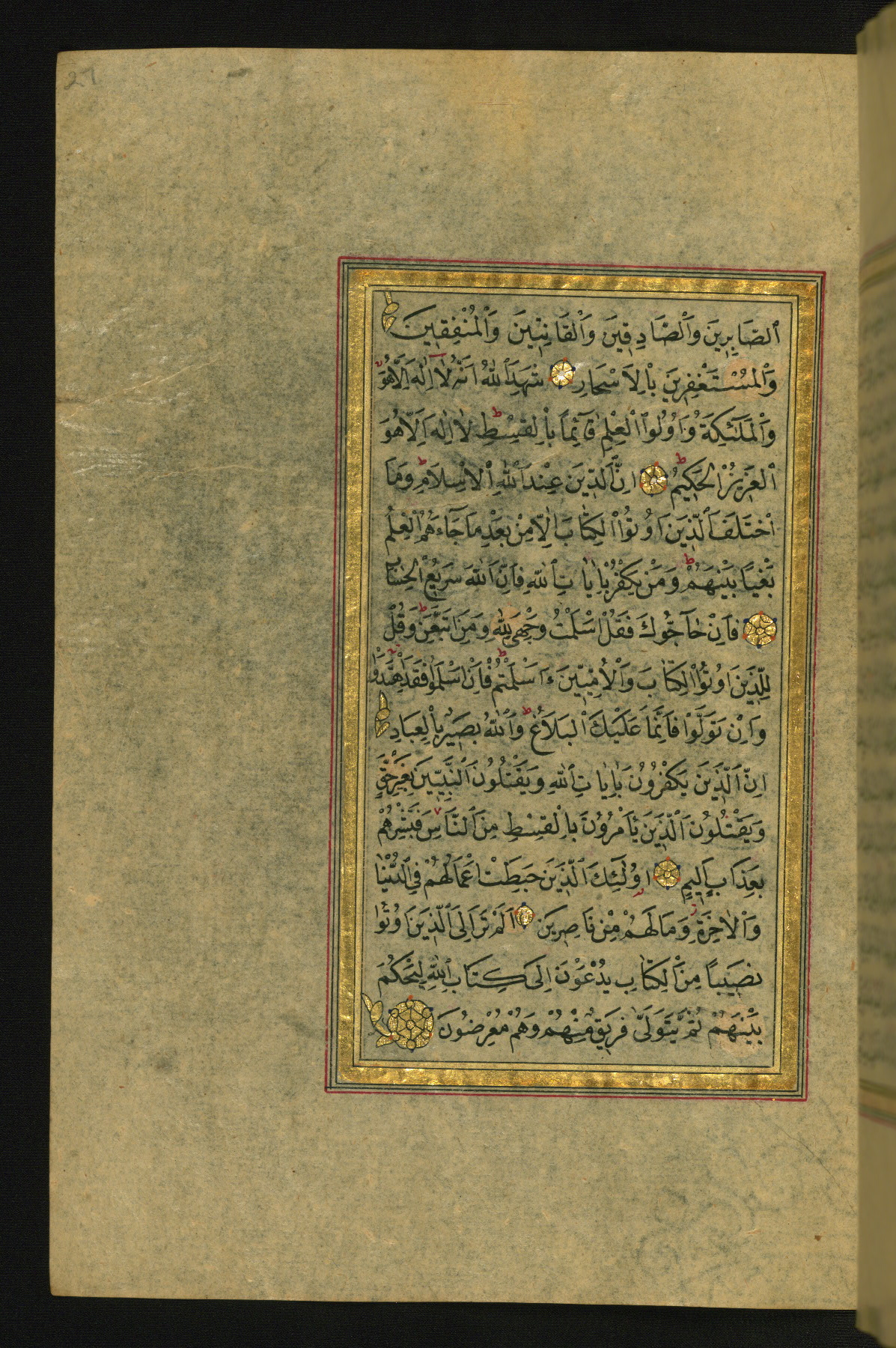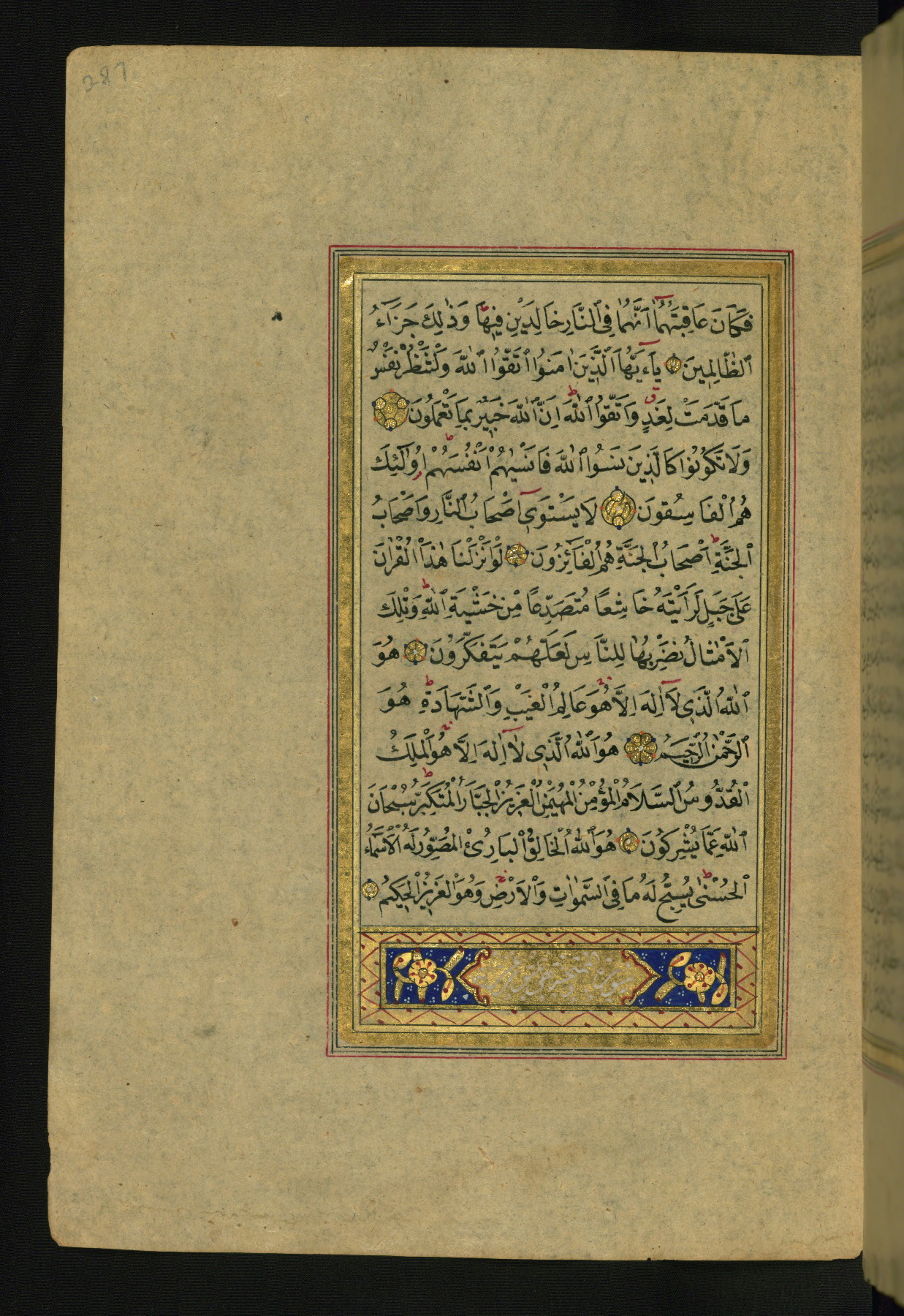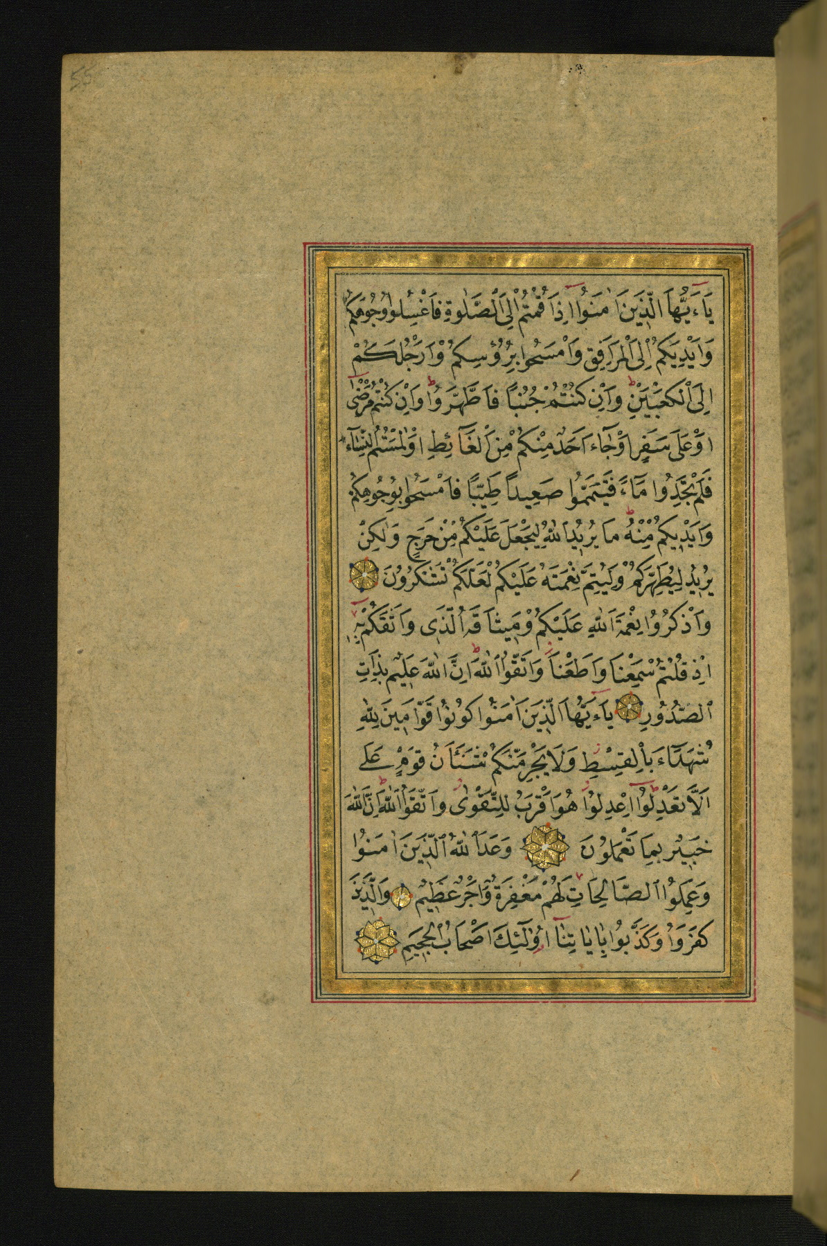 This illuminated copy of the Qur'an was written in naskh script in Istanbul (al-Qusṭanṭinīyah) in 1269 AH / 1853 CE by Muḥammad Ṣāliḥ ibn ʿUmar, a pupil of Amīn al-Bahjat (Behcet). According to the colophon (fol. 257b), the manuscript was finished in Ramaḍān 1269 AH / 1853 CE. The scribe states that he was born in Kūmuljunah (Gümülcine, Komotini in northeastern Greece) and resided in the Madrasat Mulāzimlar, in the vicinity of Ḥammām Sulaymānīyah in al-Qusṭanṭinīyah. The manuscript opens with a double-page illuminated frontispiece of Sūrat al-fātiḥah and the beginning of Sūrat al-baqarah. There are two finispieces: a colophon (misbound at fol. 257b) and a final prayer (fol. 305a). Other illuminated elements include chapter headings and verse markers in the form of illuminated disks and rosettes.
