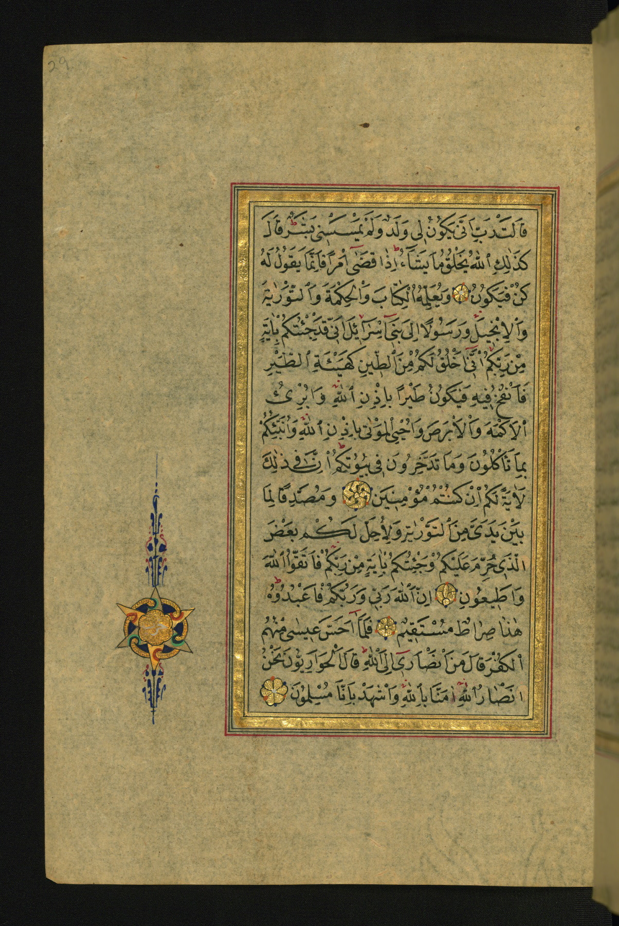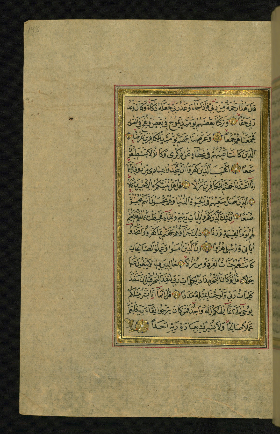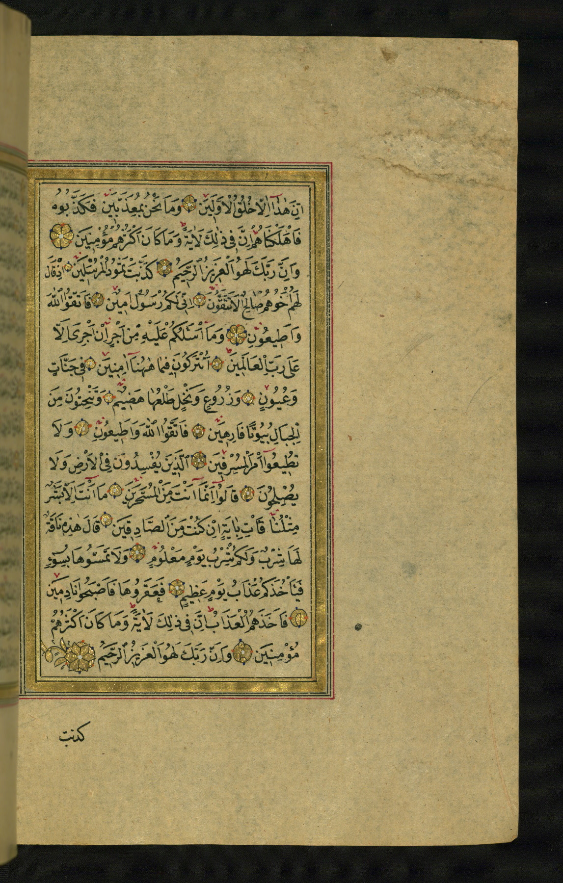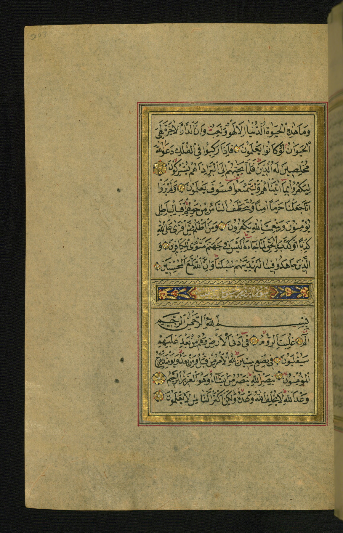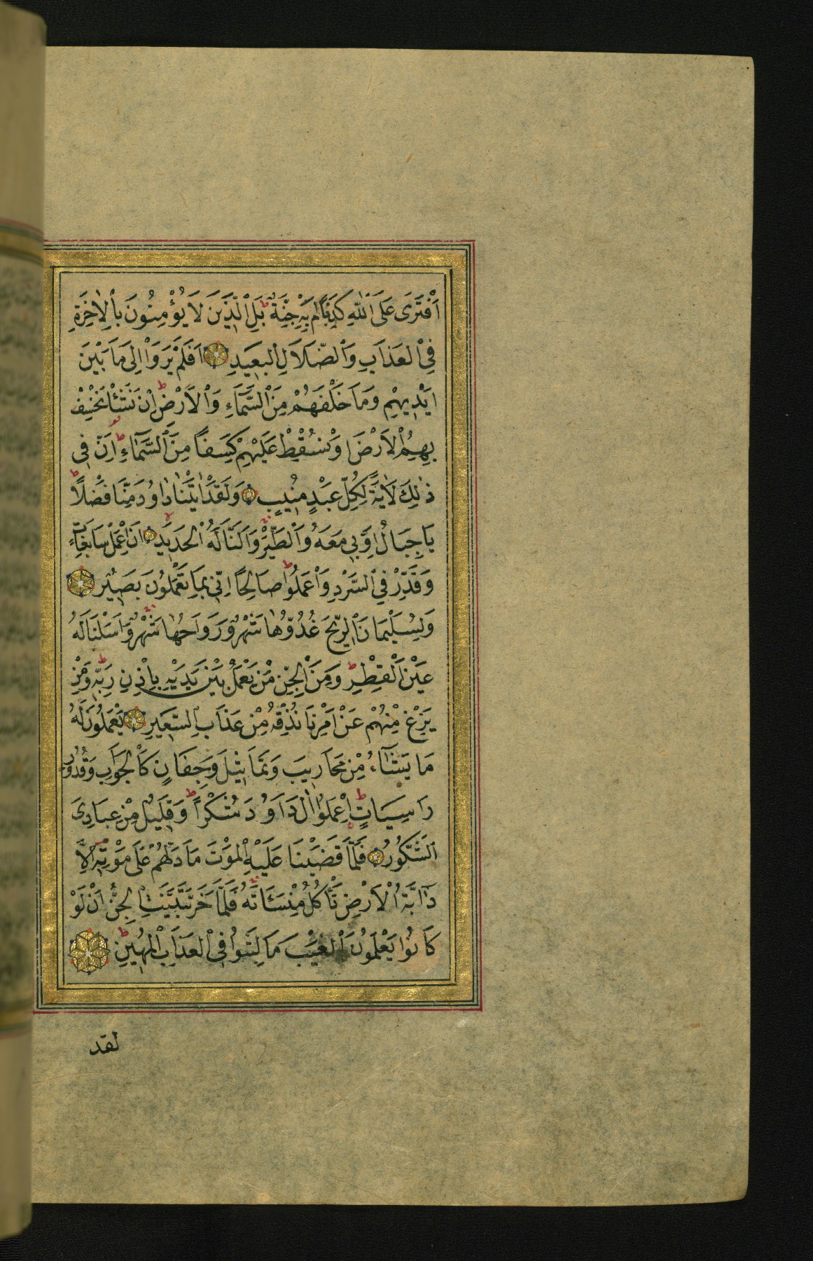 This illuminated copy of the Qur'an was written in naskh script in Istanbul (al-Qusṭanṭinīyah) in 1269 AH / 1853 CE by Muḥammad Ṣāliḥ ibn ʿUmar, a pupil of Amīn al-Bahjat (Behcet). According to the colophon (fol. 257b), the manuscript was finished in Ramaḍān 1269 AH / 1853 CE. The scribe states that he was born in Kūmuljunah (Gümülcine, Komotini in northeastern Greece) and resided in the Madrasat Mulāzimlar, in the vicinity of Ḥammām Sulaymānīyah in al-Qusṭanṭinīyah. The manuscript opens with a double-page illuminated frontispiece of Sūrat al-fātiḥah and the beginning of Sūrat al-baqarah. There are two finispieces: a colophon (misbound at fol. 257b) and a final prayer (fol. 305a). Other illuminated elements include chapter headings and verse markers in the form of illuminated disks and rosettes.