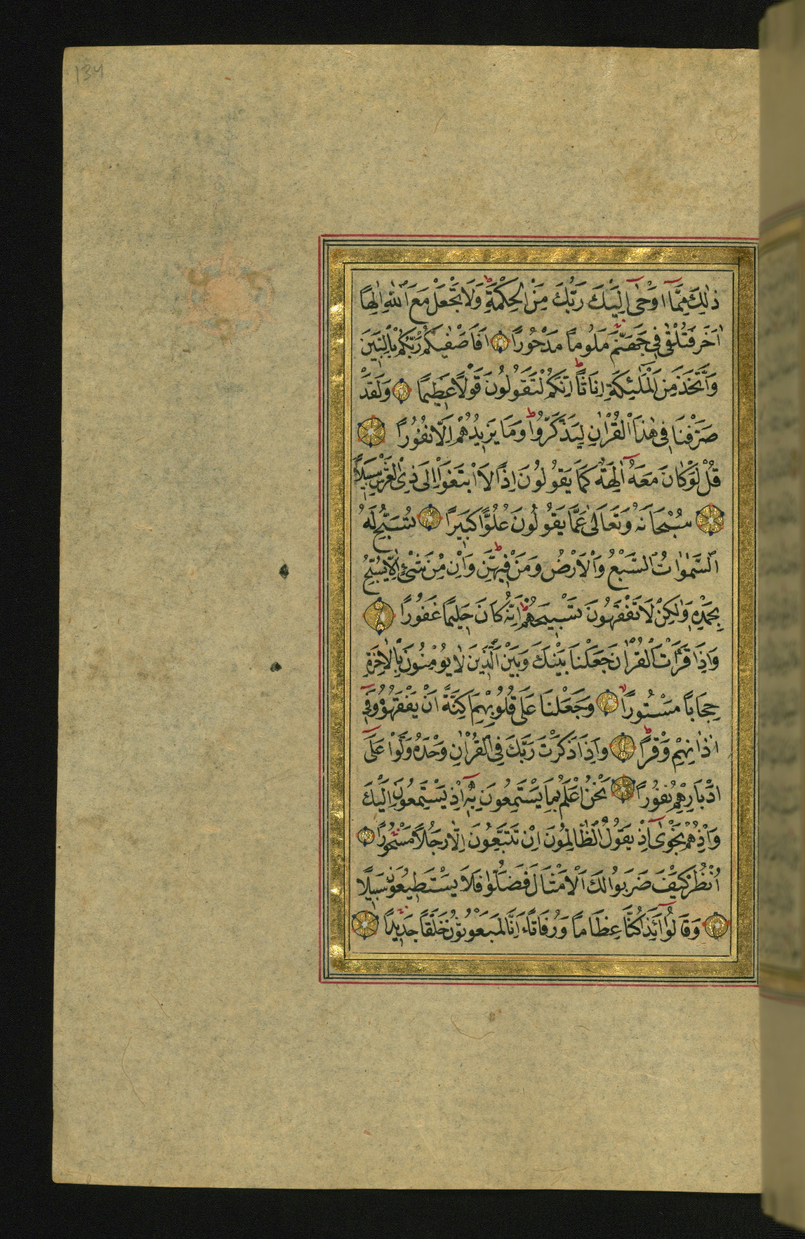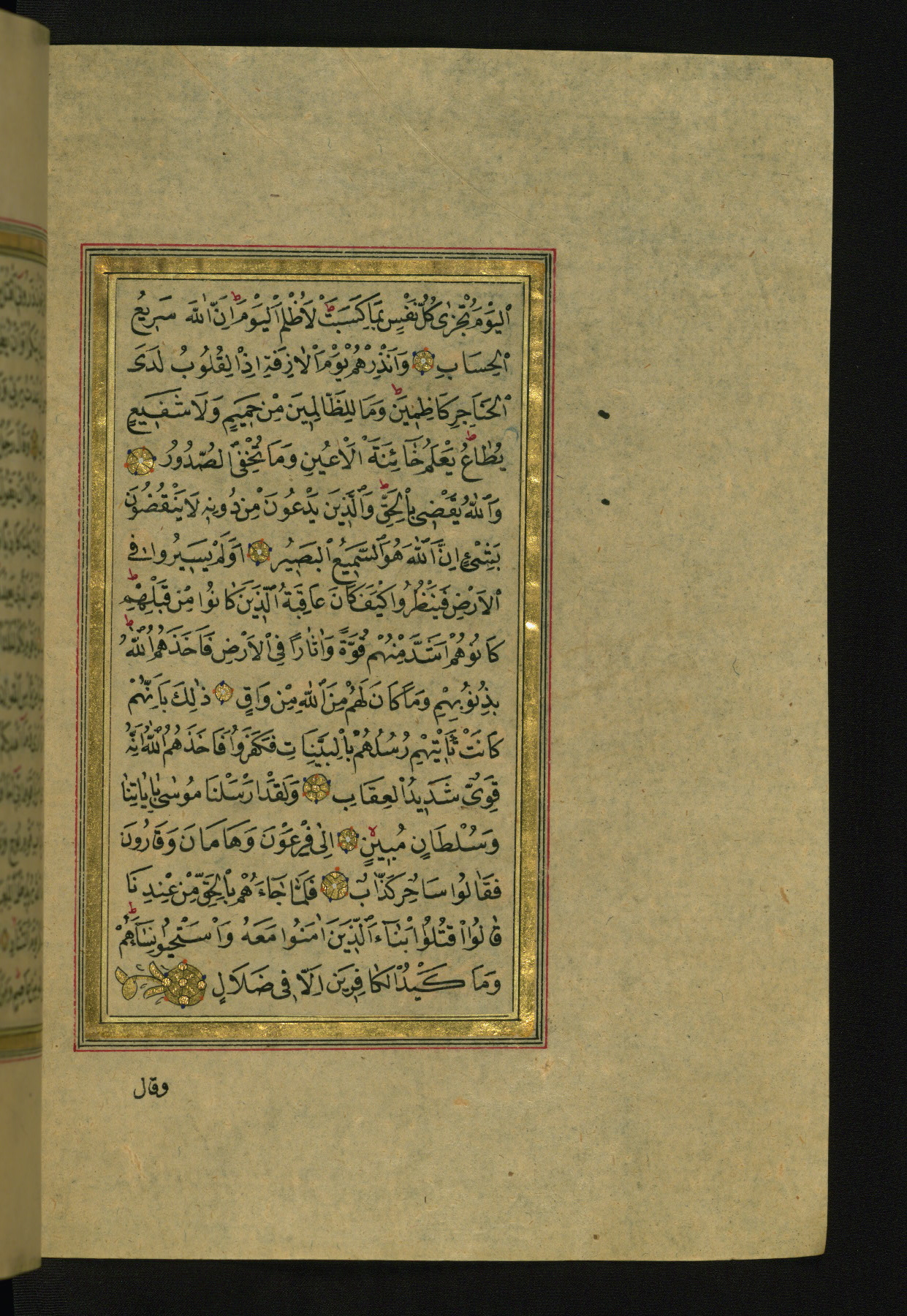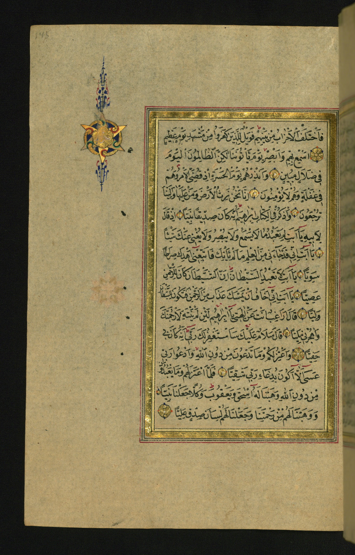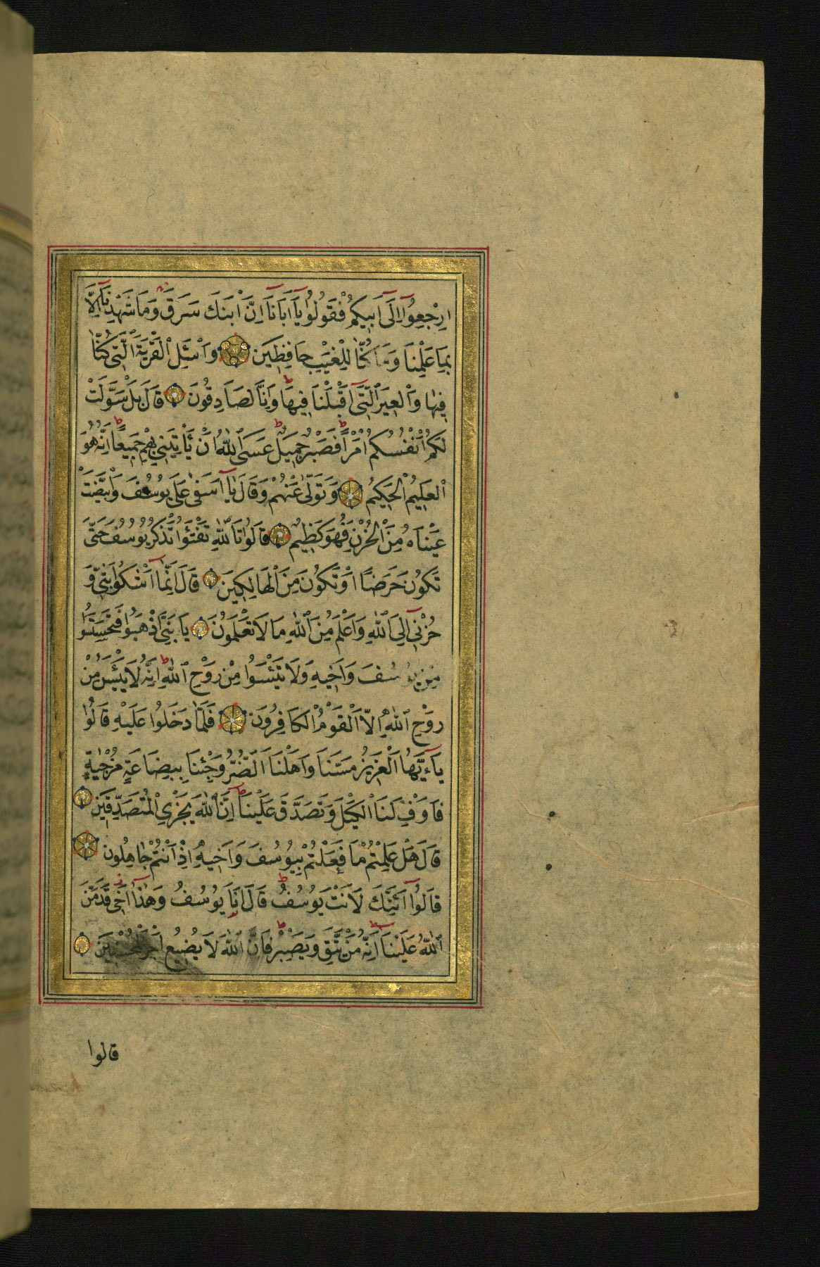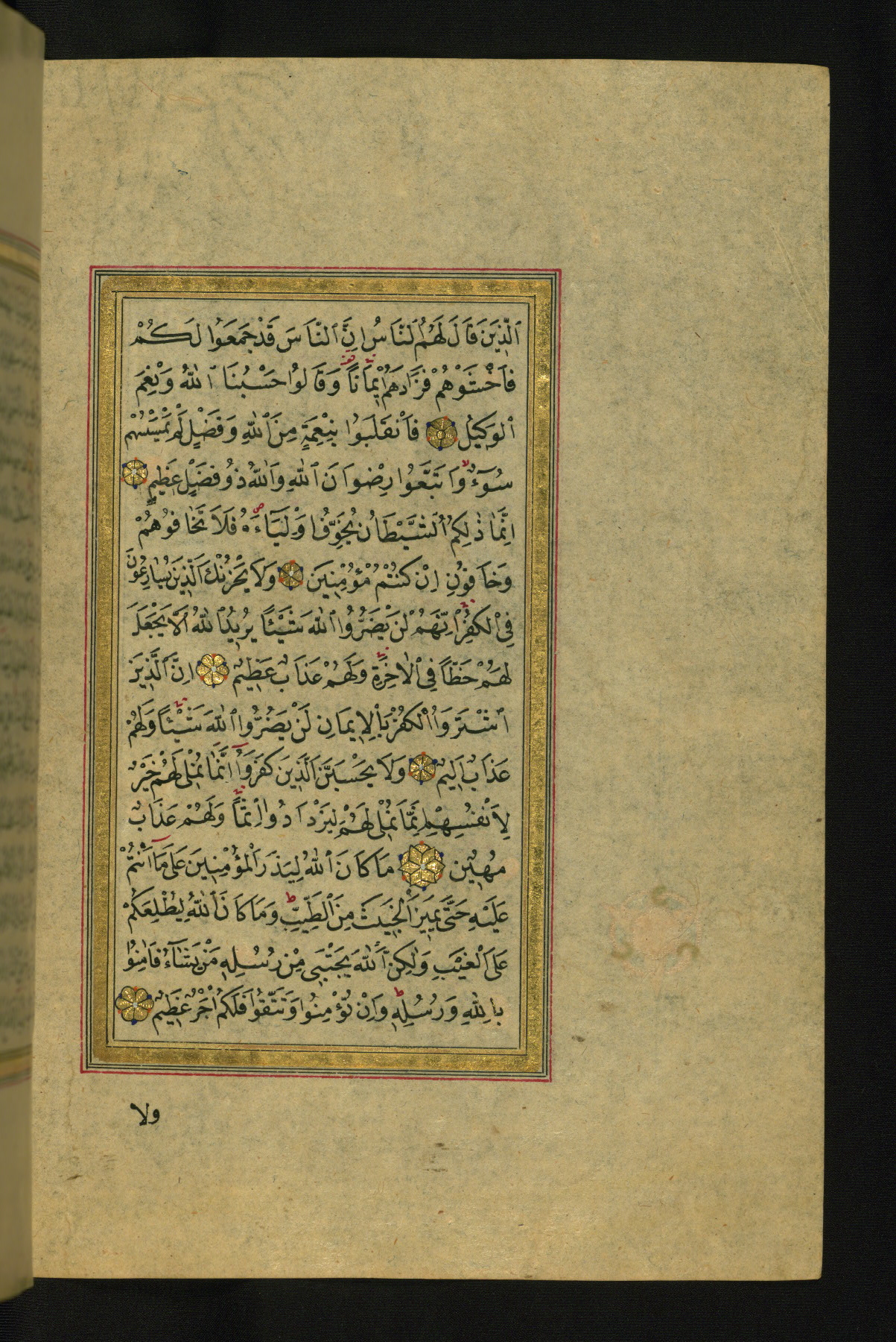 This illuminated copy of the Qur'an was written in naskh script in Istanbul (al-Qusṭanṭinīyah) in 1269 AH / 1853 CE by Muḥammad Ṣāliḥ ibn ʿUmar, a pupil of Amīn al-Bahjat (Behcet). According to the colophon (fol. 257b), the manuscript was finished in Ramaḍān 1269 AH / 1853 CE. The scribe states that he was born in Kūmuljunah (Gümülcine, Komotini in northeastern Greece) and resided in the Madrasat Mulāzimlar, in the vicinity of Ḥammām Sulaymānīyah in al-Qusṭanṭinīyah. The manuscript opens with a double-page illuminated frontispiece of Sūrat al-fātiḥah and the beginning of Sūrat al-baqarah. There are two finispieces: a colophon (misbound at fol. 257b) and a final prayer (fol. 305a). Other illuminated elements include chapter headings and verse markers in the form of illuminated disks and rosettes.