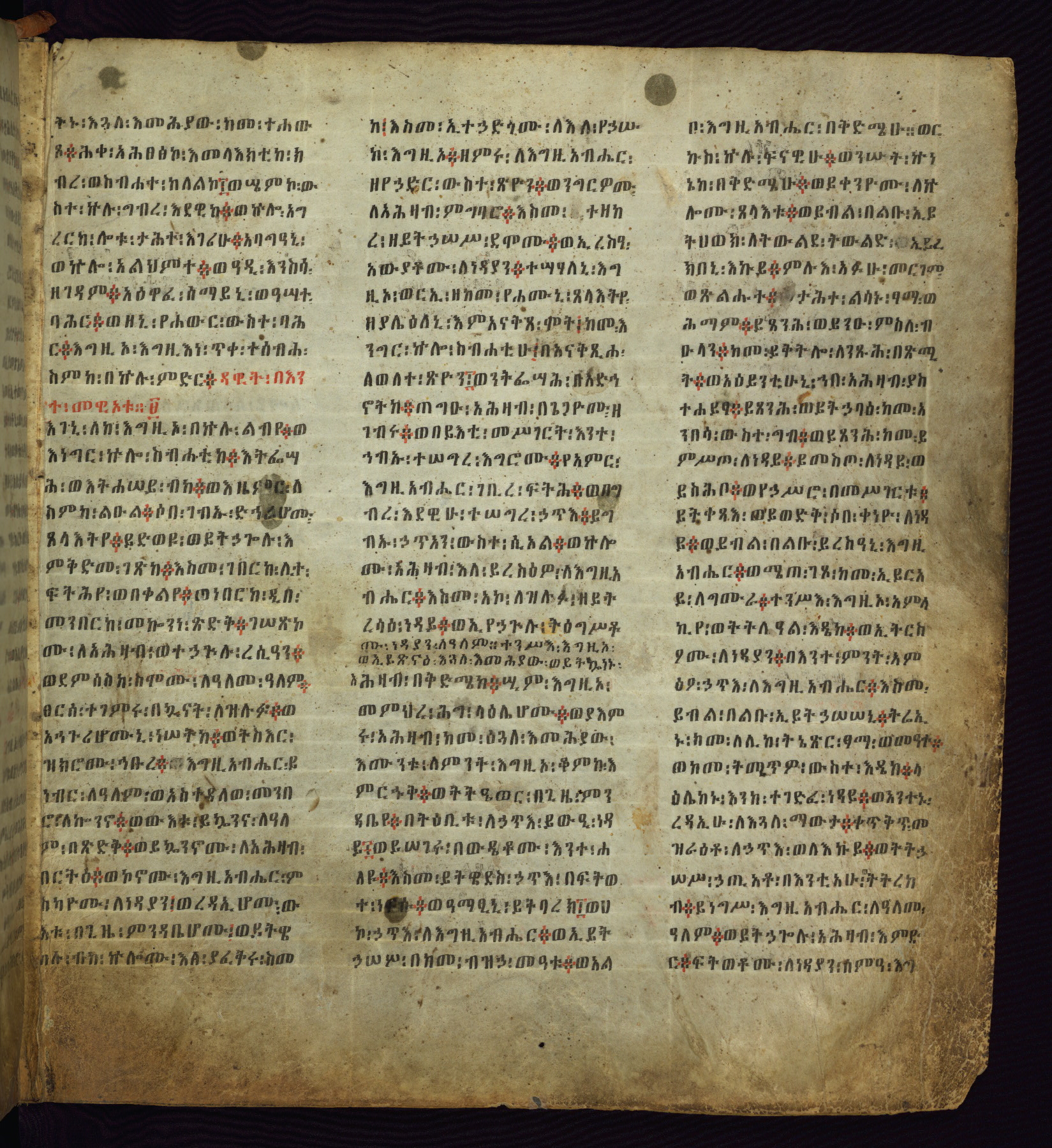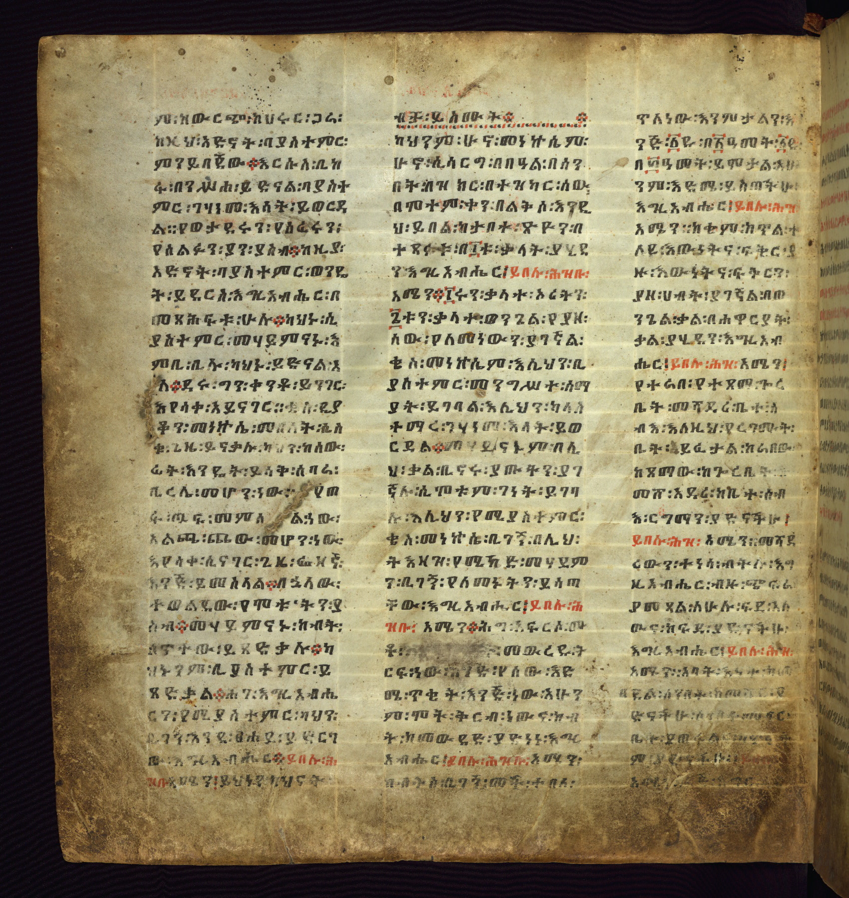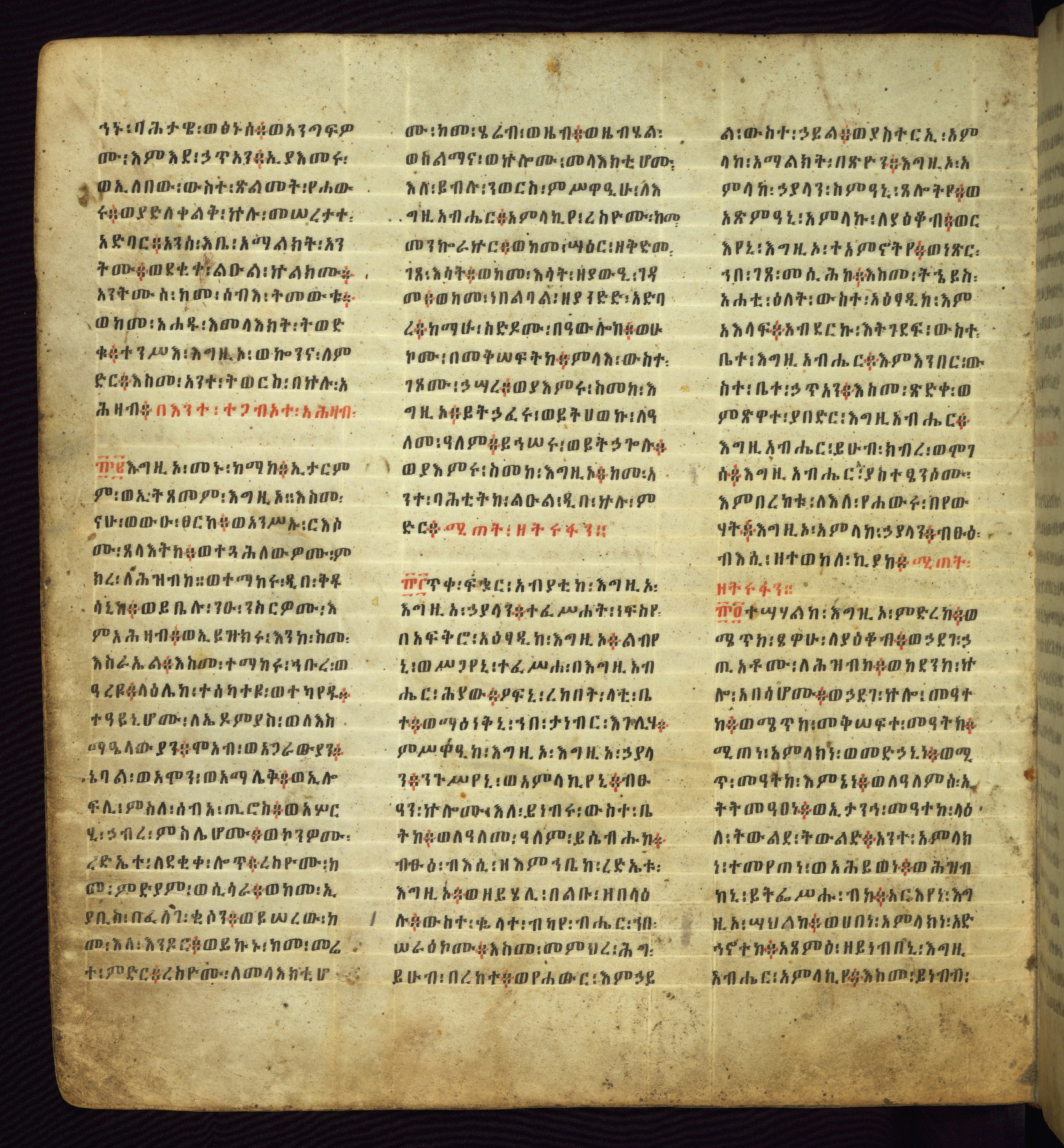 This beautifully copied and bound Ethiopian Psalter likely belonged to one of the princes of the Gonderite royal family, whose reign ended in 1769. The main text of this undecorated manuscript is written in the ecclesiastical language of Gǝ‛ǝz while the minor texts are in Amharic, added at a later time. While the colophon and the hand suggest that the original manuscript only contained the 151 Psalms of David, which is in an early eighteenth-century hand, the other texts such as the fifteen Canticles, Song of Songs, Weddase Maryam (Encomium of Mary) and the Anqasa Berhan (Porch of Light) were added in the nineteenth century to create a more complete Psalter. More unusual texts, unrelated to the Psalter, have also been added, for it begins with a homily admonishing the clergy to conduct themselves well spiritually, and ends with directions for undoing charms. The life of the manuscript can be traced not only in these cumulative texts, but also in added prayers for later owners, of which there are at least twelve appended to the ends of the Biblical texts.