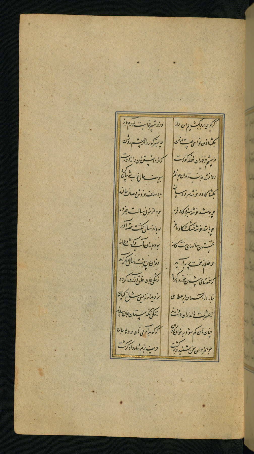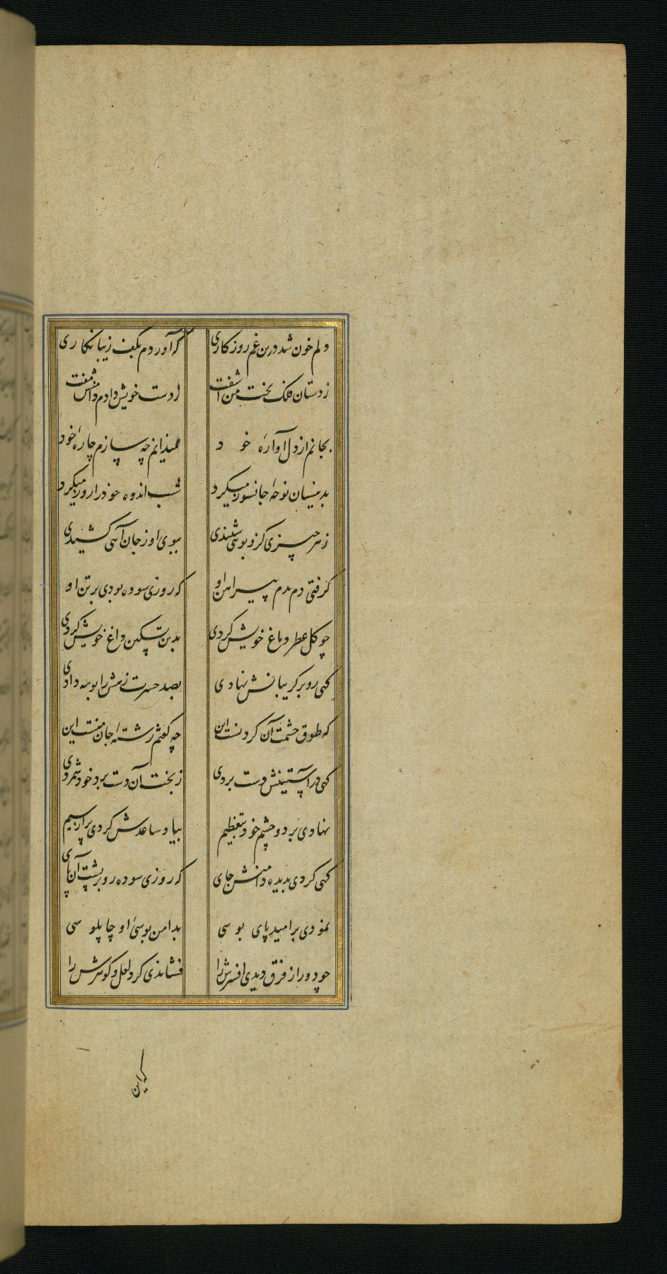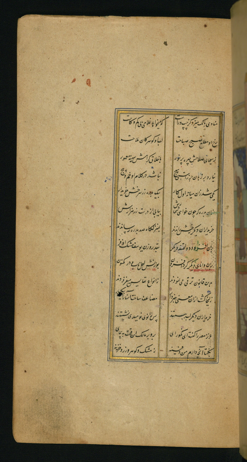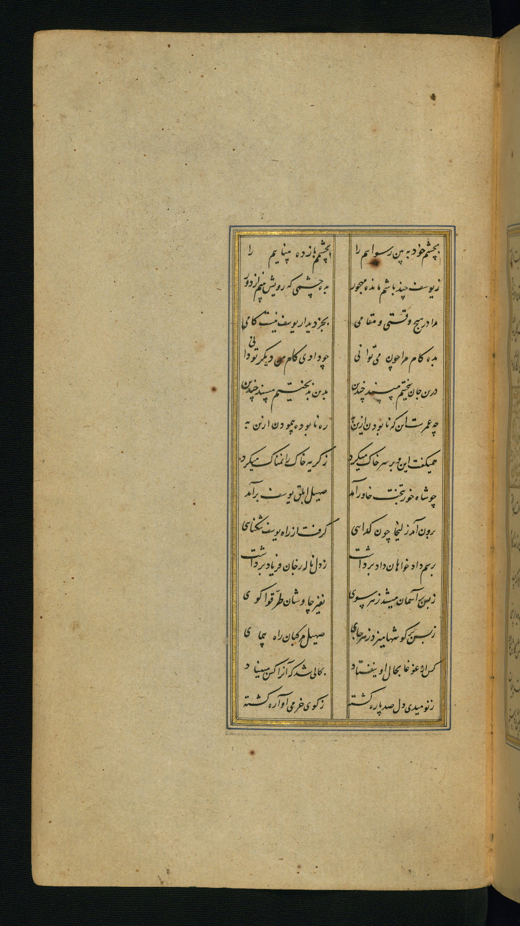 This is an illustrated and illuminated Safavid copy of Joseph (Yūsuf) and Zulaykhā by Nūr al-Dīn Jāmī (d. 898 AH / 1492 CE), executed in Iran in the early tenth century AH / sixteenth CE. The codex opens with a double-page illuminated incipit (fols. 1b-2a) containing the first verses of the work, the title, and the author's name. There are eight paintings illustrating the text. The binding is slightly later than the manuscript.