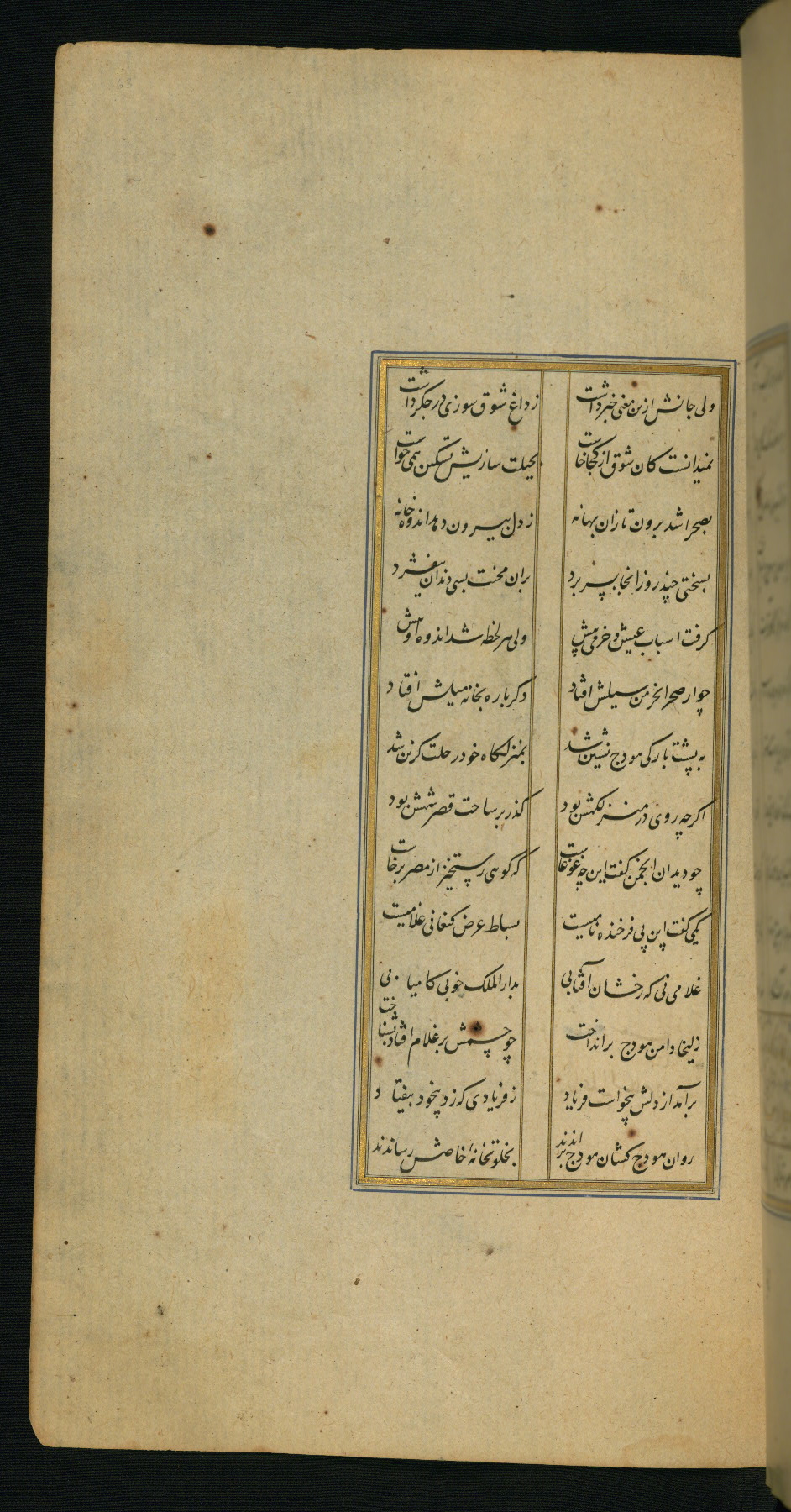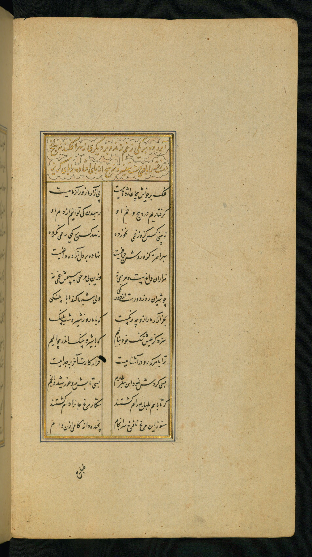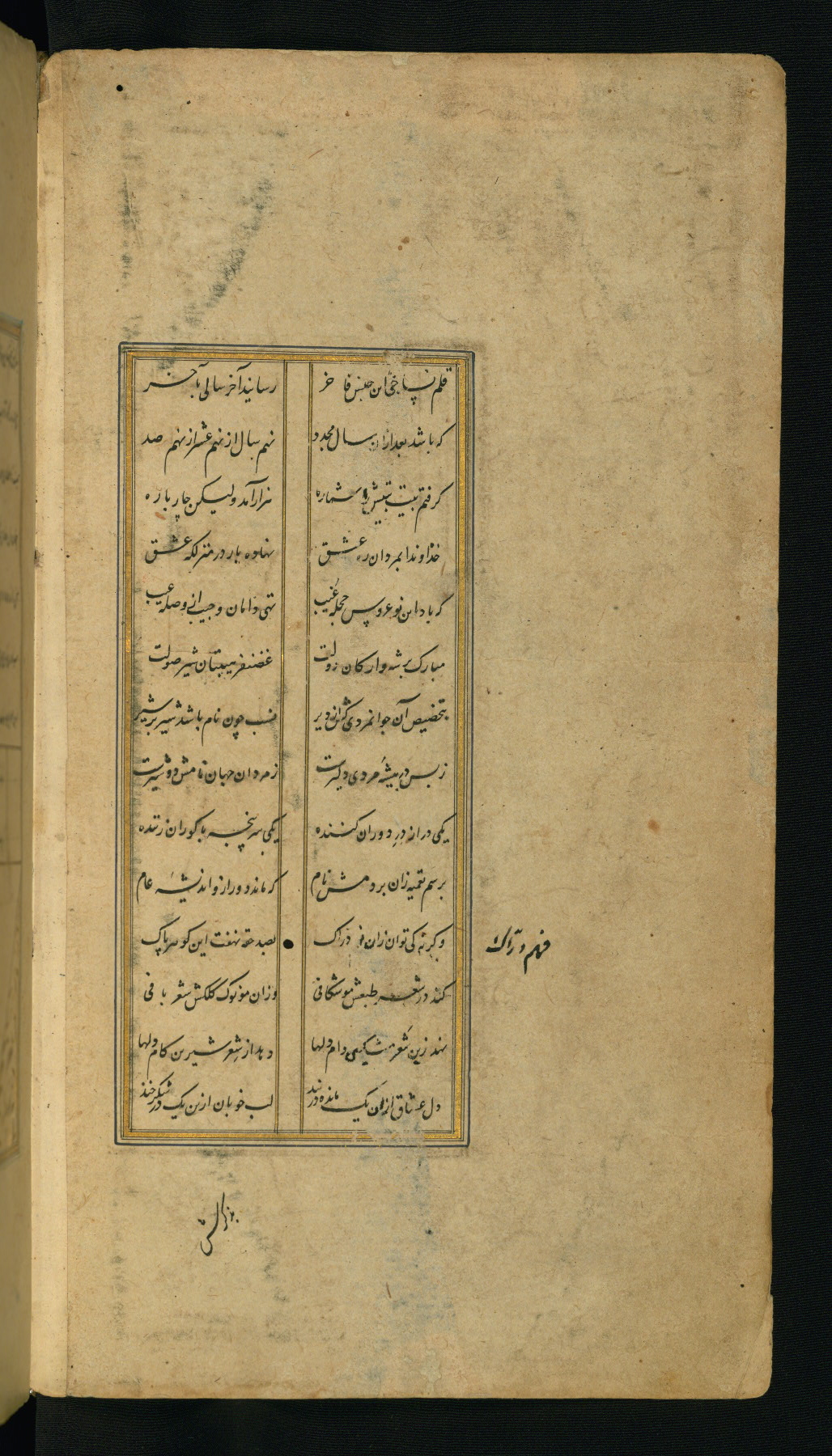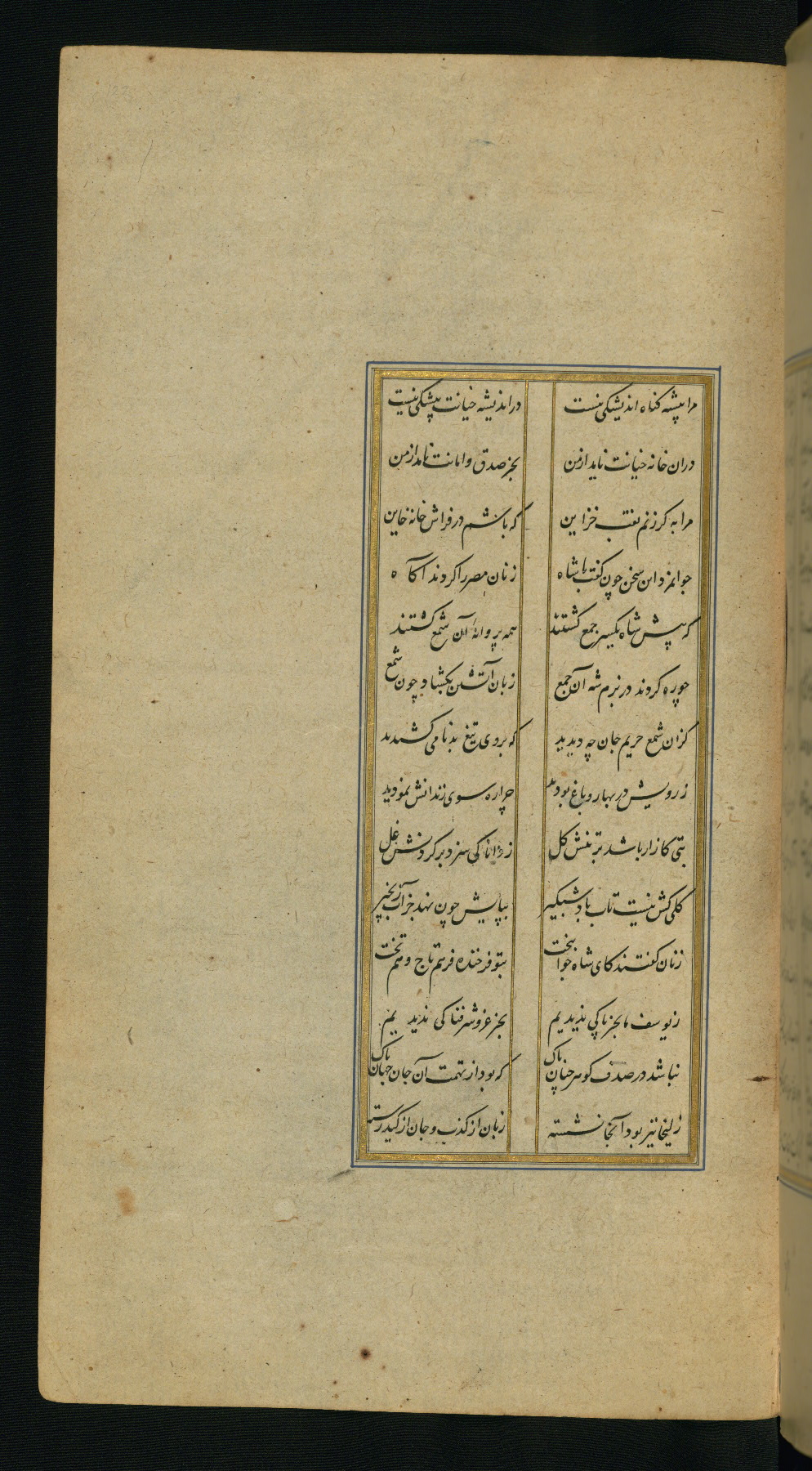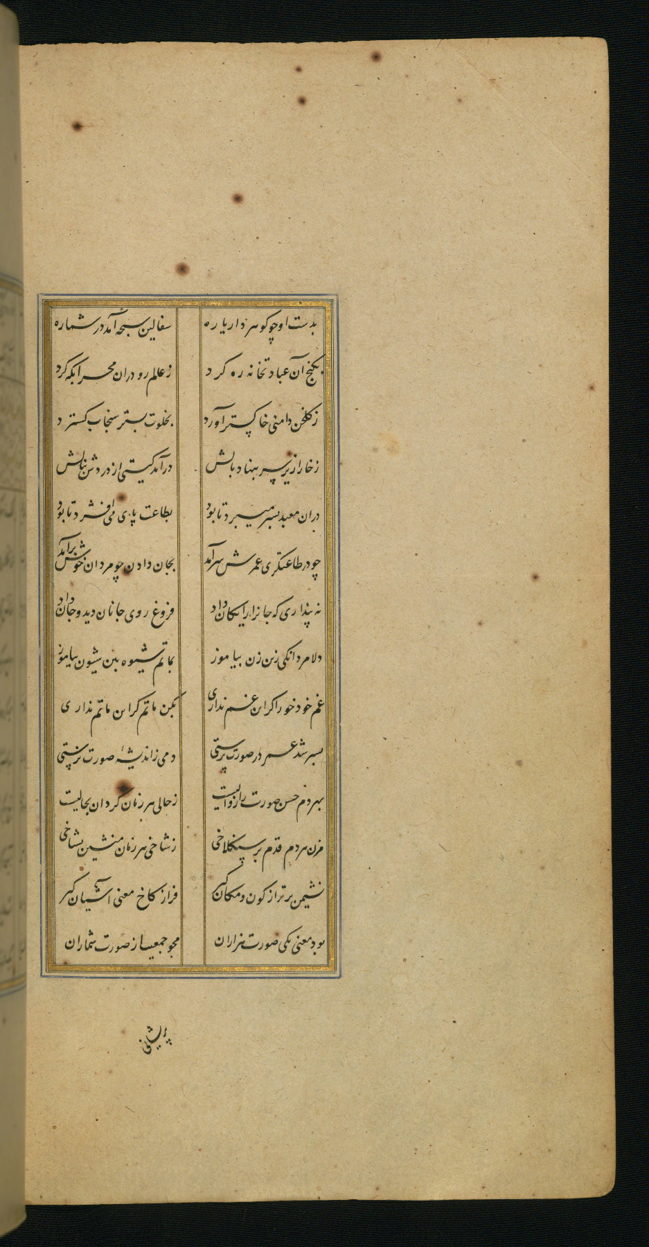 This is an illustrated and illuminated Safavid copy of Joseph (Yūsuf) and Zulaykhā by Nūr al-Dīn Jāmī (d. 898 AH / 1492 CE), executed in Iran in the early tenth century AH / sixteenth CE. The codex opens with a double-page illuminated incipit (fols. 1b-2a) containing the first verses of the work, the title, and the author's name. There are eight paintings illustrating the text. The binding is slightly later than the manuscript.
