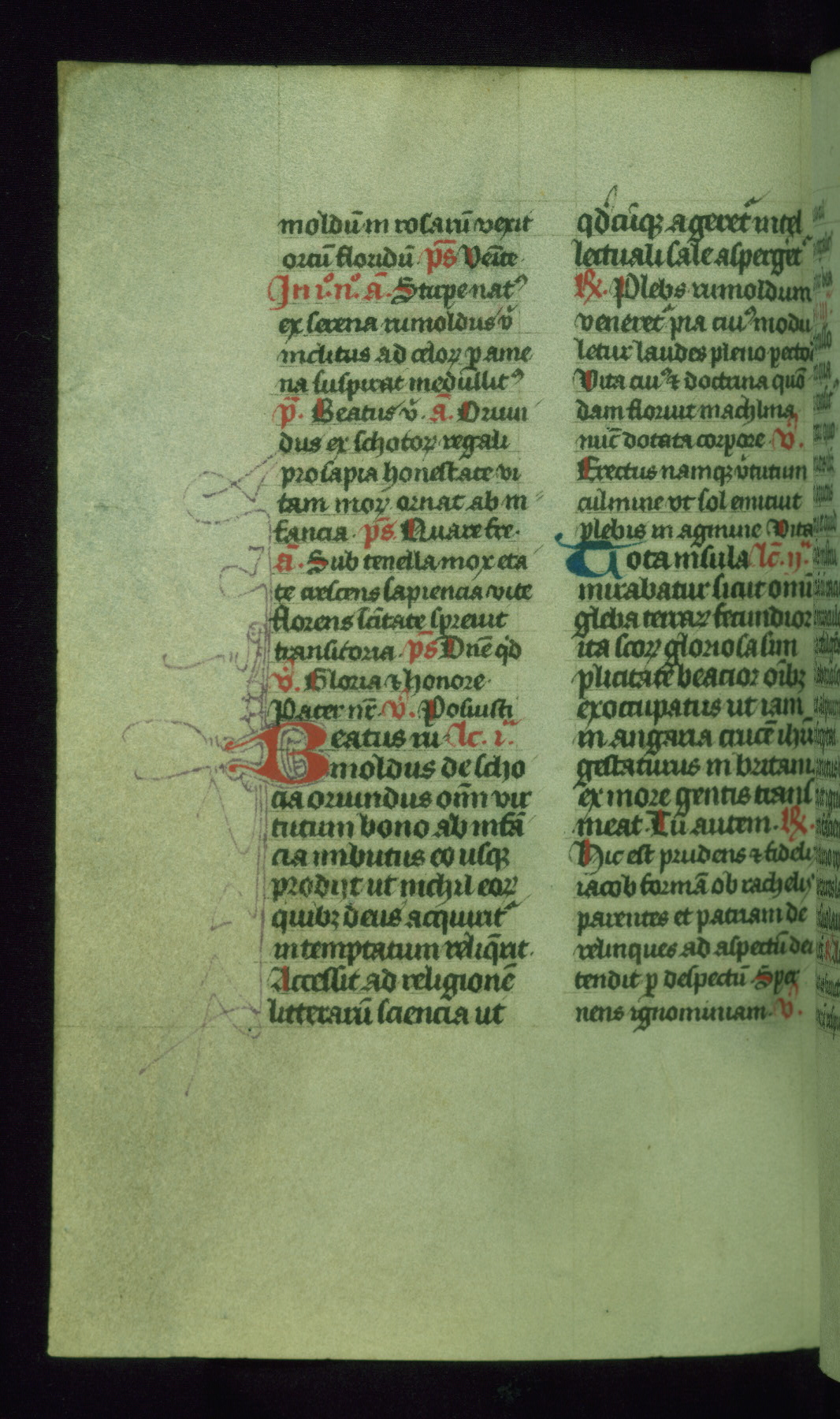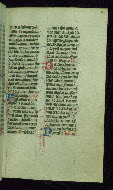 This small breviary, composed of more than 500 folios, is extraordinary for its length, considering it is the summer portion of a two-volume breviary for the use of Liège. The manuscript was completed for ecclesiastical use at the Cathedral of Notre-Dame and St.-Lambert in Liège ca. 1420. This attribution is suggested, for instance, by the petitions to the congregation of this cathedral (fols. 114v-117v), as well as the armorial shield of the family of Surlet de Chokier of Liège represented at the opening of the Psalms. The manuscript has modest, but interesting, decoration with historiated and decorated initials marking the liturgical texts, and occasional angels playing instruments in the margins. The most notable pictorial effect is found in the initials inhabited by transparent figures on rich blue ground. The technique is found, for instance, on fol. 156r with the gold monstrance held by translucent angels for the feast of the Corpus Christi.