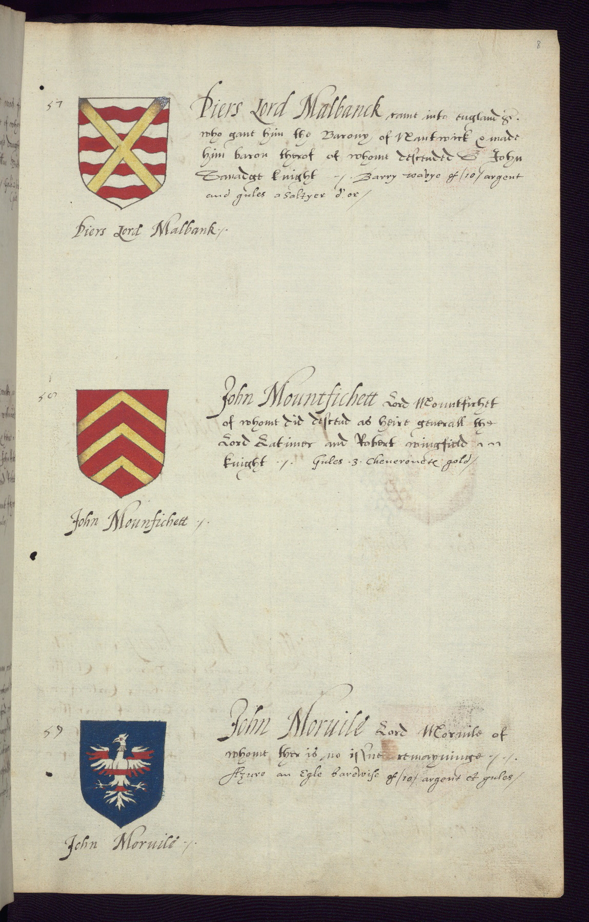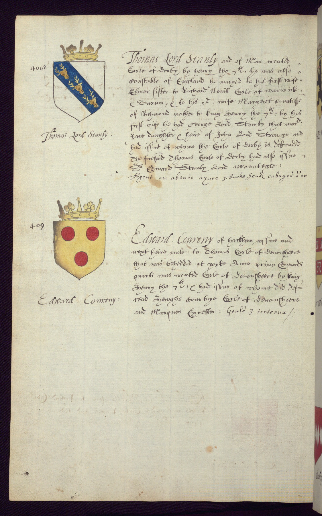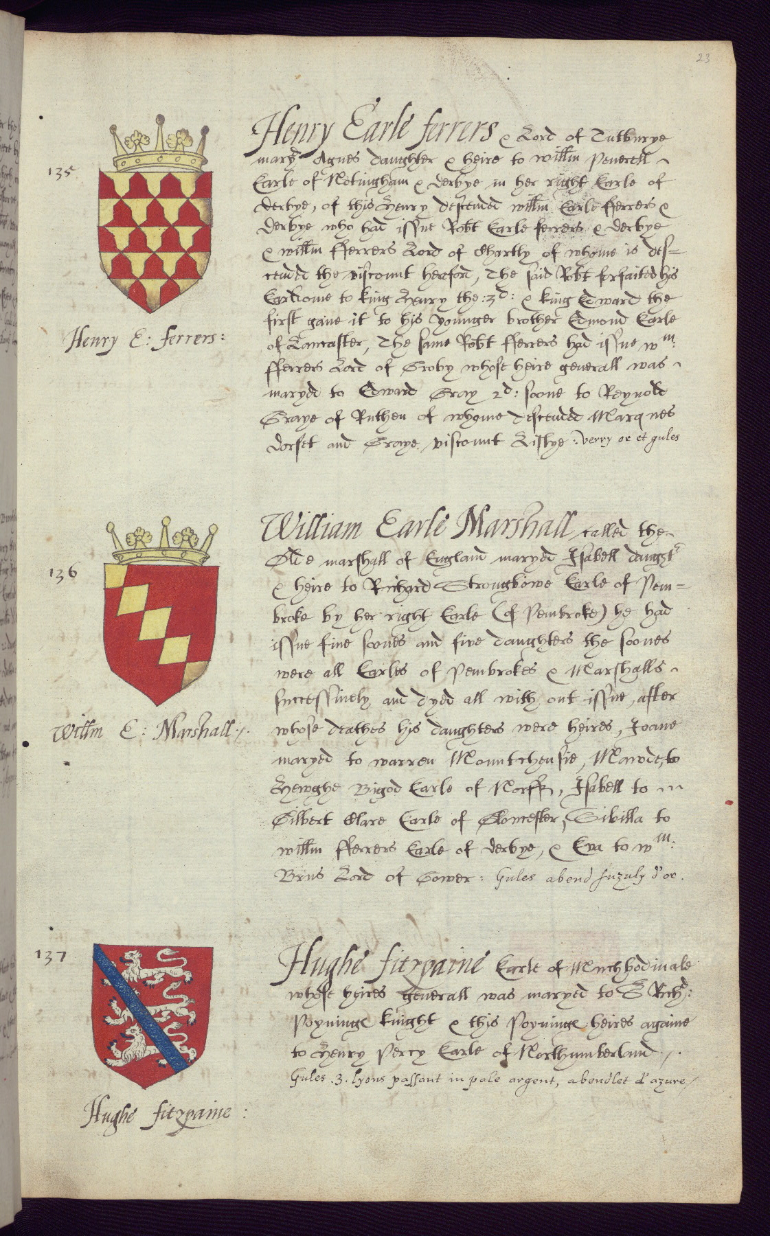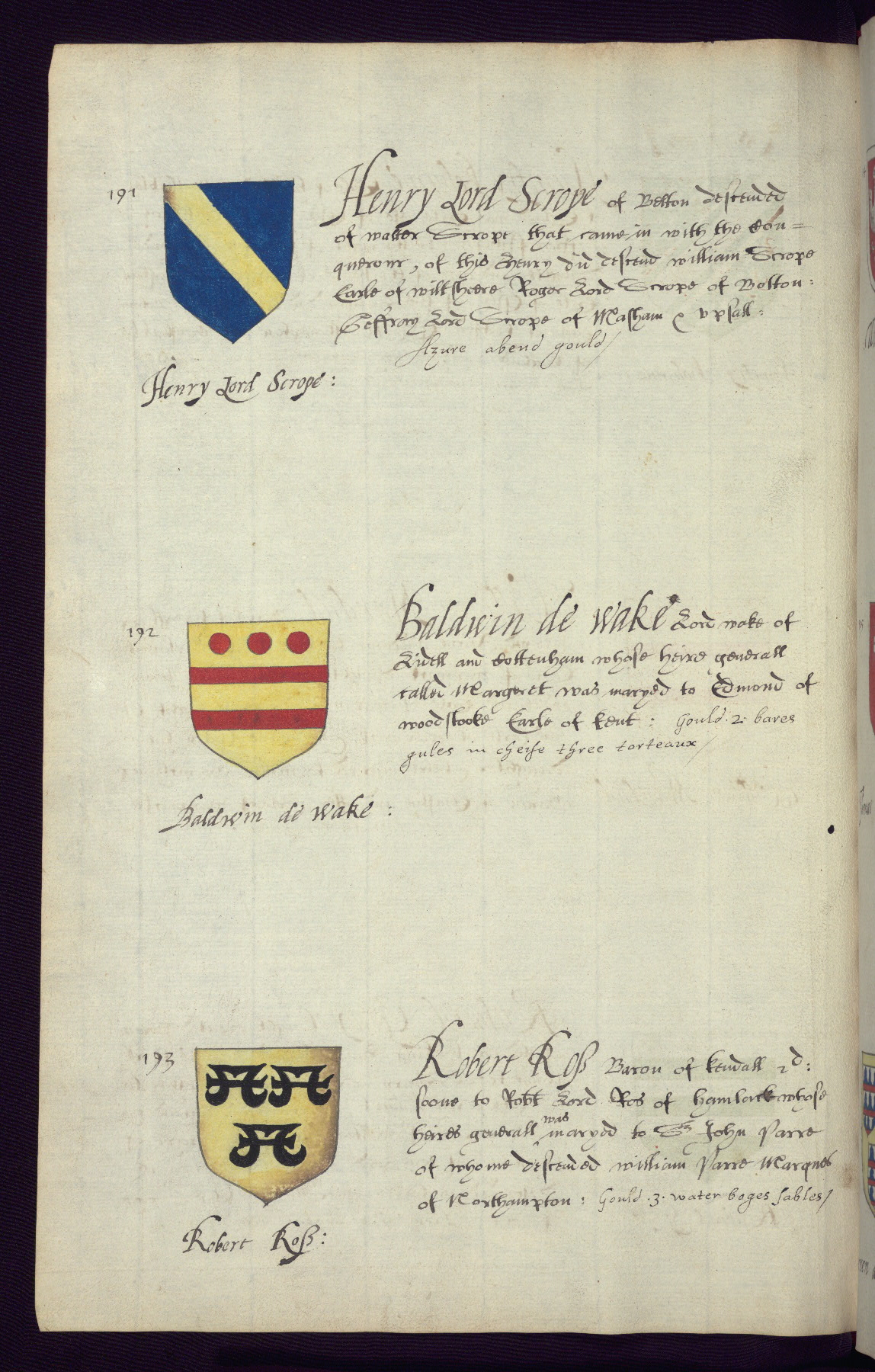 This book of English heraldry was completed ca. 1589. The manuscript belonged to the Spencer family, as known through inscriptions on the first few flyleaves, including the motto "Dieu defende Le Droit" (God defends the right). This motto has long been associated with the Spencer family of England, which is the family line of Princess Diana, as well as the Spencers who were among the founders of Virginia. The Spencer family's heraldry is included in the manuscript, along with the coats of arms of numerous prominent British families, including the Hasting, Gray, Beuford, and Percye families. A similar book of English heraldry in the British Library, Stowe MS 693, was also completed at the end of the sixteenth century.