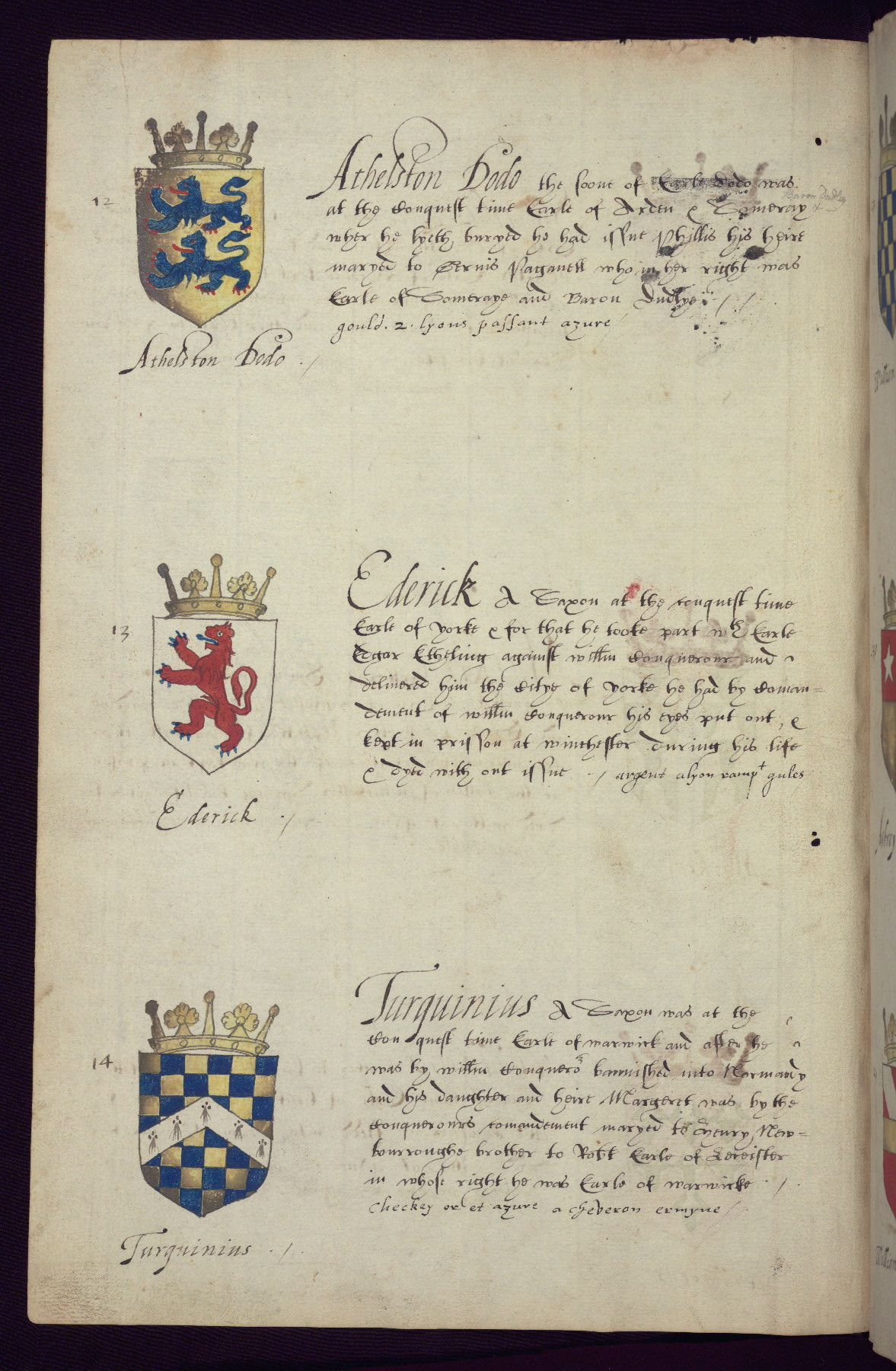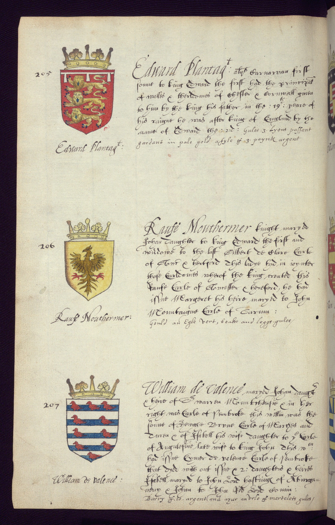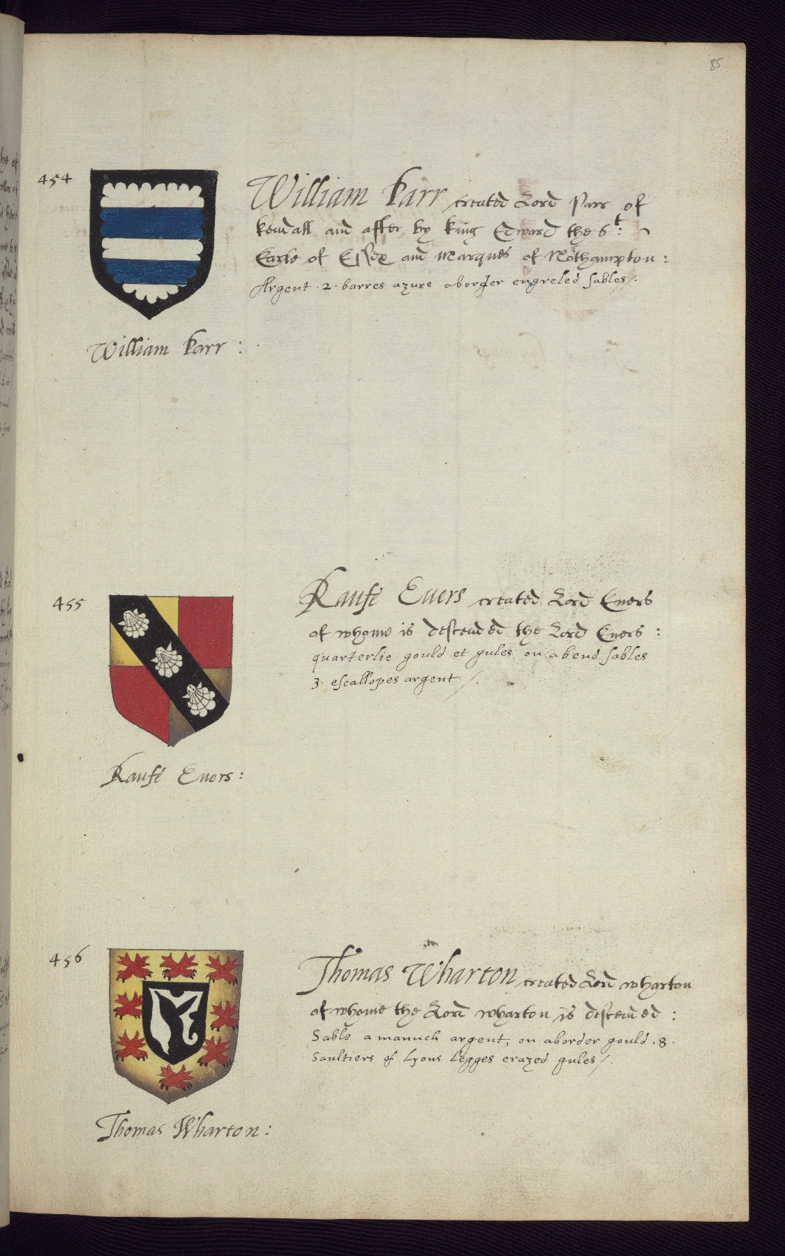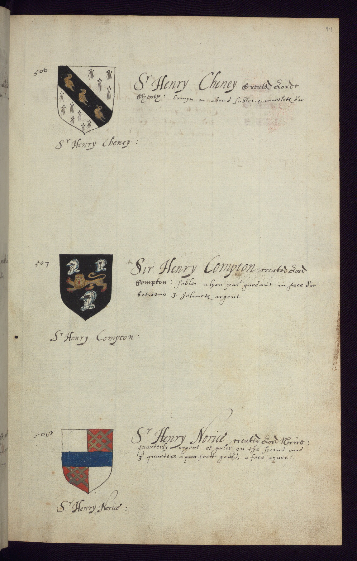 This book of English heraldry was completed ca. 1589. The manuscript belonged to the Spencer family, as known through inscriptions on the first few flyleaves, including the motto "Dieu defende Le Droit" (God defends the right). This motto has long been associated with the Spencer family of England, which is the family line of Princess Diana, as well as the Spencers who were among the founders of Virginia. The Spencer family's heraldry is included in the manuscript, along with the coats of arms of numerous prominent British families, including the Hasting, Gray, Beuford, and Percye families. A similar book of English heraldry in the British Library, Stowe MS 693, was also completed at the end of the sixteenth century.
