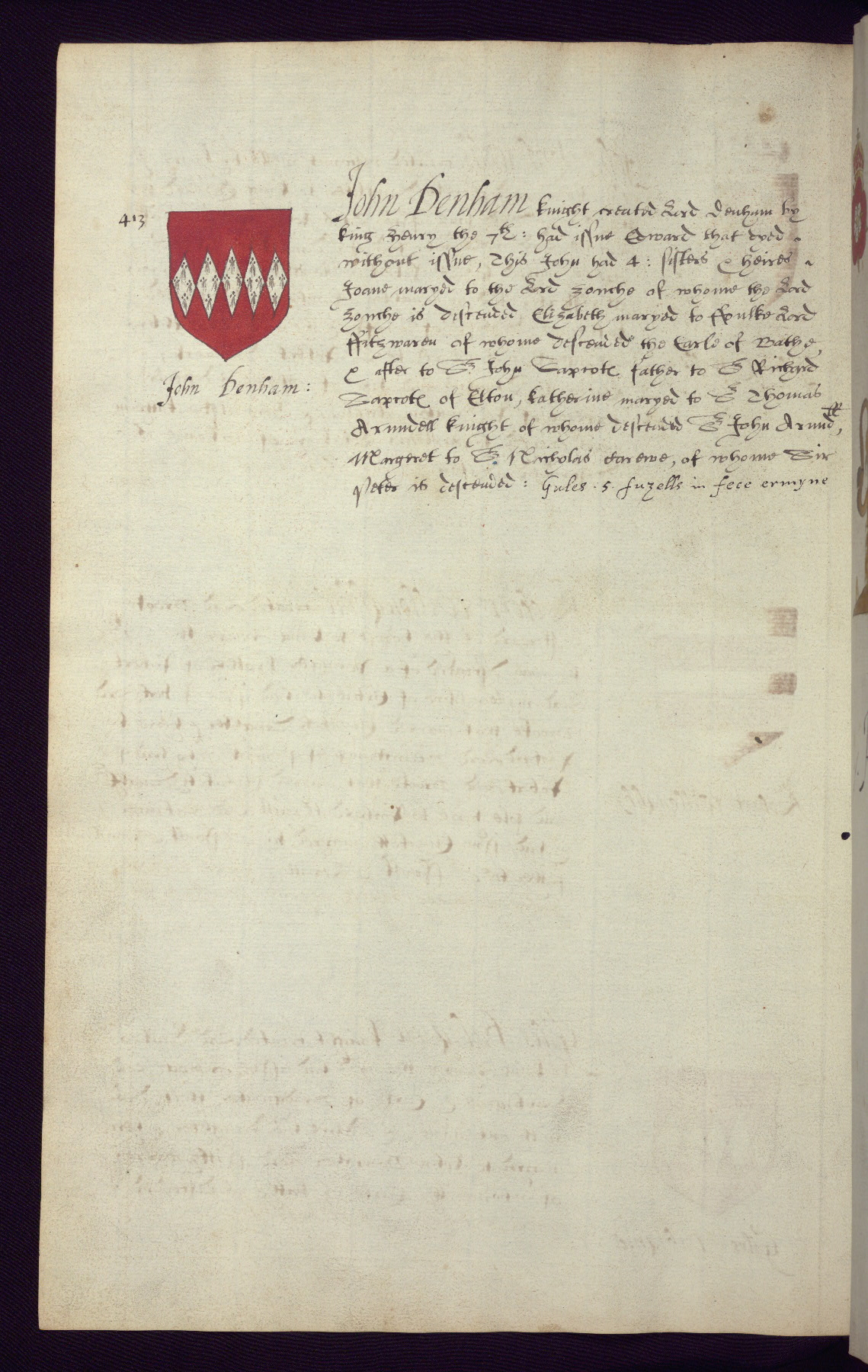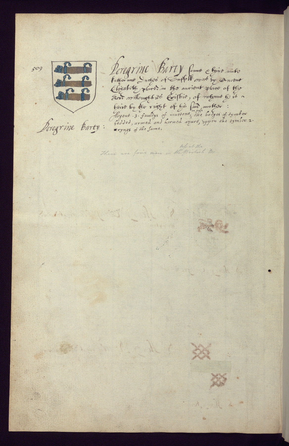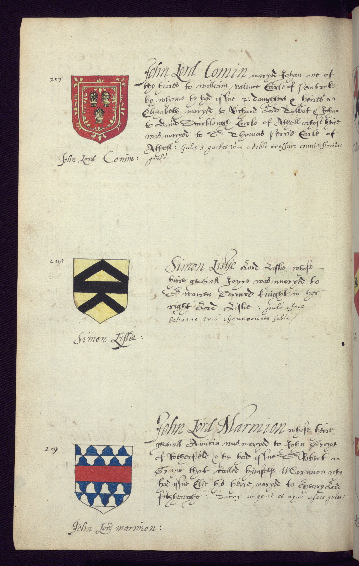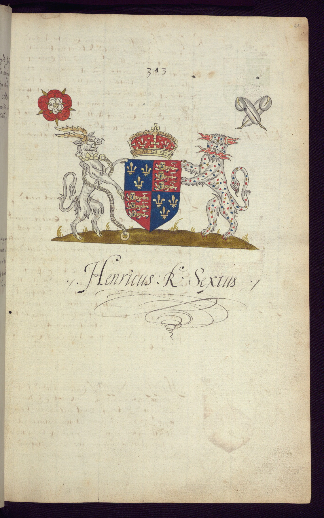 This book of English heraldry was completed ca. 1589. The manuscript belonged to the Spencer family, as known through inscriptions on the first few flyleaves, including the motto "Dieu defende Le Droit" (God defends the right). This motto has long been associated with the Spencer family of England, which is the family line of Princess Diana, as well as the Spencers who were among the founders of Virginia. The Spencer family's heraldry is included in the manuscript, along with the coats of arms of numerous prominent British families, including the Hasting, Gray, Beuford, and Percye families. A similar book of English heraldry in the British Library, Stowe MS 693, was also completed at the end of the sixteenth century.