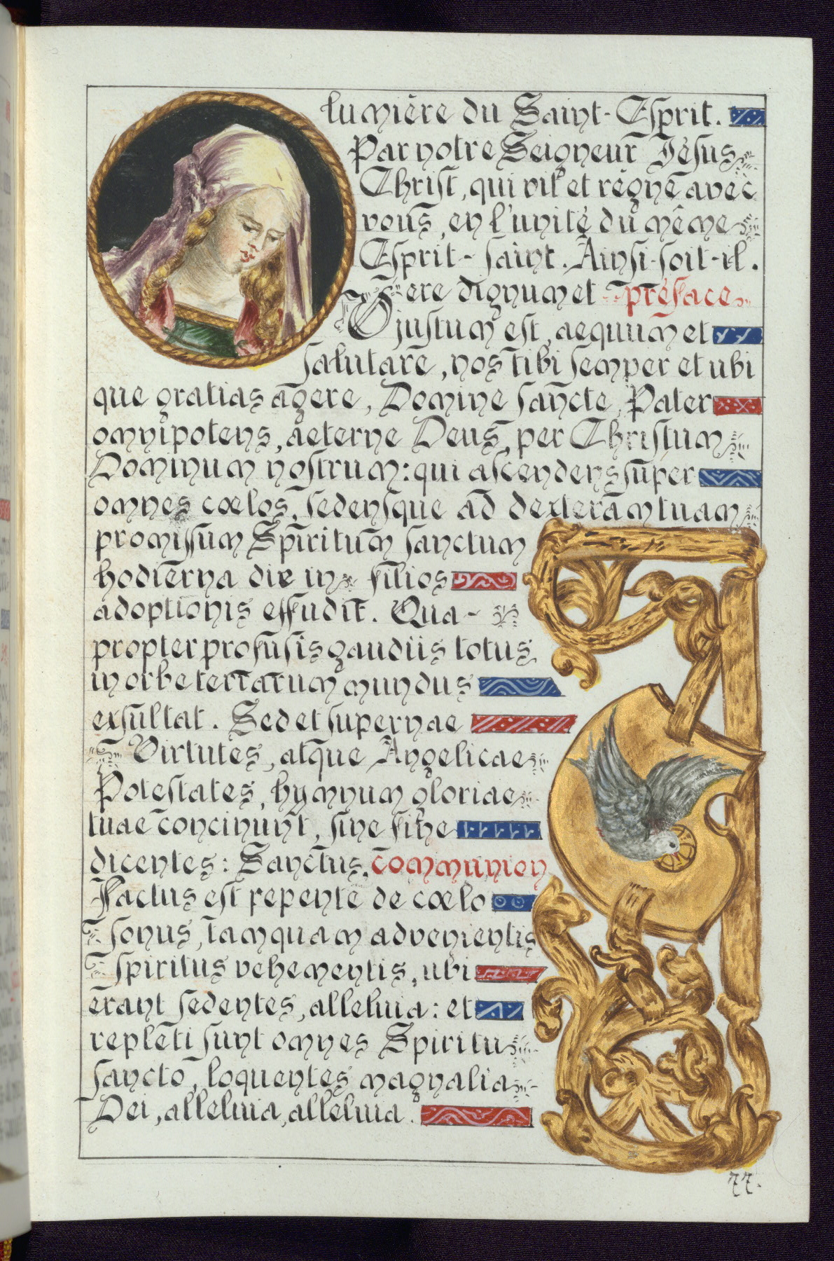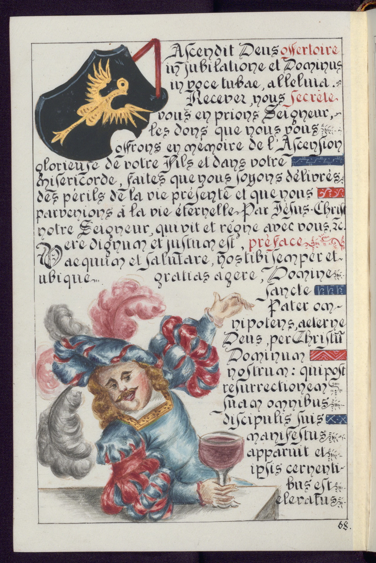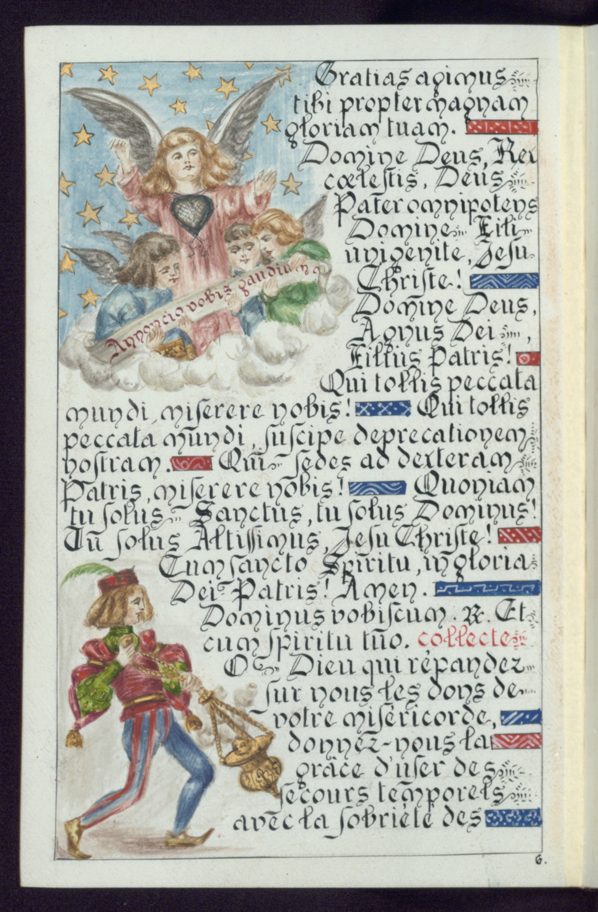 Clothilde Coulaux, a young French woman living in German-occupied Alsace, created this manuscript in 1906, as described in a colophon accompanying her charming self-portrait on p. 173. All 174 pages are illuminated with a rich variety of imagery, including scenes of everyday life, music, feasting, courtship and child rearing, warfare, and regional architecture, combined with more traditional religious imagery. The latter often draw upon prints by Albrecht Dürer, Hans Holbein, and other early masters, as well as stained glass, sculpture, and liturgical instruments. Much of the other imagery, however, is uniquely her own. Paintings of her cat looking out a window, or of couples drinking together, add touches of whimsy and humor. Other images are more sobering, such as those of Habsburg eagles and Joan of Arc, and taken together with her choice to write in French while under German rule, suggest a struggle to define her national identity.