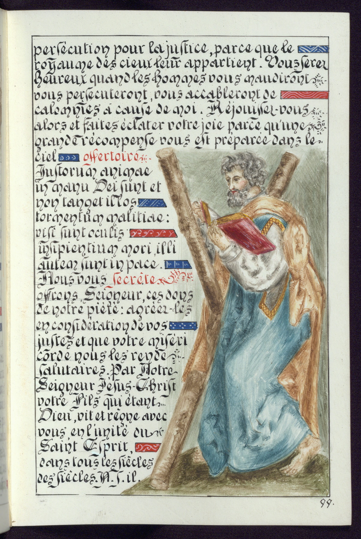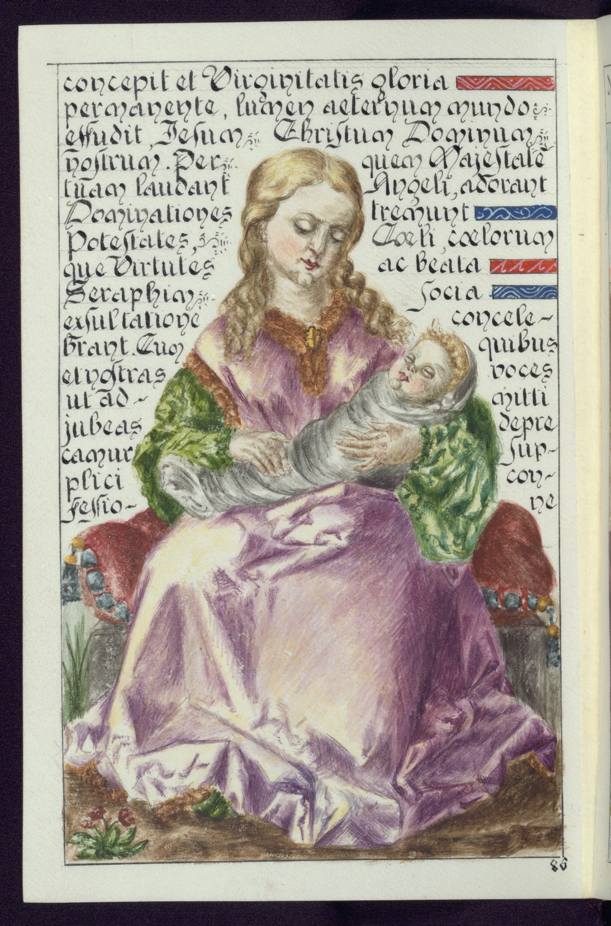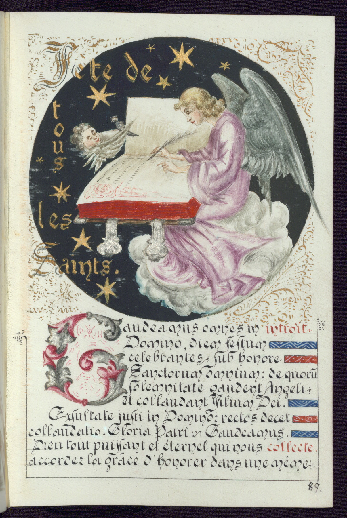 Clothilde Coulaux, a young French woman living in German-occupied Alsace, created this manuscript in 1906, as described in a colophon accompanying her charming self-portrait on p. 173. All 174 pages are illuminated with a rich variety of imagery, including scenes of everyday life, music, feasting, courtship and child rearing, warfare, and regional architecture, combined with more traditional religious imagery. The latter often draw upon prints by Albrecht Dürer, Hans Holbein, and other early masters, as well as stained glass, sculpture, and liturgical instruments. Much of the other imagery, however, is uniquely her own. Paintings of her cat looking out a window, or of couples drinking together, add touches of whimsy and humor. Other images are more sobering, such as those of Habsburg eagles and Joan of Arc, and taken together with her choice to write in French while under German rule, suggest a struggle to define her national identity.